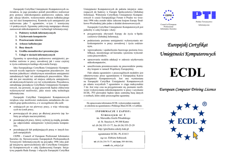 Europejski Certyfikat Umiejętności Komputerowych zaświadcza, że jego posiadacz potrafi prawidłowo realizować przy pomocy mikrokomputera podstawowe zadania, takie jak: edycja tekstów, wykorzystanie arkusza kalkulacyjnego czy też sieci komputerowej. Kontrola tych umiejętności jest realizowana jako 7 egzaminów, w tym 1 teoretyczny i 6 praktycznych. Egzaminy pokrywają następujące obszary zastosowań mikrokomputerów i technologii informatycznej: 1. Podstawy technik informatycznych Umiejętności Komputerowych do pakietu inicjatyw zmierzających do budowy w Europie Społeczeństwa Globalnej Informacji. Wdrożenie Certyfikatu Umiejętności Komputerowych w czasie Europejskiego Forum w Pradze we wrześniu 1996 roku zostało także zalecone krajom Europy Środkowo-Wschodniej jako jedno z działań dostosowawczych. Europejski Certyfikat Umiejętności Komputerowych jest jednolity w całej Europie i służy: 6. Grafika menadżerska i prezentacyjna 7. Usługi w sieciach informatycznych Egzaminy te sprawdzają podstawowe umiejętności, potrzebne zarówno w pracy zawodowej jak i coraz częściej w życiu codziennym każdego obywatela Europy. Idea Europejskiego Certyfikatu Umiejętności Komputerowych wyszła naprzeciw wymaganiom pracodawców. Jest bowiem jednolitym i obiektywnym miernikiem umiejętności zatrudnionych bądź też zatrudnianych pracowników. Miernik ten jest niezależny od miejsca zdobycia umiejętności, od ukończonych kursów czy też wykształcenia. Pracodawca, zatrudniając posiadacza Certyfikatu Umiejętności Komputerowych, ma pewność, że jego pracownik będzie efektywnie wykorzystywał możliwości, jakie niesie sobą technologia informatyczna. Europejski Certyfikat Umiejętności Komputerowych zwiększa więc możliwości znalezienia zatrudnienia dla szerokich grup społeczeństwa, a w szczególności dla osób: • szukających po raz pierwszy pracy, a więc wkraczających na rynek pracy, • powracających do pracy po dłuższej przerwie (np. kobiety po urlopie macierzyńskim), • poszukujących pracy, którzy szybciej ją znajdą, posiadając odpowiednie umiejętności wykorzystania komputerów, • poszukujących lub podejmujących pracę w innych krajach europejskich. CEPIS - Council of European Profesional Informatics Societies (tj. Stowarzyszenie Europejskich Profesjonalnych Towarzystw Informatycznych) na początku 1996 roku podjął inicjatywę upowszechnienia idei Certyfikatu Umiejętności Komputerowych w całej Zjednoczonej Europie. Inicjatywę poparła Rada Europy i włączyła Europejski Certyfikat Informatyczne przygotowaniu obywateli Europy do życia w Społeczeństwie Globalnej Informacji, • podniesieniu poziomu umiejętności wykorzystania mikrokomputerów w pracy zawodowej i życiu codziennym, Europejski Certyfikat • wprowadzeniu i ujednoliceniu bazowego poziomu kwalifikacji, niezależnego od kierunku i poziomu wykształcenia pracowników, Umiejętności Komputerowych • opracowaniu modelu edukacji w zakresie użytkowania mikrokomputerów, • umożliwieniu przemieszczania się pracowników pomiędzy krajami w ramach Wspólnoty Europejskiej. 4. Arkusze kalkulacyjne 5. Bazy danych Polskie Towarzystwo Council of European Professional Informatics Societies • 2. Użytkowanie komputerów 3. Przetwarzanie tekstów CEPIS Fakt zdania egzaminów z poszczególnych modułów jest odnotowywany przez egzaminatora w Europejskiej Karcie Umiejętności Komputerowych. Jest ona wymieniana na Europejski Certyfikat Umiejętności Komputerowych po zdaniu wszystkich 7 egzaminów w ciągu maksymalnie 3 lat. Jest więc czas na przygotowanie się, poznanie możliwości wykorzystania mikrokomputerów w pracy i uzyskanie ECDL. PTI prowadzić będzie także centralną bazę danych o osobach, które zdały poszczególne egzaminy. Do opracowania informatora ECDL wykorzystałam materiały ze szkolenia na egzaminatora z Polskiego Biura ECDL w Lublinie. INFORMACJE I ZAPISY: Gimnazjum nr 2 im. Marszałka Józefa Piłsudskiego ul. St. Staszica 6, 99-300 Kutno tel. (0-24) 355-15-77, fax (0-24) 355-25-29 http://gim2kutno.szkoly.lodz.pl egzaminator ECDL: PL-E1613 mgr inż. Elżbieta Sobieszek tel. (0-24) 254-75-77, tel. kom. 509 404 866, e-mail: [email protected] ECDL European Computer Driving Licence Zasady ogólne egzaminu: 9 9 9 9 9 9 9 9 9 9 9 9 9 9 zgłaszasz się na tydzień przed planowanym egzaminem do egzaminatora i proponujesz termin oraz numer modułu do zdania, przed pierwszym egzaminem wypełniasz kartę rejestracji i otrzymujesz EKUK (po okazaniu wpłaty), na każdy egzamin przychodzisz z kartą EKUK i poświadczeniem wpłaty za egzamin, losujesz numer zestawu pytań, zostaje wyznaczone miejsce zdawania egzaminu, uzgadniasz z egzaminatorem, gdzie są pliki potrzebne do egzaminu i gdzie zapiszesz swoje prace, egzamin trwa 45 minut od chwili zajęcia stanowiska z zestawem pytań, nie możesz korzystać z żadnych pomocy (za wyjątkiem pomocy proponowanej przez programy), po skończonym egzaminie oddajesz zestaw pytań, odpowiedzi i dyskietkę, egzamin zaliczysz, zdobywając co najmniej 75 % punktów możliwych do zdobycia, jeżeli zdasz egzamin, to otrzymujesz kartę EKUK z potwierdzeniem zdanego modułu, jeżeli nie zdasz egzaminu, to otrzymujesz kartę EKUK bez potwierdzenia zdanego modułu, niezdany moduł możesz zdawać powtórnie, wykorzystując inny zestaw pytań i wnosząc kolejną opłatę, po zdaniu 7 egzaminów pomyślnie płacisz za kartę ECDL, przynosisz potwierdzenie wpłaty i kartę EKUK do egzaminatora lub osobiście wysyłasz do Polskiego Biura ECDL. Ocena Do zdania egzaminu niezbędne jest uzyskanie 24 punktów na 32 możliwe (tj. udzielenie min. 75 % poprawnych odpowiedzi). Dopuszczalny czas trwania egzaminu - 45 minut. Odpowiedzi są oddawane na dyskietkach. Wszystkie dokumenty muszą być oddane egzaminatorowi. Moduł 3 Przetwarzanie tekstów Cele: Moduł ten sprawdza umiejętność przetwarzania tekstu. Jest przeznaczony do oceny umiej