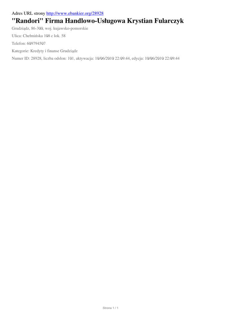Adres URL strony http://www.ebankier.org/28928 "Randori" Firma Handlowo-Usługowa Krystian Fularczyk Grudziądz, 86-300, woj. kujawsko-pomorskie Ulica: Chełmińska 108 c lok. 58 Telefon: 609794507 Kategorie: Kredyty i finanse Grudziądz Numer ID: 28928, liczba odsłon: 101, aktywacja: 10/06/2010 22:09:44, edycja: 10/06/2010 22:09:44 Strona 1 / 1