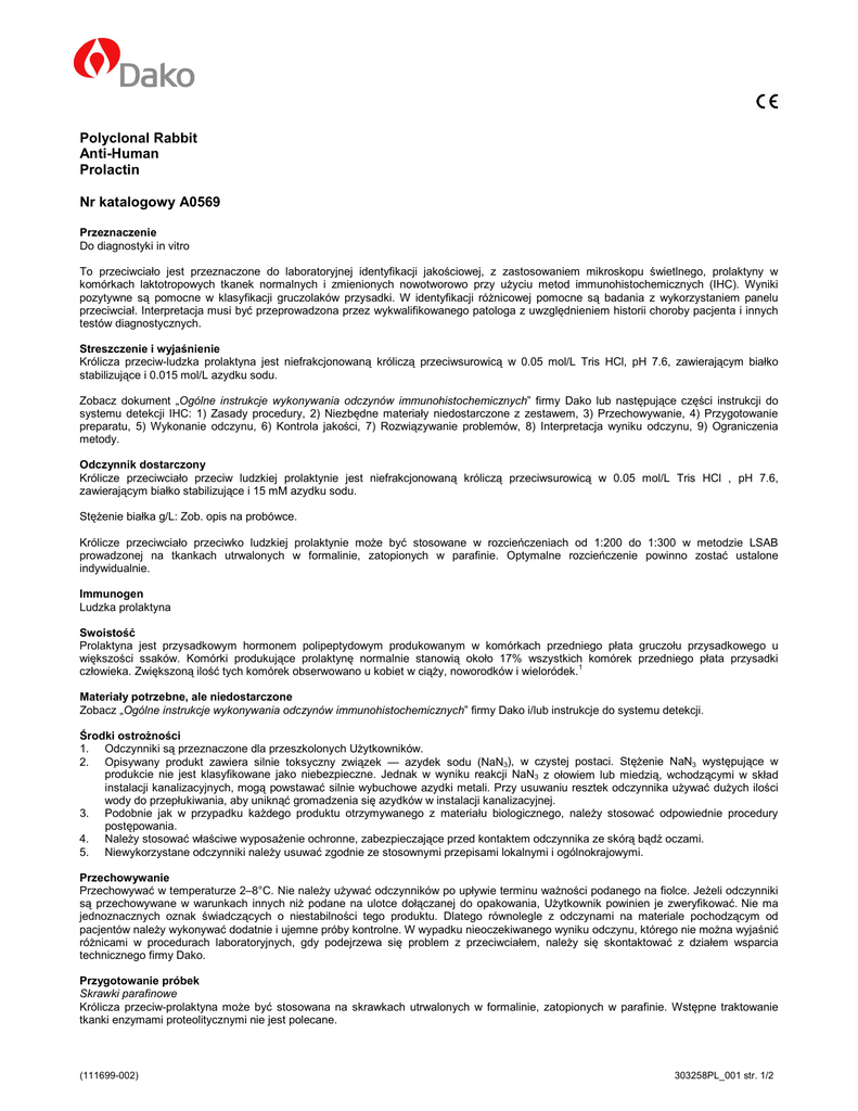 Polyclonal Rabbit Anti-Human Prolactin Nr katalogowy A0569 Przeznaczenie Do diagnostyki in vitro To przeciwciało jest przeznaczone do laboratoryjnej identyfikacji jakościowej, z zastosowaniem mikroskopu świetlnego, prolaktyny w komórkach laktotropowych tkanek normalnych i zmienionych nowotworowo przy użyciu metod immunohistochemicznych (IHC). Wyniki pozytywne są pomocne w klasyfikacji gruczolaków przysadki. W identyfikacji różnicowej pomocne są badania z wykorzystaniem panelu przeciwciał. Interpretacja musi być przeprowadzona przez wykwalifikowanego patologa z uwzględnieniem historii choroby pacjenta i innych testów diagnostycznych. Streszczenie i wyjaśnienie Królicza przeciw-ludzka prolaktyna jest niefrakcjonowaną króliczą przeciwsurowicą w 0.05 mol/L Tris HCl, pH 7.6, zawierającym białko stabilizujące i 0.015 mol/L azydku sodu. Zobacz dokument „Ogólne instrukcje wykonywania odczynów immunohistochemicznych” firmy Dako lub następujące części instrukcji do systemu detekcji IHC: 1) Zasady procedury, 2) Niezbędne materiały niedostarczone z zestawem, 3) Przechowywanie, 4) Przygotowanie preparatu, 5) Wykonanie odczynu, 6) Kontrola jakości, 7) Rozwiązywanie problemów, 8) Interpretacja wyniku odczynu, 9) Ograniczenia metody. Odczynnik dostarczony Królicze przeciwciało przeciw ludzkiej prolaktynie jest niefrakcjonowaną króliczą przeciwsurowicą w 0.05 mol/L Tris HCl , pH 7.6, zawierającym białko stabilizujące i 15 mM azydku sodu. Stężenie białka g/L: Zob. opis na probówce. Królicze przeciwciało przeciwko ludzkiej prolaktynie może być stosowane w rozcieńczeniach od 1:200 do 1:300 w metodzie LSAB prowadzonej na tkankach utrwalonych w formalinie, zatopionych w parafinie. Optymalne rozcieńczenie powinno zostać ustalone indywidualnie. Immunogen Ludzka prolaktyna Swoistość Prolaktyna jest przysadkowym hormonem polipeptydowym produkowanym w komórkach przedniego płata gruczołu przysadkowego u większości ssaków. Komórki produkujące prolaktynę normalnie stanowią około 17% wszystkich komórek przedniego płata przysadki człowieka. Zwiększoną ilość tych komórek obserwowano u kobiet w ciąży, noworodków i wieloródek.1 Materiały potrzebne, ale niedostarczone Zobacz „Ogólne instrukcje wykonywania odczynów immunohistochemicznych” firmy Dako i/lub instrukcje do systemu detekcji. Środki ostrożności 1. Odczynniki są przeznaczone dla przeszkolonych Użytkowników. 2. Opisywany produkt zawiera silnie toksyczny związek — azydek sodu (NaN3), w czystej postaci. Stężenie NaN3 występujące w produkcie nie jest klasyfikowane jako niebezpieczne. Jednak w wyniku reakcji NaN3 z ołowiem lub miedzią, wchodzącymi w skład instalacji kanalizacyjnych, mogą powstawać silnie wybuchowe azydki metali. Przy usuwaniu resztek odczynnika używać dużych ilości wody do przepłukiwania, aby uniknąć gromadzenia się azydków w instalacji kanalizacyjnej. 3. Podobnie jak w przypadku każdego produktu otrzymywanego z materiału biologicznego, należy stosować odpowiednie procedury postępowania. 4. Należy stosować właściwe wyposażenie ochronne, zabezpieczające przed kontaktem odczynnika ze skórą bądź oczami. 5. Niewykorzystane odczynniki należy usuwać zgodnie ze stosownymi przepisami lokalnymi i ogólnokrajowymi. Przechowywanie Przechowywać w temperaturze 2–8°C. Nie należy używać odczynników po upływie terminu ważności podanego na fiolce. Jeżeli odczynniki są przechowywane w warunkach innych niż podane na ulotce dołączanej do opakowania, Użytkownik powinien je zweryfikować. Nie ma jednoznacznych oznak świadczących o niestabilności tego produktu. Dlatego równolegle z odczynami na materiale pochodzącym od pacjentów należy wykonywać dodatnie i ujemne próby kontrolne. W wypadku nieoczekiwanego wyniku odczynu, którego nie można wyjaśnić różnicami w procedurach laboratoryjnych, gdy podejrzewa się problem z przeciwciałem, należy się skontaktować z działem wsparcia technicznego firmy Dako. Przygotowanie próbek Skrawki parafinowe Królicza przeciw-prolaktyna może być stosowana na skrawkach utrwalonych w formalinie, zatopionych w parafinie. Wstępne traktowanie tkanki enzymami proteolitycznymi nie jest polecane. (111699-002) 303258PL_001 str. 1/2 Procedura barwienia Zgodnie z zalecaną procedurą dla wybranego systemu wykrywania Interpretacja barwienia Reakcja z przeciwciałami przeciwko ludzkiej prolaktynie ma charakter cytoplazmatyczny. Charakterystyka reaktywności Wielohormonalna natura gruczolaków przysadki jest dobrze poznana. W tych guzach najczęściej obserwowano kombinację komórek produkujących hormon wzrostu i komórek produkujących prolaktynę2-4 Więcej informacji na temat wykrywania i identyfikacji hormonów przysadkowych w Bibliografii, pozycje 5-10. Piśmiennictwo 1. Asa SL, et al. Prolactin cells in human pituitary. A quantitative immunocytological analysis. Arch Pathol Lab Med 1982; 106:360 2. Heitz PU. Multihormonal pituitary adenomas. Horm Res 1979; 10:1 3. Kovacs K, et al. Prolactin cell adenomas of the human pituitary. Morphologic features of prolactin cells in the non-tumorous portion of the anterior lobe. Horm Metab Res 1978; 10:409 4. Duello TM, et al. Immunocytochemistry of prolactin-producing human pituitary adenomas. Amer J Anat 1980; 158:463 5. Kalyanaraman UP, et al. Prolactin-secreting pituitary oncocytoma with galactorrhea-amenorrhea syndrome. A histologic, ultrastructural and immunocytochemical study. Cancer 1980; 45:1584 6. Horvath E, et al. Histologic immunocytologic and fine structural finding in pituitary adenomas associated with the multiple endocrine neoplasia syndrome (MENS). Lab Invest 1979; 40:261 7. Halmi NS, et al. Prolactin and growth hormone cells in the human hypophysis: A study with immunoenzyme histochemistry and differential staining. Cell Tissue Res 1975; 158:497 8. Kovacs K, et al. Immunocytology of the human pituitary. In: DeLellis (ed.). 