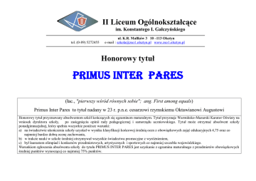 II Liceum Ogólnokształcące im. Konstantego I. Gałczyńskiego tel. (0-89) 5272455 ul. K.R. Małłków 3 10 –113 Olsztyn e-mail : [email protected] www.zso1.olsztyn.pl Honorowy tytuł PRIMUS INTER PARES (łac., "pierwszy wśród równych sobie"; ang. First among equals) Primus Inter Pares to tytuł nadany w 23 r. p.n.e. cesarzowi rzymskiemu Oktawianowi Augustowi Honorowy tytuł przyznawany absolwentom szkół kończących się egzaminem maturalnym. Tytuł przyznaje Warmińsko-Mazurski Kurator Oświaty na wniosek dyrektora szkoły, po zasięgnięciu opinii rady pedagogicznej i samorządu uczniowskiego. Tytuł może otrzymać absolwent szkoły ponadgimnazjalnej, który spełnia wszystkie poniższe warunki: a) na świadectwie ukończenia szkoły uzyskał w wyniku klasyfikacji końcowej średnią ocen z obowiązkowych zajęć edukacyjnych 4,75 oraz co najmniej bardzo dobrą ocenę zachowania, b) w trakcie nauki w szkole średniej otrzymywał wszystkie świadectwa promocyjne z wyróżnieniem, c) był laureatem olimpiad i konkursów przedmiotowych, artystycznych i sportowych co najmniej szczebla wojewódzkiego. Warunkiem zgłoszenia absolwenta szkoły do tytułu PRIMUS INTER PARES jest uzyskanie z egzaminu maturalnego z przedmiotów obowiązkowych średniej punktów wynoszącej co najmniej 75% punktów. A b s o l w e n c i z 2009 roku Wychowawca Borkowska Anna Czachorowski Paweł Hermanowicz Daniel Litwiński Michał Wieczorek Sebastian kl. IIIa Anna Romanowska kl. IIIa Anna Romanowska kl. IIIFa niemieckojęzyczna Daniel Pawlikowski kl. IIIe Barbara Juszkiewicz kl. IIIe Barbara Juszkiewicz
