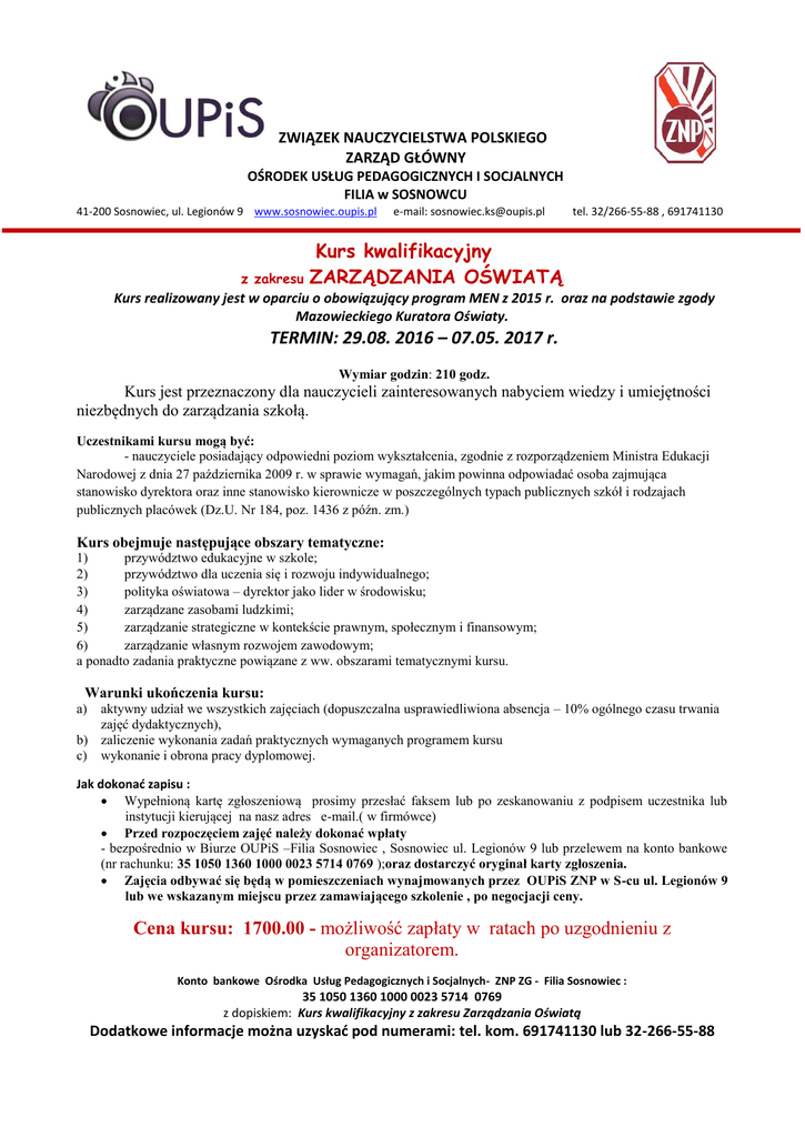 ZWIĄZEK NAUCZYCIELSTWA POLSKIEGO ZARZĄD GŁÓWNY OŚRODEK USŁUG PEDAGOGICZNYCH I SOCJALNYCH FILIA w SOSNOWCU 41-200 Sosnowiec, ul. Legionów 9 www.sosnowiec.oupis.pl z zakresu e-mail: [email protected] tel. 32/266-55-88 , 691741130 Kurs kwalifikacyjny ZARZĄDZANIA OŚWIATĄ Kurs realizowany jest w oparciu o obowiązujący program MEN z 2015 r. oraz na podstawie zgody Mazowieckiego Kuratora Oświaty. TERMIN: 29.08. 2016 – 07.05. 2017 r. Wymiar godzin: 210 godz. Kurs jest przeznaczony dla nauczycieli zainteresowanych nabyciem wiedzy i umiejętności niezbędnych do zarządzania szkołą. Uczestnikami kursu mogą być: - nauczyciele posiadający odpowiedni poziom wykształcenia, zgodnie z rozporządzeniem Ministra Edukacji Narodowej z dnia 27 października 2009 r. w sprawie wymagań, jakim powinna odpowiadać osoba zajmująca stanowisko dyrektora oraz inne stanowisko kierownicze w poszczególnych typach publicznych szkół i rodzajach publicznych placówek (Dz.U. Nr 184, poz. 1436 z późn. zm.) Kurs obejmuje następujące obszary tematyczne: 1) przywództwo edukacyjne w szkole; 2) przywództwo dla uczenia się i rozwoju indywidualnego; 3) polityka oświatowa – dyrektor jako lider w środowisku; 4) zarządzane zasobami ludzkimi; 5) zarządzanie strategiczne w kontekście prawnym, społecznym i finansowym; 6) zarządzanie własnym rozwojem zawodowym; a ponadto zadania praktyczne powiązane z ww. obszarami tematycznymi kursu. Warunki ukończenia kursu: aktywny udział we wszystkich zajęciach (dopuszczalna usprawiedliwiona absencja – 10% ogólnego czasu trwania zajęć dydaktycznych), b) zaliczenie wykonania zadań praktycznych wymaganych programem kursu c) wykonanie i obrona pracy dyplomowej. a) Jak dokonać zapisu : Wypełnioną kartę zgłoszeniową prosimy przesłać faksem lub po zeskanowaniu z podpisem uczestnika lub instytucji kierującej na nasz adres e-mail.( w firmówce) Przed rozpoczęciem zajęć należy dokonać wpłaty - bezpośrednio w Biurze OUPiS –Filia Sosnowiec , Sosnowiec ul. Legionów 9 lub przelewem na konto bankowe (nr rachunku: 35 1050 1360 1000 0023 5714 0769 );oraz dostarczyć oryginał karty zgłoszenia. Zajęcia odbywać się będą w pomieszczeniach wynajmowanych przez OUPiS ZNP w S-cu ul. Legionów 9 lub we wskazanym miejscu przez zamawiającego szkolenie , po negocjacji ceny. Cena kursu: 1700.00 - możliwość zapłaty w ratach po uzgodnieniu z organizatorem. Konto bankowe Ośrodka Usług Pedagogicznych i Socjalnych- ZNP ZG - Filia Sosnowiec : 35 1050 1360 1000 0023 5714 0769 z dopiskiem: Kurs kwalifikacyjny z zakresu Zarządzania Oświatą Dodatkowe informacje można uzyskać pod numerami: tel. kom. 691741130 lub 32-266-55-88