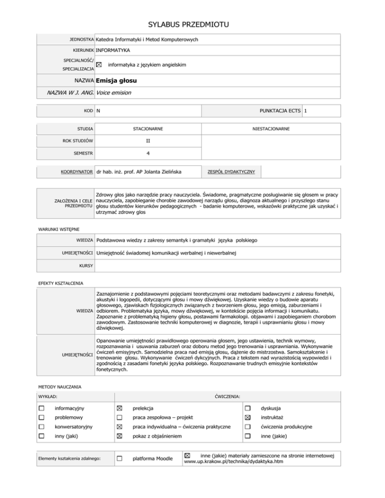 SYLABUS PRZEDMIOTU JEDNOSTKA Katedra Informatyki i Metod Komputerowych KIERUNEK INFORMATYKA SPECJALNOŚĆ/ informatyka z językiem angielskim SPECJALIZACJA NAZWA Emisja głosu NAZWA W J. ANG. Voice emision KOD N STUDIA PUNKTACJA ECTS 1 STACJONARNE ROK STUDIÓW II SEMESTR 4 NIESTACJONARNE KOORDYNATOR dr hab. inż. prof. AP Jolanta Zielińska ZESPÓŁ DYDAKTYCZNY Zdrowy głos jako narzędzie pracy nauczyciela. Świadome, pragmatyczne posługiwanie się głosem w pracy ZAŁOŻENIA I CELE nauczyciela, zapobieganie chorobie zawodowej narządu głosu, diagnoza aktualnego i przyszlego stanu PRZEDMIOTU głosu studentów kierunków pedagogicznych - badanie komputerowe, wskazówki praktyczne jak uzyskać i utrzymać zdrowy glos WARUNKI WSTĘPNE WIEDZA Podstawowa wiedzy z zakresy semantyk i gramatyki języka polskiego UMIEJĘTNOŚCI Umiejętność świadomej komunikacji werbalnej i niewerbalnej KURSY EFEKTY KSZTAŁCENIA Zaznajomienie z podstawowymi pojęciami teoretycznymi oraz metodami badawczymi z zakresu fonetyki, akustyki i logopedii, dotyczącymi głosu i mowy dźwiękowej. Uzyskanie wiedzy o budowie aparatu głosowego, zjawiskach fizjologicznych związanych z tworzeniem głosu, jego emisją, zaburzeniami i WIEDZA odbiorem. Problematyka języka, mowy dźwiękowej, w kontekście pojęcia informacji i komunikatu. Zapoznanie z problematyką higieny głosu, postawami farmakologii. objawami i zapobieganiem chorobom zawodowym. Zastosowanie techniki komputerowej w diagnozie, terapii i usprawnianiu głosu i mowy dźwiękowej. Opanowanie umiejętności prawidłowego operowania głosem, jego ustawienia, technik wymowy, rozpoznawania i usuwania zaburzeń oraz doboru metod jego trenowania i usprawniania. Wykonywanie ćwiczeń emisyjnych. Samodzielna praca nad emisją głosu, dążenie do mistrzostwa. Samokształcenie i UMIEJĘTNOŚCI trenowanie głosu. Wykonywanie ćwiczeń dykcyjnych. Praca z tekstem nad wyrazistością wypowiedzi i zgodnością z zasadami fonetyki języka polskiego. Rozpoznawanie trudnych emisyjnie kontekstów fonetycznych. METODY NAUCZANIA WYKŁAD: ĆWICZENIA: informacyjny prelekcja dyskusja problemowy praca zespołowa – projekt instruktaż konwersatoryjny praca indywidualna – ćwiczenia praktyczne ćwiczenia produkcyjne inny (jaki) pokaz z objaśnieniem inne (jakie) Elementy kształcenia zdalnego: platforma Moodle inne (jakie) materiały zamieszcone na stronie internetowej www.up.krakow.pl/technika/dydaktyka.htm ORGANIZACJA FORMA ZAJĘĆ ĆWICZENIA W GRUPACH WYKŁAD (W) A K L STUDIA STACJONARNE LICZBA GODZIN S P 15 STUDIA NIESTACJONARNE FORMY SPRAWDZANIA EFEKTÓW KSZTAŁCENIA W A K L Test wielokrotnego wyboru, sprawdzian praktyczny umiejętności emisyjnych (przygotowanie i przeprowadzenie ćwiczenia emisyjnego oraz czytanie zadanego tekstu). S P FORMA ZALICZENIA egzamin zaliczenie z oceną zaliczenie OCENA UWAGI PODSTAWOWA 1.Chaciński J., Chacińska K., Podstawy emisji głosu w procesie kształcenia nauczycieli muzyki, wyd WSP Słupsk 1999. 2.Legieć-Matosiuk A., Chaciński J., Emisja glosuskrypt dla studentów, wyd. WSP, Słupsk 1994. 3. Mierzejewska H., Przybysz-Piwkowa M., Zaburzenia głosu-badanie-diagnozowanie-metody usprawniania, wyd. DIG, Warszawa 1998. 4.Pruszewicz A., Foniatria kliniczna, PZWL, LITERATURA Warszawa 1992. 5.Przybysz-Piwko M., Emisja głosu nauczyciela, , CDN., Warszawa 2006. 6.Styczek I., Logopedia, PWN, Warszawa 1980. 7.Tadeusiewicz R., Sygnał mowy, KiŁ, Warszawa 1988. 8.Tarasiewicz B., Mówię i śpiewam świadomie, UNIVERSITAS, Warszawa 2006. 9.Toczyska B., Elementarne ćwiczenia dykcji, wyd. Gdańskie Wyd. Oświatowe, Gdańsk 1998 ZMIANY: UZUPEŁNIAJĄCA Dłuska M., Fonetyka polska, PWN, Kraków 1976. 2. Gawęda K., Łazewski J., Uczymy się poprawnej wymowy, Warszwa 1995. 3. Gawęda K., Łazewski J., O błędach wymowy....., Agencja „Od A do Z”, Białystok 2000. 4.Klemensiewicz Z., Prawidła poprawnej wymowy polskiej, wyd. Bis, Warszawa 1995. 5.Michałowska D., O podstawach polskiej wymowy scenicznej. Wydanie 2 poszerzone i uzupełnione, wyd. PWST, Kraków 1994. 6.Minczakiewicz E. M., Mowa rozwój-zaburzenia, terapia, wyd. AP, Kraków 1997. 7.Mitrinowicz-Modrzejewska A., Fizjologia i patologia głosu, słuchu i mowy, PZWL, Warszawa 1996 8.Rokitańska M., Laskowska H., Zdrowy głos, ABA, Bydgoszcz 2003. 9.Skrzynecka G., Uczymy się poprawnie mówić, WSiP, Warszawa 1999.