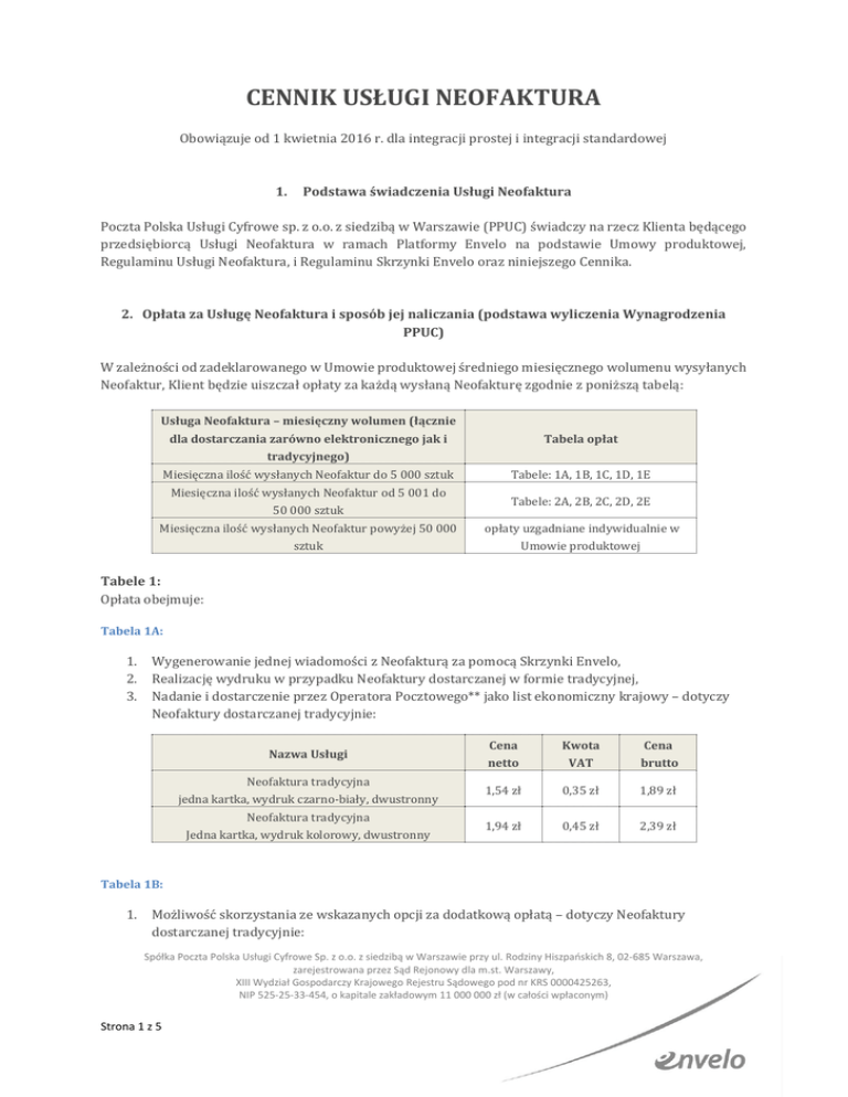 CENNIK USŁUGI NEOFAKTURA Obowiązuje od 1 kwietnia 2016 r. dla integracji prostej i integracji standardowej 1. Podstawa świadczenia Usługi Neofaktura Poczta Polska Usługi Cyfrowe sp. z o.o. z siedzibą w Warszawie (PPUC) świadczy na rzecz Klienta będącego przedsiębiorcą Usługi Neofaktura w ramach Platformy Envelo na podstawie Umowy produktowej, Regulaminu Usługi Neofaktura, i Regulaminu Skrzynki Envelo oraz niniejszego Cennika. 2. Opłata za Usługę Neofaktura i sposób jej naliczania (podstawa wyliczenia Wynagrodzenia PPUC) W zależności od zadeklarowanego w Umowie produktowej średniego miesięcznego wolumenu wysyłanych Neofaktur, Klient będzie uiszczał opłaty za każdą wysłaną Neofakturę zgodnie z poniższą tabelą: Usługa Neofaktura – miesięczny wolumen (łącznie dla dostarczania zarówno elektronicznego jak i tradycyjnego) Tabela opłat Miesięczna ilość wysłanych Neofaktur do 5 000 sztuk Tabele: 1A, 1B, 1C, 1D, 1E Miesięczna ilość wysłanych Neofaktur od 5 001 do 50 000 sztuk Tabele: 2A, 2B, 2C, 2D, 2E Miesięczna ilość wysłanych Neofaktur powyżej 50 000 sztuk opłaty uzgadniane indywidualnie w Umowie produktowej Tabele 1: Opłata obejmuje: Tabela 1A: 1. 2. 3. Wygenerowanie jednej wiadomości z Neofakturą za pomocą Skrzynki Envelo, Realizację wydruku w przypadku Neofaktury dostarczanej w formie tradycyjnej, Nadanie i dostarczenie przez Operatora Pocztowego** jako list ekonomiczny krajowy – dotyczy Neofaktury dostarczanej tradycyjnie: Nazwa Usługi Cena netto Kwota VAT Cena brutto Neofaktura tradycyjna jedna kartka, wydruk czarno-biały, dwustronny 1,54 zł 0,35 zł 1,89 zł Neofaktura tradycyjna Jedna kartka, wydruk kolorowy, dwustronny 1,94 zł 0,45 zł 2,39 zł Tabela 1B: 1. Możliwość skorzystania ze wskazanych opcji za dodatkową opłatą – dotyczy Neofaktury dostarczanej tradycyjnie: Spółka Poczta Polska Usługi Cyfrowe Sp. z o.o. z siedzibą w Warszawie przy ul. Rodziny Hiszpańskich 8, 02-685 Warszawa, zarejestrowana przez Sąd Rejonowy dla m.st. Warszawy, XIII Wydział Gospodarczy Krajowego Rejestru Sądowego pod nr KRS 0000425263, NIP 525-25-33-454, o kapitale zakładowym 11 000 000 zł (w całości wpłaconym) Strona 1 z 5 Neofaktura doręczana tradycyjnie – odrębne opcje płatne dodatkowo doliczane do cen z Tabeli 1A Cena netto Kwota VAT Cena brutto List priorytetowy 1,63 zł 0,37 zł 2,00 zł List ekonomiczny przesyłka zagraniczna 4,07 zł 0,93 zł 5,00 zł List priorytetowy przesyłka zagraniczna 5,69 zł 1,31 zł 7,00 zł Każda dodatkowa kartka, wydruk czarno-biały 0,12 zł 0,03 zł 0,15 zł Każda dodatkowa kartka, wydruk kolorowy 0,53 zł 0,12 zł 0,65 zł Dopłaty do przesyłek zawierających więcej niż 6 Cena Kwota Cena kartek w jednej przesyłce. netto VAT brutto Dopłata do przesyłki krajowej o łącznej liczbie kartek od 7 do 14 szt. 0,74 zł 0,17 zł 0,91 zł Dopłata do przesyłki krajowej o łącznej liczbie kartek od 15 do 68 szt. 0,95 zł 0,22 zł 1,17 zł Dopłata do przesyłki krajowej o łącznej liczbie kartek od 69 do 98 szt. 1,65 zł 0,38 zł 2,03 zł 5,03 zł 1,16 zł 6,19 zł 5,14 zł 1,18 zł 6,32 zł 6,64 zł 1,53 zł 8,17 zł Dopłata do przesyłki zagranicznej o łącznej liczbie kartek od 7 do 14 szt. Dopłata do przesyłki zagranicznej o łącznej liczbie kartek od 15 do 68 szt. Dopłata do przesyłki zagranicznej o łącznej liczbie kartek od 69 do 98 szt. Tabela 1C: Opłata za Neofakturę dostarczaną tradycyjnie nadaną jako list polecony krajowy obejmuje: 1. Wygenerowanie jednej wiadomości z Neofakturą za pomocą Skrzynki Envelo, 2. Realizację wydruku na jednej kartce, druk jednostronny lub dwustronny 3. Nadanie i dostarczenie przez Operatora Pocztowego**, jako list polecony ekonomiczny krajowy: Nazwa Usługi Neofaktura dostarczana tradycyjnie wydruk czarno-biały Neofaktura dostarczana tradycyjnie wydruk kolorowy Cena Kwota Cena netto VAT brutto 4,23 zł 0,97 zł 5,20 zł 4,76 zł 1,09 zł 5,85 zł Tabela 1D: Neofaktura dostarczana tradycyjnie – odrębne opcje Cena Kwota Cena płatne dodatkowo doliczane do cen z Tabeli 1C netto VAT brutto List polecony priorytetowy krajowy 3,09 zł 0,71 zł 3,80 zł Usługa zwrotne potwierdzenie odbioru dla przesyłek poleconych krajowych (ZPO) 1,63 zł 0,37 zł 2,00 zł List polecony priorytetowy przesyłka zagraniczna* 16,10 zł 3,70 zł 19,80 zł Usługa zwrotne potwierdzenie odbioru dla przesyłek poleconych zagranicznych (ZPO) 3,25 zł 0,75 zł 4,00 zł Spółka Poczta Polska Usługi Cyfrowe Sp. z o.o. z siedzibą w Warszawie przy ul. Rodziny Hiszpańskich 8, 02-685 Warszawa, zarejestrowana przez Sąd Rejonowy dla m.st. Warszawy, XIII Wydział Gospodarczy Krajowego Rejestru Sądowego pod nr KRS 0000425263, NIP 525-25-33-454, o kapitale zakładowym 11 000 000 zł (w całości wpłaconym) Strona 2 z 5 Każda dodatkowa kartka, wydruk czarno-biały, druk jednostronny lub dwustronny. 0,12 zł 0,03 zł 0,15 zł 0,53 zł 0,12 zł 0,65 zł Dopłaty do przesyłek zawierających więcej niż 6 Cena Kwota Cena kartek w jednej przesyłce. netto VAT brutto 0,74 zł 0,17 zł 0,91 zł Dopłata do przesyłki krajowej o łącznej liczbie kartek od 15 do 68 szt. 0,95 zł 0,22 zł 1,17 zł Dopłata do przesyłki krajowej o łącznej liczbie kartek od 69 do 98 szt. 1,65 zł 0,38 zł 2,03 zł Dopłata do przesyłki zagranicznej o łącznej liczbie kartek od 7 do 14 szt. 5,03 zł 1,16 zł 6,19 zł 5,14 zł 1,18 zł 6,32 zł 6,64 zł 1,53 zł 8,17 zł Każda dodatkowa kartka, wydruk kolorowy, druk jednostronny lub dwustronny. Dopłata do przesyłki krajowej o łącznej liczbie kartek od 7 do 14 szt. Dopłata do przesyłki zagranicznej o łącznej liczbie kartek od 15 do 68 szt. Dopłata do przesyłki zagranicznej o łącznej liczbie kartek od 69 do 98 szt. Tabela 1E: 1. Dostarczenie do Skrzynek Envelo Odbiorców wiadomości elektronicznej z Neofakturą w formie pliku PDF – dotyczy Neofaktury dostarczanej w formie elektronicznej: Nazwa Usługi Neofaktura Dosta