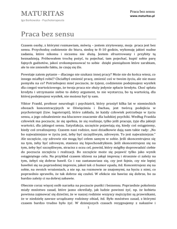 Praca bez sensu MATURITAS www.maturitas.pl Iga Borkowska - Psychoterapeuta Praca bez sensu Czasem osoby, z którymi rozmawiam, mówią – jestem zirytowany, moja praca jest bez sensu. Przychodzę codziennie do biura, siedzę te 8-10 godzin, wykonuję jakieś nudne zadania, które nikomu i niczemu nie służą. Jestem sfrustrowany i przybity tą beznadzieją. Próbowałem trochę pożyć, tu pojechać, tam pojechać, kupić sobie parę fajnych gadżetów, jakoś zrekompensować to sobie dzięki pieniądzom które zarabiam, ale to nie zmieniło faktu, że czuję się źle. Powstaje zatem pytanie – dlaczego nie szukasz innej pracy? Może nie do końca wiesz, co innego miałbyś robić? Chciałbyś zmienić pracę, zmienić coś w twoim życiu, ale nie masz pomysłu na co? Potrzebujesz mieć poczucie, że żyjesz, codziennie podejmujesz wysiłek dla czegoś wartościowego, że twoja praca nie służy jedynie spłacie kredytu. Choć spłata kredytu i utrzymanie siebie to dobry argument, to nie wystarcza, bo tą wartością, dla której podejmujesz wysiłek, nie możesz być ty sam. Viktor Frankl, profesor neurologii i psychiatrii, który przeżył kilka lat w niemieckich obozach koncentracyjnych w Oświęcimiu i Dachau, jest twórcą podejścia w psychoterapii (tzw. logoterapii), które zakłada, że każdy człowiek potrzebuje w życiu sensu, a jego odnalezienie ma kluczowe znaczenie dla ludzkiej psychiki. Według Frankla człowiek ma poczucie, że się spełnia, że się realizuje, tylko jeśli pracuje, żyje dla jakiejś wartości, dla jakiegoś sensu. Satysfakcja, szczęście pojawiają się, kiedy coś osiągniemy, kiedy coś zrealizujemy. Czasem nasi rodzice, nasi dziadkowie dają nam takie rady: „No bo najważniejsze w życiu jest, żeby być szczęśliwym, zdrowym. To jest najważniejsze.” Ale szczęście, czy zdrowie nie mogą być celem samym w sobie. Jeśli skoncentrujesz się na tym, żeby być zdrowym, staniesz się hipochondrykiem. Jeśli skoncentrujesz się na tym, żeby być szczęśliwym, stracisz z oczu cel, powód, który mógłby doprowadzić ciebie do poczucia szczęścia i realizacji. Bo szczęście może się pojawić tylko jako wynik osiągniętego celu. Na przykład czasem idziesz na jakąś imprezę i strasznie ci zależy na tym, żebyś się dobrze bawił. Co i raz zastanawiasz się, czy jest fajnie, czy nie lepiej bawiłeś się na poprzedniej imprezie, jakoś tak ci humor opada, itd. Koncentrujesz się na sobie, na swoich wrażeniach, a nie np. na rozmowie ze znajomymi, na byciu z nimi, co poprzednio sprawiło, że tak dobrze się czułeś. W efekcie nie bawisz się dobrze, bo za bardzo zależy ci na dobrej zabawie. Obecnie coraz więcej osób narzeka na poczucie pustki i bezsensu. Poprzednie pokolenia miały mnóstwo zasad, które jasno określały, jak ludzie powinni żyć, np. że kobieta powinna zajmować się dziećmi, że w naszej rodzinie wszyscy mężczyźni są prawnikami, że w niedzielę zawsze urządzamy rodzinny obiad, itd. Było mnóstwo zasad, z którymi czasem bardzo trudno było żyć. W dzisiejszych czasach rezygnujemy z nakazów i 1 Praca bez sensu MATURITAS www.maturitas.pl Iga Borkowska - Psychoterapeuta zakazów poprzednich pokoleń, nie jesteśmy już przez nie ograniczani, ale przez to nosimy na sobie ciężar wyboru. Musimy podejmować mnóstwo decyzji, od tych najprostszych, co ugotuję dziś na obiad po te najtrudniejsze – co chcę w życiu robić, dla jakiej wartości mam żyć… No dobrze, zapytasz pewnie, jak zdać sobie sprawę, z tego, czego chcę, jak odnaleźć ten sens? Zgodnie z nurtem logoterapii człowiek, aby dotrzeć do sensu, potrzebuje rozpoznawać po kolei zadania stojące przed nim i brać za nie odpowiedzialność. Te zadania dzielą się na 3 kategorie: - po pierwsze praca i dokonywanie osiągnięć, - po drugie doświadczenie dobra, prawdy, piękna a także pozytywnych uczuć względem innych osób, - a po trzecie dzielne znoszenie nieuniknionego cierpienia. Więc do odkrycia sensu niezbędna jest analiza twoich talentów, twoich wartości, okoliczności, w których się znajdujesz i rozpoznawanie z pomocą twojej intuicji – co jest twoim zadaniem w tej chwili i jak możesz to zrealizować. To jest też uznanie, że to ty decydujesz, jak żyjesz, jaki jesteś, w przeciwieństwie do postawy „takie są okoliczności, taki jestem i nic na to nie mogę poradzić”. To w końcu akceptacja tych trudności, na które nie masz wpływu. Poczucie szczęścia i satysfakcji z życia pojawia się tylko, jeśli osiągniemy jakiś cel, czyli dopiero kiedy zrealizujemy jakieś stojące przed nami zadanie. Odkrycie tego celu leży w Twoich rękach. Musisz jednak znaleźć na to czas. Zastanów się, kiedy ostatnio dałeś sobie godzinę i próbowałeś odpowiedzieć na pytanie „czego ja chcę od życia”? Często teraz oscylujemy między zawodową nadaktywnością a wypoczynkiem, w którym uciekamy od siebie. Nie mamy czasu by zakończyć rozpoczętą myśl. Kiedy zaczynamy się nad czymś zastanawiać, wchodzi sekretarka z prośbą o podpis albo dzwoni komórka. Nawet, kiedy korzystasz z urlopu nie znajdujesz czasu na swoje przemyślenia. Raczej szukasz ciągle zajęć, które zapełnią każdą minutę – chodzisz do klubów, zwiedzasz zabytki, czytasz książki, a nie siądziesz i spróbujesz odpowiedzieć sobie na pytanie „czego ja chcę”. Często tłumione za dnia myśli, problemy wracają w nocy w postaci bezsenności. Potrzebujesz czasu na podróż w głąb siebie, często w tej podróży bardzo pomocna jest osoba, która potrafi zadać odpowiednie pytanie, aby pomóc ci zrozumieć siebie, pomoc uważnej osoby, która wskaże ci te aspekty ciebie, które dla ciebie są niewidoczne. Psychoterapeuta jest jedną z takich osób, bo przez wiele lat szkolenia uczy się przede wszystkim rozumieć innych i pomagać im zrozumieć i zmieniać siebie. 2