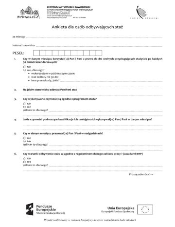 Ankieta dla osób odbywających staż za miesiąc Imiona i nazwisko: PESEL: 1. Czy w danym miesiącu korzystał(-a) Pan / Pani z prawa do dni wolnych przysługujących stażyście po każdych 30 dniach kalendarzowych? a) tak b) nie, dlaczego? wykorzystam w późniejszym czasie staż krótszy niż 30 dni inne przeszkody, jakie? 2. Na jakim stanowisku odbywa Pan/Pani staż 3. Czy wykonywane czynności są zgodne z programem stażu? a) tak b) nie jeśli nie to dlaczego? 4. Jakie czynności podnoszące kwalifikacje lub umiejętności wykonywał(-a) Pan / Pani w danym miesiącu? 5. Czy w danym miesiącu pracował(-a) Pan / Pani w nadgodzinach? a) nie b) tak jeśli tak to dlaczego? 6. Czy warunki odbywania stażu są zgodne z regulaminem danego zakładu pracy ? (zasadami BHP) a) tak b) nie jeśli nie to dlaczego? Proszę odwrócić → Projekt realizowany w ramach Inicjatywy na rzecz zatrudnienia ludzi młodych 7. Czy współpracuje Pan / Pani ze swoim opiekunem stażu? a) tak b) nie c) nie wiem, kto nim jest (proszę przejść do pytania nr 9) 8. Jak układa się Pana / Pani współpraca z opiekunem stażu? a) pozytywnie b) negatywnie jeśli negatywnie, to dlaczego? 9. Czy w miejscu odbywania stażu organizator zamieścił informacje z logo Unii Europejskiej i Funduszy Europejskich? a) tak b) nie 10. Inne uwagi Przyjmuję do wiadomości, że w przypadku zgłoszenia w ankiecie nieprawidłowości w realizacji stażu urząd pracy wystosuje do Organizatora stażu pismo, celem złożenia stosownych wyjaśnień. Bydgoszcz, dnia Podpis Wypełnioną ankietę należy złożyć: - w PUP Bydgoszcz, pok. 306, III piętro - do 1 dnia roboczego nowego miesiąca za miesiąc poprzedni. Ankieta jest przeznaczona wyłącznie do użytku służbowego. Projekt realizowany w ramach Inicjatywy na rzecz zatrudnienia ludzi młodych