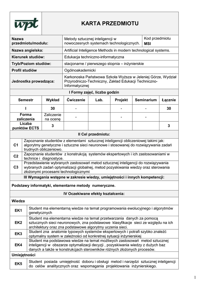 KARTA PRZEDMIOTU Kod przedmiotu MSI Nazwa przedmiotu/modułu: Metody sztucznej inteligencji w nowoczesnych systemach technologicznych. Nazwa angielska: Artificial Inteligence Methods in modern technological systems. Kierunek studiów: Edukacja techniczno-informatyczna Tryb/Poziom studiów: stacjonarne / pierwszego stopnia – inżynierskie Profil studiów Ogólnoakademicki Jednostka prowadząca: Karkonoska Państwowa Szkoła Wyższa w Jeleniej Górze, Wydział Przyrodniczo-Techniczny, Zakład Edukacji TechnicznoInformatycznej I Formy zajęć, liczba godzin Semestr Wykład Ćwiczenie Projekt Seminarium Łącznie I 30 - - - 30 Forma zaliczenia Liczba punktów ECTS Zaliczenie na ocenę - - - Lab. 3 3 II Cel przedmiotu: C1 C2 C3 Zapoznanie studentów z elementami sztucznej inteligencji obliczeniowej takimi jak: algorytmy genetyczne i sztuczne sieci neuronowe i stosowanej do rozwiązywania zadań trudnych obliczeniowo. Zapoznanie studentów z konstrukcją systemów ekspertowych i ich zastosowaniami w technice i diagnostyce. Przedstawienie wybranych zastosowań metod sztucznej inteligencji do rozwiązywania wybranych zadań optymalizacji globalnej, metod pozyskiwania wiedzy oraz sterowania złożonymi procesami technologicznymi III Wymagania wstępne w zakresie wiedzy, umiejętności i innych kompetencji: Podstawy informatyki, elementarne metody numeryczne. IV Oczekiwane efekty kształcenia: Wiedza Student ma elementarną wiedze na temat programowania ewolucyjnego i algorytmów genetycznych Student ma elementarna wiedze na temat przetwarzania danych za pomocą EK2 sztucznych sieci neuronowych, zna podstawowe klasyfikacje sieci ze względu na ich architektury oraz zna podstawowe algorytmy uczenia sieci. Student zna anatomie typowych systemów ekspertowych i potrafi szybko znaleźć EK3 optymalny system w zależności od konkretnej sytuacji inżynierskiej Student ma podstawowa wiedze na temat możliwych zastosowań metod sztucznej EK4 inteligencji w obszarze optymalizacji decyzji , pozyskiwania wiedzy z dużych baz danych a także w konstrukcjach sterowników różnych złożonych procesów. Umiejętności EK1 EK5 Student posiada umiejętność doboru i obsługi metod i narzędzi sztucznej inteligencji do celów analitycznych oraz wspomagania projektowania inżynierskiego. 1 V Treści programowe: Forma zajęć: wykład Liczba godzin Wyk1 Historia rozwoju sztucznej inteligencji, maszyna Turinga, test Turinga, technologia chatbootow. 2 Wyk2 Pojecie inteligencji obliczeniowej, przegląd segmentów AI 2 Wyk3 Wyk4 Wyk5 Wyk6 Złozoności obliczeniowe, ich klasyfikacja, przykłady, algorytmy heurestyczne , gry . Zagadnienia optymalizacji – programowanie liniowe ,programowanie wypukłe. Problemy optymalizacji globalnej-przegląd znanych algorytmów, algorytm wyżarzania Problem optymalizacji globalnej-klasyczny algorytm genetyczny Wyk14 Problem optymalizacji globalnej-algorytm genetyczny ,przykłady i zastosowania Sieci neuronowe: modele neuronu i perceptronu, realizacje perceptronowe funkcji boolowskich Sieci neuronowe :sieci jednokierunkowe, sieci z propagacja wsteczna , sieci o radialnych funkcjach aktywacji, uczenie nadzorowane sieci jednowarstwowych Sieci neuronowe: uczenie nadzorowane i nienadzorowane sieci wielowarstwowych, sieci typu Hopfielda, zastosowania sieci :klasyfikatory ,pamięci asocjatywne, klasyfikacja i rozpoznawanie obrazów Systemy ekspertowe: klasyfikacja i reprezentacje wiedzy, rachunek zdań i predykatów, sieci semantyczne Systemy ekspertowe: struktura modułowa systemu ekspertowego i mechanizmy działania systemów ekspertowych. Proste zastosowania i przykłady. Systemy ekspertowe: logika rozmyta, rozmyte systemy ekspertowe, zastosowania i przykłady Zastosowania metod AI w układach sterowania Wyk15 Podsumowane-perspektywy i zastosowania metod sztucznej inteligencji Wyk7 Wyk8 Wyk9 Wyk10 Wyk11 Wyk12 Wyk13 2 2 2 2 2 2 2 2 2 2 2 2 2 VI Narzędzia dydaktyczne: N1 Wykłady w formie prezentacji multimedialnych wygłaszanych przez prowadzącego wykład N2 e-learning http://www.kpswjg.pl/~gielerak /index.html N3 Dyskusje problemowe w ramach wykładu. N4 Oprogramowanie komputerowe: Matlab, Scicos-Scilab , animacje i aplety-demo. VII Sposoby oceny (F – formująca, P – podsumowująca) F1 Kolokwia sprawdzające i ocena za indywidualne odpowiedzi podczas wykładów. F2 Ocena merytoryczna i formalna za wykonany projekt prezentacji multimedialnej na temat związany z wykładem. F3 Ocena z kolokwium sprawdzającego wiedzę wyniesiona z wykładów Ocena końcowa z wykładów jest średnią ważoną obliczaną z oceny formującej F1 P1 (40 %), oceny formującej F2 (20%) i F3 (40% ). Warunkiem zaliczenia przedmiotu jest uzyskanie pozytywnych ocen z F1, F2 i F3. VIII Obciążenie pracą studenta Łączna i średnia liczba godzin Forma aktywności na zrealizowanie aktywności Godziny kontaktowe z nauczycielem (w trakcie 30 zajęć) 2 Samodzielne studiowanie tematyki wykładów 15 Samodzielne przygotowanie się do kolokwium sprawdzającego. 10 Konsultacje 12 Opracowanie prezentacji zaliczeniowej 13 Przygotowanie się do testu końcowego 10 SUMA 90 SUMARYCZNA LICZBA PUNKTÓW ECTS 3 IX Literatura podstawowa i uzupełniająca Literatura podstawowa: 1. Rutkowski L.; Metody i techniki sztucznej inteligencji. Inteligencja obliczeniowa., PWN, Warszawa 2006. 2. Goldberg D.E. ,Algorytmy genetyczne i ich zastosowania , WNT, Warszawa, 2003. 3. Piliński M., Rutkowska D., Rutkowski L., Sieci neuronowe ,algorytmy genetyczne, systemy rozmyte, PWN, Warszawa 1999. 4. Żurada J., Barski M., Jędruch W., Sztuczne sieci neuronowe, PWN, Warszawa 5. Mulawka, J., Systemy ekspertowe, WNT ,Warszawa 1996. 6. e-learning http://www.kpswjg.pl/~gielerak /index.html Literatura uzupełniająca: 1. Jo Yager R., Filev D., Podstawy modelowania i sterowania rozmytego, WNT, Warszawa, 1995 2. Białko M., Sztuczna inteligencja i elementy hybrydowych systemów ekspertowych. Wydawnictwo Politechniki Koszalin, Koszalin 2005. 3