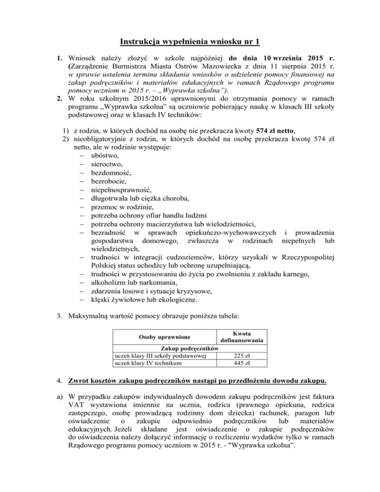 Instrukcja wypełnienia wniosku nr 1 1. Wniosek należy złożyć w szkole najpóźniej do dnia 10 września 2015 r. (Zarządzenie Burmistrza Miasta Ostrów Mazowiecka z dnia 11 sierpnia 2015 r. w sprawie ustalenia terminu składania wniosków o udzielenie pomocy finansowej na zakup podręczników i materiałów edukacyjnych w ramach Rządowego programu pomocy uczniom w 2015 r. – „Wyprawka szkolna”). 2. W roku szkolnym 2015/2016 uprawnionymi do otrzymania pomocy w ramach programu „Wyprawka szkolna” są uczniowie pobierający naukę w klasach III szkoły podstawowej oraz w klasach IV techników: 1) z rodzin, w których dochód na osobę nie przekracza kwoty 574 zł netto, 2) nieobligatoryjnie z rodzin, w których dochód na osobę przekracza kwotę 574 zł netto, ale w rodzinie występuje: ubóstwo, sieroctwo, bezdomność, bezrobocie, niepełnosprawność, długotrwała lub ciężka choroba, przemoc w rodzinie, potrzeba ochrony ofiar handlu ludźmi potrzeba ochrony macierzyństwa lub wielodzietności, bezradność w sprawach opiekuńczo-wychowawczych i prowadzenia gospodarstwa domowego, zwłaszcza w rodzinach niepełnych lub wielodzietnych, trudności w integracji cudzoziemców, którzy uzyskali w Rzeczypospolitej Polskiej status uchodźcy lub ochronę uzupełniającą, trudności w przystosowaniu do życia po zwolnieniu z zakładu karnego, alkoholizm lub narkomania, zdarzenia losowe i sytuacje kryzysowe, klęski żywiołowe lub ekologiczne. 3. Maksymalną wartość pomocy obrazuje poniższa tabela: Osoby uprawnione Zakup podręczników uczeń klasy III szkoły podstawowej uczeń klasy IV technikum Kwota dofinansowania 225 zł 445 zł 4. Zwrot kosztów zakupu podręczników nastąpi po przedłożeniu dowodu zakupu. a) W przypadku zakupów indywidualnych dowodem zakupu podręczników jest faktura VAT wystawiona imiennie na ucznia, rodzica (prawnego opiekuna, rodzica zastępczego, osobę prowadzącą rodzinny dom dziecka) rachunek, paragon lub oświadczenie o zakupie odpowiednio podręczników lub materiałów edukacyjnych. Jeżeli składane jest oświadczenie o zakupie podręczników do oświadczenia należy dołączyć informację o rozliczeniu wydatków tylko w ramach Rządowego programu pomocy uczniom w 2015 r. - "Wyprawka szkolna”. b) W przypadku zakupu podręczników dla grupy uczniów koszty zakupu podręczników lub materiałów edukacyjnych zwracane są rodzicom uczniów (prawnym opiekunom, rodzicom zastępczym, osobom prowadzącym rodzinny dom dziecka) albo pełnoletnim uczniom po przedłożeniu potwierdzenia zakupu zawierającego w szczególności: imię i nazwisko ucznia, nazwę i adres szkoły, klasę, do której uczeń będzie uczęszczał, wykaz zakupionych podręczników lub materiałów edukacyjnych, kwotę zakupu, datę zakupu i czytelny podpis osoby dokonującej zakupu (np. przedstawiciela rady rodziców). Potwierdzenie wystawia podmiot dokonujący zakupu (np. rada rodziców), na podstawie faktury VAT i listy uczniów, dla których zakupiono podręczniki i materiały edukacyjne.