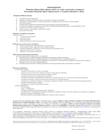 OGŁOSZENIE Burmistrz Miasta Koła ogłasza nabór na wolne stanowisko urzędnicze Naczelnika Wydziału Spraw Społecznych w Urzędzie Miejskim w Kole. Niezbędne kwalifikacje kandydata: a) b) c) d) e) f) g) h) i) wykształcenie wyŜsze magisterskie; posiadanie co najmniej 5 letniego staŜu pracy w jednostkach samorządu terytorialnego; wykształcenie oraz doświadczenie w realizowaniu projektów współfinansowanych ze środków Unii Europejskiej; obywatelstwo polskie; posiadanie pełnej zdolności do czynności prawnych oraz korzystanie z pełni praw publicznych; stan zdrowia pozwalający na zatrudnienie na stanowisku Naczelnika Wydziału Spraw Społecznych w Urzędzie Miejskim w Kole; uregulowany stosunek do słuŜby wojskowej; osoba nie karana za przestępstwo popełnione umyślnie; nieposzlakowana opinia. Dodatkowe kwalifikacje kandydata: Znajomość ustaw: a) o świadczeniach rodzinnych; b) o systemie oświaty ; c) Karta Nauczyciela; d) znajomość obsługi urządzeń informatycznych. Predyspozycje osobowościowe kandydata: a) zdolności organizacyjne, odpowiedzialność, systematyczność, b) wysoka kultura osobista, odporność na stres, dyspozycyjność; c) rzetelność, dokładność, umiejętność zachowania dyskrecji, komunikatywność; d) umiejętność analizy spraw i ich oceny; e) umiejętność rozwiązywania problemów. Zakres wykonywanych zadań na stanowisku: kierowanie wydziałem Spraw Społecznych, a w szczególności: a) prowadzenie spraw z zasiłkami rodzinnymi, świadczeniami opiekuńczymi, zasiłkami rodzinnymi; b) świadczeniami alimentacyjnymi, dodatkami mieszkaniowymi , świadczeniami pomocy materialnej dla uczniów; c) prowadzenie spraw związanych z poŜytkiem publicznym, ochroną zdrowia , pomocą społeczną, profilaktyką i rozwiązywaniem problemów uzaleŜnień oraz pomocą osobom niepełnosprawnym; d) Prowadzenie spraw związanych z realizacją zadań Gminy jako organu prowadzącego dla szkół, gimnazjów i przedszkoli. Dokumenty aplikacyjne : a) dokumenty wymagane: wypełniony kwestionariusz osobowy z fotografią; kopia pierwszych stron dowodu osobistego lub kopia nowego dowodu osobistego; kserokopie świadectw pracy potwierdzające wymagany staŜ pracy; kserokopie dokumentów potwierdzających wykształcenie; oświadczenie kandydata o posiadaniu pełnej zdolności do czynności prawnych oraz o korzystaniu z pełni praw publicznych; zaświadczenie lekarskie o braku przeciwwskazań zdrowotnych do wykonywania pracy; oświadczenie, Ŝe kandydat nie był karany za przestępstwo popełnione umyślnie i nie toczy się przeciwko niemu postępowanie karne; posiadane referencje, opinie, certyfikaty; oświadczenie o posiadaniu nieposzlakowanej opinii; b) dokumenty dodatkowe: list motywacyjny; Ŝyciorys — curriculum vitae; kserokopie zaświadczeń o ukończonych kursach, szkoleniach; inne dokumenty, w szczególności potwierdzające umiejętności i osiągnięcia zawodowe, stanowiące podstawę do korzystania ze szczególnych uprawnień w zakresie stosunku pracy i inne; kserokopia dokumentu potwierdzająca uregulowany stosunek do słuŜby wojskowej. Wymagane dokumenty aplikacyjne naleŜy składać w zamkniętej kopercie z napisem „Nabór na wolne stanowisko urzędnicze Naczelnika Wydziału Spraw Społecznych w Urzędzie Miejskim w Kole” w sekretariacie Urzędu Miejskiego w Kole, ul. Mickiewicza 12 - p. nr 9 (parter) w godzinach pracy Urzędu, lub przesłać pocztą na adres: Urząd Miejski w Kole, 62 – 600 Koło, ul. Mickiewicza 12 z dopiskiem „Nabór na wolne stanowisko urzędnicze Naczelnika Wydziału Spraw Społecznych w Urzędzie Miejskim w Kole” w terminie do dnia 20.06.2007r. (w przypadku przesłania aplikacji pocztą liczy się data stempla pocztowego). Aplikacje przesłane drogą elektroniczną oraz aplikacje, które wpłyną do Urzędu Miejskiego w Kole niekompletne lub po określonym wyŜej terminie, nie będą rozpatrywane. Lista kandydatów spełniających wymagania formalne będzie umieszczona w Biuletynie Informacji Publicznej - (www.bip.kolo.pl w dziale „Urząd Miejski w Kole/Oferty pracy") oraz na tablicy informacyjnej w Urzędzie Miejskim w Kole ul. Mickiewicza 12 - na półpiętrze budynku w gablocie „Ogłoszenia”. Wyniki postępowania kwalifikacyjnego zostaną ogłoszone w Biuletynie Informacji Publicznej - (www.bip.kolo.pl w dziale „Urząd Miejski w Kole/Oferty pracy") oraz na tablicy informacyjnej w Urzędzie Miejskim w Kole ul. Mickiewicza 12 - na półpiętrze budynku w gablocie „Ogłoszenia” Dokumenty aplikacyjne: kwestionariusz osobowy, list motywacyjny, CV (z uwzględnieniem dokładnego przebiegu kariery zawodowej) powinny być opatrzone klauzulą: „WyraŜam zgodę na przetwarzanie moich danych osobowych zawartych w ofercie pracy dla potrzeb niezbędnych do realizacji procesu rekrutacji zgodnie z ustawą z dnia 29.08.1997r. o ochronie danych osobowych (tj. z 2002r. Dz.U.Nr 101 poz.926 z późn. zm.) oraz ustawą z dnia 22.03.1990r. o pracownikach samorządowych (tj. z 2001r. Dz.U.Nr 142 poz. 1593 z późn. zm.). Burmistrz Miasta Koła Mieczysław DroŜdŜewski