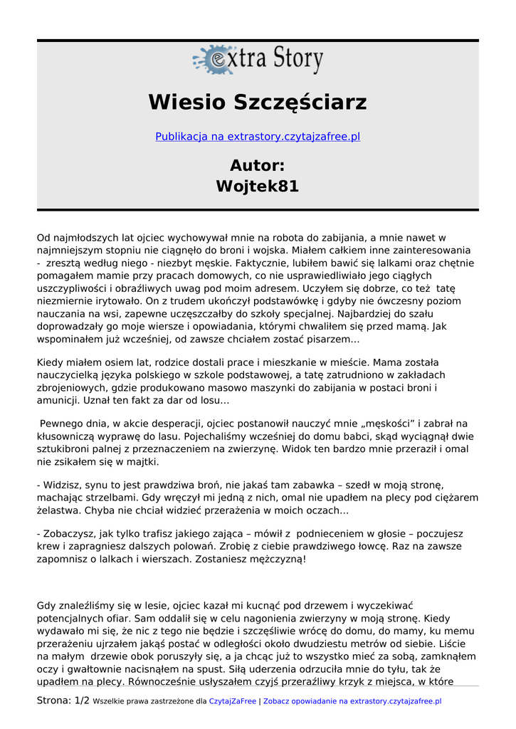 Wiesio Szczęściarz Publikacja na extrastory.czytajzafree.pl Autor: Wojtek81 Od najmłodszych lat ojciec wychowywał mnie na robota do zabijania, a mnie nawet w najmniejszym stopniu nie ciągnęło do broni i wojska. Miałem całkiem inne zainteresowania - zresztą według niego - niezbyt męskie. Faktycznie, lubiłem bawić się lalkami oraz chętnie pomagałem mamie przy pracach domowych, co nie usprawiedliwiało jego ciągłych uszczypliwości i obraźliwych uwag pod moim adresem. Uczyłem się dobrze, co też tatę niezmiernie irytowało. On z trudem ukończył podstawówkę i gdyby nie ówczesny poziom nauczania na wsi, zapewne uczęszczałby do szkoły specjalnej. Najbardziej do szału doprowadzały go moje wiersze i opowiadania, którymi chwaliłem się przed mamą. Jak wspominałem już wcześniej, od zawsze chciałem zostać pisarzem… Kiedy miałem osiem lat, rodzice dostali prace i mieszkanie w mieście. Mama została nauczycielką języka polskiego w szkole podstawowej, a tatę zatrudniono w zakładach zbrojeniowych, gdzie produkowano masowo maszynki do zabijania w postaci broni i amunicji. Uznał ten fakt za dar od losu… Pewnego dnia, w akcie desperacji, ojciec postanowił nauczyć mnie „męskości” i zabrał na kłusowniczą wyprawę do lasu. Pojechaliśmy wcześniej do domu babci, skąd wyciągnął dwie sztukibroni palnej z przeznaczeniem na zwierzynę. Widok ten bardzo mnie przeraził i omal nie zsikałem się w majtki. - Widzisz, synu to jest prawdziwa broń, nie jakaś tam zabawka – szedł w moją stronę, machając strzelbami. Gdy wręczył mi jedną z nich, omal nie upadłem na plecy pod ciężarem żelastwa. Chyba nie chciał widzieć przerażenia w moich oczach… - Zobaczysz, jak tylko trafisz jakiego zająca – mówił z podnieceniem w głosie – poczujesz krew i zapragniesz dalszych polowań. Zrobię z ciebie prawdziwego łowcę. Raz na zawsze zapomnisz o lalkach i wierszach. Zostaniesz mężczyzną! Gdy znaleźliśmy się w lesie, ojciec kazał mi kucnąć pod drzewem i wyczekiwać potencjalnych ofiar. Sam oddalił się w celu nagonienia zwierzyny w moją stronę. Kiedy wydawało mi się, że nic z tego nie będzie i szczęśliwie wrócę do domu, do mamy, ku memu przerażeniu ujrzałem jakąś postać w odległości około dwudziestu metrów od siebie. Liście na małym drzewie obok poruszyły się, a ja chcąc już to wszystko mieć za sobą, zamknąłem oczy i gwałtownie nacisnąłem na spust. Siłą uderzenia odrzuciła mnie do tyłu, tak że upadłem na plecy. Równocześnie usłyszałem czyjś przeraźliwy krzyk z miejsca, w które Strona: 1/2 Wszelkie prawa zastrzeżone dla CzytajZaFree | Zobacz opowiadanie na extrastory.czytajzafree.pl skierowałem swój wystrzał. Jak się później okazało, to ojczulek wracał z nagonki i omal nie oberwał ode mnie kulą w głowę. Wystrzał trafił w drzewo i tacie oparzyło tylko lekko prawy policzek. Od tamtej pory nie dawał mi spokoju: - Jesteś prawdziwym mężczyzną, wychowałem prawdziwego wojownika – zacierał ręce. – Co tam króliczki, ty wolisz ludzką krew! Poczekaj spokojnie, jakaś wojna się zrodzi i zrealizujesz swoje marzenia na prawdziwych wrogach! Wróciliśmy wieczorem, kiedy ojca opatrzono w szpitalu, gdzie zachowywał się jak bohater wojenny po powrocie z frontu. Zagadywał cały personel medyczny wymyślonymi historiami dowódcy korpusu wojsk lądowych. Chyba mieli już go dosyć, bo zabieg bandażowania części twarzy odbył się w błyskawicznym tempie niczym zmiana opon w Formule pierwszej. Oczywiście nie widział mojego płaczu. W trakcie całej wycieczki niczego tak bardzo nie pragnąłem, jak uciec do domu i przelać swoje uczucia na papier. Tego dnia szczerze znienawidziłem ojca, niestety bez wzajemności. Traumatyczne przeżycia bywały w moim życiu inspiracją do tworzenia tekstów. Kilka lat później napisałem ciekawe opowiadanie pt. „Morderczy królik”. Akcja działa się w spokojnej wsi z kilkoma domami, gdzie ludzie żyli spokojnie od lat. Pewnego dnia ich sielankę zakłócił wściekły królik, atakujący i zagryzający całą zwierzynę domową. Mieszkańców wioski tak ten fakt rozwścieczył, że wyciągnęli dawno nie używane strzelby i ruszyli do lasu w poszukiwaniu oprawcy. W kilka dni wytłukli wszystkie zające, żyjące w promieniu dwóch kilometrów od wioski. Zorientowali się, że to im nie wystarcza – poczuli, że zabijanie jest niezłą rozrywką. Od tego momentu mordowali każde napotkane na swojej drodze żywe stworzenie. Trwało to do czasu, gdy zabrakło zwierząt w okolicznym lesie i jeden z gospodarzy zastrzelił jadącego na rowerze listonosza. Strona: 2/2 Wszelkie prawa zastrzeżone dla CzytajZaFree | Zobacz opowiadanie na extrastory.czytajzafree.pl