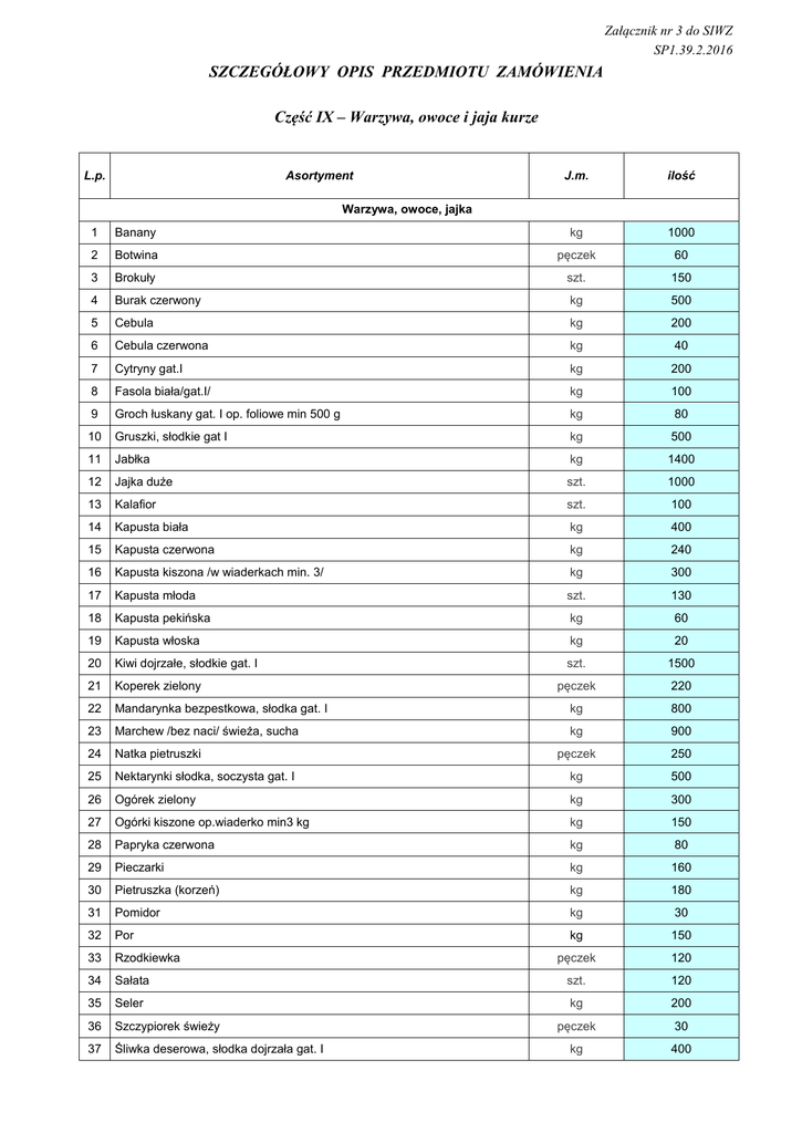 Załącznik nr 3 do SIWZ SP1.39.2.2016 SZCZEGÓŁOWY OPIS PRZEDMIOTU ZAMÓWIENIA Część IX – Warzywa, owoce i jaja kurze L.p. Asortyment J.m. ilość Warzywa, owoce, jajka 1 Banany kg 1000 2 Botwina pęczek 60 3 Brokuły szt. 150 4 Burak czerwony kg 500 5 Cebula kg 200 6 Cebula czerwona kg 40 7 Cytryny gat.I kg 200 8 Fasola biała/gat.I/ kg 100 9 Groch łuskany gat. I op. foliowe min 500 g kg 80 10 Gruszki, słodkie gat I kg 500 11 Jabłka kg 1400 12 Jajka duże szt. 1000 13 Kalafior szt. 100 14 Kapusta biała kg 400 15 Kapusta czerwona kg 240 16 Kapusta kiszona /w wiaderkach min. 3/ kg 300 17 Kapusta młoda szt. 130 18 Kapusta pekińska kg 60 19 Kapusta włoska kg 20 20 Kiwi dojrzałe, słodkie gat. I szt. 1500 21 Koperek zielony pęczek 220 22 Mandarynka bezpestkowa, słodka gat. I kg 800 23 Marchew /bez naci/ świeża, sucha kg 900 24 Natka pietruszki pęczek 250 25 Nektarynki słodka, soczysta gat. I kg 500 26 Ogórek zielony kg 300 27 Ogórki kiszone op.wiaderko min3 kg kg 150 28 Papryka czerwona kg 80 29 Pieczarki kg 160 30 Pietruszka (korzeń) kg 180 31 Pomidor kg 30 32 Por kg 150 33 Rzodkiewka pęczek 120 34 Sałata szt. 120 35 Seler kg 200 36 Szczypiorek świeży pęczek 30 37 Śliwka deserowa, słodka dojrzała gat. I kg 400 38 Truskawki kg 80 39 Ziemniaki jadalne, nie zielone, czyste, suche nienadmarznięte kg 8000 40 Ziemniaki młode (dostawa czerwiec – lipiec) kg 400