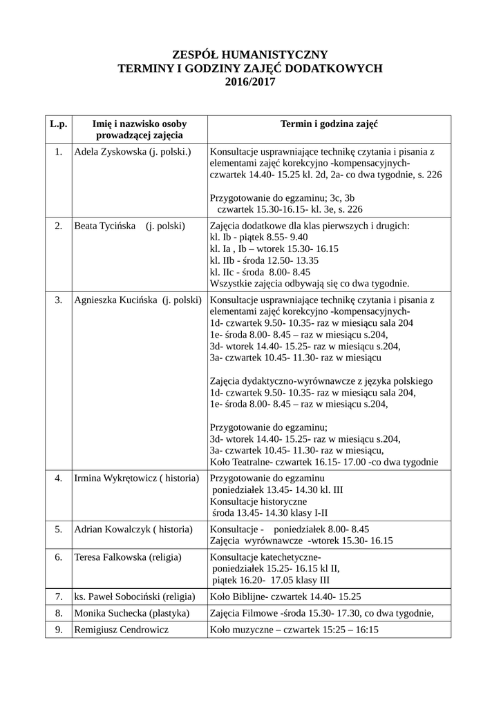 ZESPÓŁ HUMANISTYCZNY TERMINY I GODZINY ZAJĘĆ DODATKOWYCH 2016/2017 L.p. 1. Imię i nazwisko osoby prowadzącej zajęcia Adela Zyskowska (j. polski.) Termin i godzina zajęć Konsultacje usprawniające technikę czytania i pisania z elementami zajęć korekcyjno -kompensacyjnychczwartek 14.40- 15.25 kl. 2d, 2a- co dwa tygodnie, s. 226 Przygotowanie do egzaminu; 3c, 3b czwartek 15.30-16.15- kl. 3e, s. 226 2. Beata Tycińska (j. polski) Zajęcia dodatkowe dla klas pierwszych i drugich: kl. Ib - piątek 8.55- 9.40 kl. Ia , Ib – wtorek 15.30- 16.15 kl. IIb - środa 12.50- 13.35 kl. IIc - środa 8.00- 8.45 Wszystkie zajęcia odbywają się co dwa tygodnie. 3. Agnieszka Kucińska (j. polski) Konsultacje usprawniające technikę czytania i pisania z elementami zajęć korekcyjno -kompensacyjnych1d- czwartek 9.50- 10.35- raz w miesiącu sala 204 1e- środa 8.00- 8.45 – raz w miesiącu s.204, 3d- wtorek 14.40- 15.25- raz w miesiącu s.204, 3a- czwartek 10.45- 11.30- raz w miesiącu Zajęcia dydaktyczno-wyrównawcze z języka polskiego 1d- czwartek 9.50- 10.35- raz w miesiącu sala 204, 1e- środa 8.00- 8.45 – raz w miesiącu s.204, Przygotowanie do egzaminu; 3d- wtorek 14.40- 15.25- raz w miesiącu s.204, 3a- czwartek 10.45- 11.30- raz w miesiącu, Koło Teatralne- czwartek 16.15- 17.00 -co dwa tygodnie 4. Irmina Wykrętowicz ( historia) Przygotowanie do egzaminu poniedziałek 13.45- 14.30 kl. III Konsultacje historyczne środa 13.45- 14.30 klasy I-II 5. Adrian Kowalczyk ( historia) Konsultacje - poniedziałek 8.00- 8.45 Zajęcia wyrównawcze -wtorek 15.30- 16.15 6. Teresa Falkowska (religia) Konsultacje katechetyczneponiedziałek 15.25- 16.15 kl II, piątek 16.20- 17.05 klasy III 7. ks. Paweł Sobociński (religia) Koło Biblijne- czwartek 14.40- 15.25 8. Monika Suchecka (plastyka) Zajęcia Filmowe -środa 15.30- 17.30, co dwa tygodnie, 9. Remigiusz Cendrowicz Koło muzyczne – czwartek 15:25 – 16:15