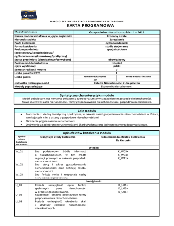 MAŁOP OLSKA WYŻSZ A SZ KOŁA E KONOMICZNA W TARN OW IE KARTA PROGRAMOWA Moduł kształcenia Gospodarka nieruchomościami – M11 Nazwa modułu kształcenia w języku angielskim Kierunek studiów Profil kształcenia Forma kształcenia Poziom przedmiotu (podstawowy/specjalnościowy/ ogólnouczelniany/kierunkowy/praktyczny) Status przedmiotu (obowiązkowy/do wyboru) Poziom modułu kształcenia Język wykładowy Semestr realizacji modułu Liczba punktów ECTS Liczba godzin Economy estate Zarządzanie ogólnoakademicki studia stacjonarne specjalnościowy obowiązkowy I stopień polski V 1 Forma modułu: wykład Forma modułu: ćwiczenia 20 Katedra Nieruchomości i Ubezpieczeń Ekonomika nieruchomości Jednostka realizująca moduł Moduły poprzedzające Syntetyczna charakterystyka modułu Moduł poświęcony jest tematyce związanej z szeroko rozumianym zagadnieniem gospodarki nieruchomości. Słowa kluczowe: zasób nieruchomości, formy gospodarowania nieruchomościami, gospodarka mieszkaniowa. Cele modułu Zapoznanie z wiedzą teoretyczną i praktyczną w zakresie zasad gospodarowania nieruchomościami w Polsce, wynikających m.in. z ustawy o gospodarce nieruchomościami. Określenie pojęcia zasobu nieruchomości. Omówienie zasad obrotu nieruchomościami Skarbu Państwa oraz jednostek samorządu terytorialnego. Opis efektów kształcenia modułu Symbol efektu kształcenia dla modułu Osiągnięte efekty kształcenia Odniesienie do efektów kształcenia dla kierunku Wiedza: W_01 W_02 W_03 U_01 U_02 U_03 Zna podstawowe źródła informacji o nieruchomościach, w tym źródła regulacji prawnych w zakresie gospodarki nieruchomościami. Zna istotę i zakres gospodarowania nieruchomościami oraz definicję zasobu nieruchomości. Zna funkcje rynku i rozpoznaje cechy nieruchomości jako towaru. Umiejętności: Posiada umiejętność opisu funkcji spełnianych przez nieruchomości w procesie gospodarowania. Rozpoznaje i objaśnia podstawowe formy gospodarowania nieruchomościami. Posiada umiejętność określenia skali i struktury zasobów nieruchomości mieszkaniowych. K_W03+ K_W04+ K_W11+ K_U01+ K_U02+ K_U06+ K_01 K_02 Kompetencje społeczne: Jest przygotowany do umiejętnego analizowania i podejmowania decyzji co do wyboru korzystnych form gospodarowania nieruchomości. Ma świadomość postępowania etycznego w ocenie form gospodarowania nieruchomościami. K_K04++ K_K05+ K_U07+ Treści kształcenia modułu Forma modułu: wykład Forma modułu: ćwiczenia 1. Istota i zakres gospodarowania nieruchomościami. 2. Zasobowe i strumieniowe ujęcie nieruchomości w gospodarce nieruchomościami. 3. Nieruchomość jako przedmiot gospodarowania. 4. Funkcje nieruchomości. 5. Źródła informacji o nieruchomościach: - Źródła prawa miejscowego, - Sądy wieczysto księgowe, księgi wieczyste, - Kataster nieruchomości, - Ewidencja sieci uzbrojenia terenu i mapa zasadnicza. 6. Formy gospodarowania nieruchomościami – dochody. 7. Nieruchomość jako przedmiot obrotu – wartość i cena nieruchomości. Nieruchomość jako towar. 8. Gospodarka zasobami mieszkaniowymi. Polityk mieszkaniowa Państwa. Gospodarowanie nieruchomościami mieszkalnymi Skarbu Państwa i jednostek samorządu terytorialnego. 9. Kompetencje organów administracji publicznej w zakresie gospodarowania nieruchomościami. 10. Prawo spółdzielcze. Literatura podstawowa Literatura uzupełniająca B. Wierzchowski, Gospodarka nieruchomościami. Podstawy prawne, Wydawnictwo LexisNexis Polska, Warszawa 2014 rok; M.W. Wierzchowski, Gospodarowanie gruntami w polskich miastach, Wydawnictwo Instytut Rozwoju Miast, Kraków 2011 rok; E. Kucharska-Stasiak, Nieruchomości w gospodarce rynkowej, Wydawnictwo Naukowe PWN, Warszawa 2012 rok; R. Cymerman, Gospodarka nieruchomościami, Wydawnictwo Uczelniane Politechniki Koszalińskiej, Koszalin 2009 rok. R. Wiśniewski, Gospodarowanie gminnymi zasobami nieruchomości, Wydawnictwo Uniwersytetu Warmińsko-Mazurskiego, Olsztyn 2008 rok; S. Źróbek, R. Źróbek, Gospodarka nieruchomościami z komentarzem do wybranych procedur, Wydawnictwo Gall, Katowice 2006 rok; Gospodarowanie tarnowskimi nieruchomościami. Konferencja w Tarnowie, Wydawnictwo MWSE w Tarnowie, Katedra Nieruchomości i Ubezpieczeń, Tarnów 2006 rok; R. Wiśniewski (red), Gospodarowanie gminnymi zasobami nieruchomości, Wydawnictwo Uniwersytetu Warmiński-Mazurskiego, Olsztyn 2008 rok; S. Belniak, M. Wierzchowski, Źródła informacji o nieruchomościach, Wydawnictwo MWSE w Tarnowie, Tarnów 2005 rok; M. Bac, Zagospodarowanie nieruchomości poprzemysłowych na cele mieszkaniowe i komercyjne na przykładzie loftów, Zeszyt Naukowy MWSE w Tarnowie, nr 2(21), s. 9 – 24, Wyd. MWSE w Tarnowie, Tarnów 2012 rok, (dostęp: http://zn.mwse.edu.pl/marzena-bac-zagospodarowanie-nieruchomosci- poprzemyslowych-na-cele-mieszkaniowe-i-komercyjne-na-przykladzie-loftow/); Periodyk: Świat Nieruchomości, Wyd. UE w Krakowie Ustawa z dnia 21 sierpnia 1997 roku o gospodarce nieruchomościami (Dz.U. Nr 261, poz. 2603). Metody dydaktyczne Wykład: metoda tradycyjna z wykorzystaniem metod audiowizualnych analiza przypadku, dyskusja, case study