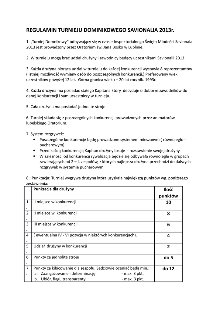 REGULAMIN TURNIEJU DOMINIKOWEGO SAVIONALIA 2013r.