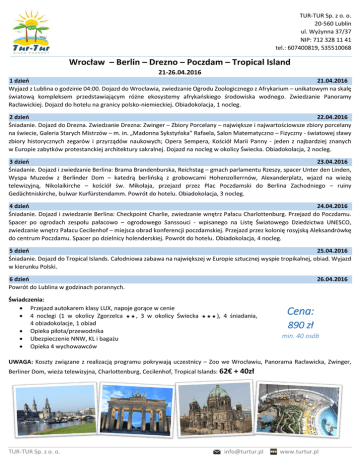 TUR-TUR Sp. z o. o. 20-560 Lublin ul. Wyżynna 37/37 NIP: 712 328 11 41 tel.: 607400819, 535510068 Wrocław – Berlin – Drezno – Poczdam – Tropical Island 21-26.04.2016 1 dzień 21.04.2016 Wyjazd z Lublina o godzinie 04:00. Dojazd do Wrocławia, zwiedzanie Ogrodu Zoologicznego z Afrykarium – unikatowym na skalę światową kompleksem przedstawiającym różne ekosystemy afrykańskiego środowiska wodnego. Zwiedzanie Panoramy Racławickiej. Dojazd do hotelu na granicy polsko-niemieckiej. Obiadokolacja, 1 nocleg. 2 dzień 22.04.2016 Śniadanie. Dojazd do Drezna. Zwiedzanie Drezna: Zwinger – Zbiory Porcelany – największe i najwartościowsze zbiory porcelany na świecie, Galeria Starych Mistrzów – m. in. „Madonna Sykstyńska” Rafaela, Salon Matematyczno – Fizyczny - światowej sławy zbiory historycznych zegarów i przyrządów naukowych; Opera Sempera, Kościół Marii Panny - jeden z najbardziej znanych w Europie zabytków protestanckiej architektury sakralnej. Dojazd na nocleg w okolicy Świecka. Obiadokolacja, 2 nocleg. 3 dzień 23.04.2016 Śniadanie. Dojazd i zwiedzanie Berlina: Brama Brandenburska, Reichstag – gmach parlamentu Rzeszy, spacer Unter den Linden, Wyspa Muzeów z Berlinder Dom – katedrą berlińską z grobowcami Hohenzollerrnów, Alexanderplatz, wjazd na wieżę telewizyjną, Nikolaikirche – kościół św. Mikołaja, przejazd przez Plac Poczdamski do Berlina Zachodniego – ruiny Gedächtniskirche, bulwar Kurfürstendamm. Powrót do hotelu. Obiadokolacja, 3 nocleg. 4 dzień 24.04.2016 Śniadanie. Dojazd i zwiedzanie Berlina: Checkpoint Charlie, zwiedzanie wnętrz Pałacu Charlottenburg. Przejazd do Poczdamu. Spacer po ogrodach zespołu pałacowo – ogrodowego Sanssouci - wpisanego na Listę Światowego Dziedzictwa UNESCO, zwiedzanie wnętrz Pałacu Cecilenhof – miejsca obrad konferencji poczdamskiej. Przejazd przez kolonię rosyjską Aleksandrówkę do centrum Poczdamu. Spacer po dzielnicy holenderskiej. Powrót do hotelu. Obiadokolacja, 4 nocleg. 5 dzień 25.04.2016 Śniadanie. Dojazd do Tropical Islands. Całodniowa zabawa na największej w Europie sztucznej wyspie tropikalnej, obiad. Wyjazd w kierunku Polski. 6 dzień Powrót do Lublina w godzinach porannych. Świadczenia: Przejazd autokarem klasy LUX, napoje gorące w cenie 4 noclegi (1 w okolicy Zgorzelca ★ ★ , 3 w okolicy Świecka 4 obiadokolacje, 1 obiad Opieka pilota/przewodnika Ubezpieczenie NNW, KL i bagażu Opieka 4 wychowawców 26.04.2016 ★ ★ ★ ), 4 śniadania, Cena: 890 zł min. 40 osób UWAGA: Koszty związane z realizacją programu pokrywają uczestnicy – Zoo we Wrocławiu, Panorama Racławicka, Zwinger, Berliner Dom, wieża telewizyjna, Charlottenburg, Cecilenhof, Tropical Islands: 62€ + 40zł TUR-TUR Sp. z o. o. [email protected] www.turtur.pl