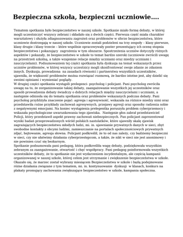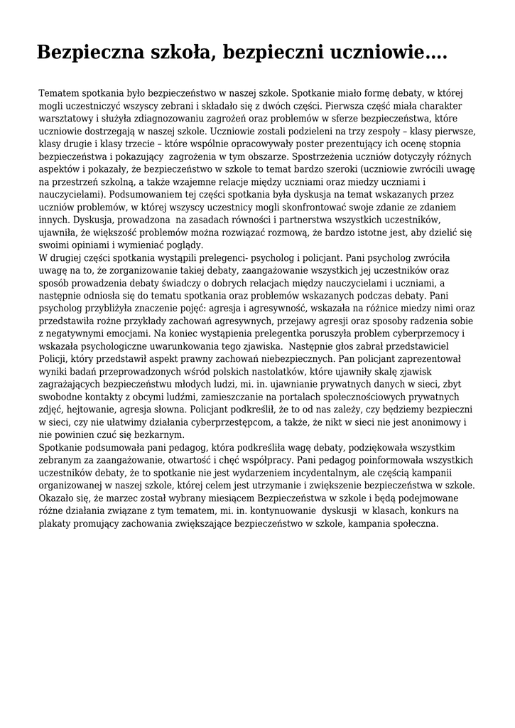 Bezpieczna szkoła, bezpieczni uczniowie…. Tematem spotkania było bezpieczeństwo w naszej szkole. Spotkanie miało formę debaty, w której mogli uczestniczyć wszyscy zebrani i składało się z dwóch części. Pierwsza część miała charakter warsztatowy i służyła zdiagnozowaniu zagrożeń oraz problemów w sferze bezpieczeństwa, które uczniowie dostrzegają w naszej szkole. Uczniowie zostali podzieleni na trzy zespoły – klasy pierwsze, klasy drugie i klasy trzecie – które wspólnie opracowywały poster prezentujący ich ocenę stopnia bezpieczeństwa i pokazujący zagrożenia w tym obszarze. Spostrzeżenia uczniów dotyczyły różnych aspektów i pokazały, że bezpieczeństwo w szkole to temat bardzo szeroki (uczniowie zwrócili uwagę na przestrzeń szkolną, a także wzajemne relacje między uczniami oraz miedzy uczniami i nauczycielami). Podsumowaniem tej części spotkania była dyskusja na temat wskazanych przez uczniów problemów, w której wszyscy uczestnicy mogli skonfrontować swoje zdanie ze zdaniem innych. Dyskusja, prowadzona na zasadach równości i partnerstwa wszystkich uczestników, ujawniła, że większość problemów można rozwiązać rozmową, że bardzo istotne jest, aby dzielić się swoimi opiniami i wymieniać poglądy. W drugiej części spotkania wystąpili prelegenci- psycholog i policjant. Pani psycholog zwróciła uwagę na to, że zorganizowanie takiej debaty, zaangażowanie wszystkich jej uczestników oraz sposób prowadzenia debaty świadczy o dobrych relacjach między nauczycielami i uczniami, a następnie odniosła się do tematu spotkania oraz problemów wskazanych podczas debaty. Pani psycholog przybliżyła znaczenie pojęć: agresja i agresywność, wskazała na różnice miedzy nimi oraz przedstawiła rożne przykłady zachowań agresywnych, przejawy agresji oraz sposoby radzenia sobie z negatywnymi emocjami. Na koniec wystąpienia prelegentka poruszyła problem cyberprzemocy i wskazała psychologiczne uwarunkowania tego zjawiska. Następnie głos zabrał przedstawiciel Policji, który przedstawił aspekt prawny zachowań niebezpiecznych. Pan policjant zaprezentował wyniki badań przeprowadzonych wśród polskich nastolatków, które ujawniły skalę zjawisk zagrażających bezpieczeństwu młodych ludzi, mi. in. ujawnianie prywatnych danych w sieci, zbyt swobodne kontakty z obcymi ludźmi, zamieszczanie na portalach społecznościowych prywatnych zdjęć, hejtowanie, agresja słowna. Policjant podkreślił, że to od nas zależy, czy będziemy bezpieczni w sieci, czy nie ułatwimy działania cyberprzestępcom, a także, że nikt w sieci nie jest anonimowy i nie powinien czuć się bezkarnym. Spotkanie podsumowała pani pedagog, która podkreśliła wagę debaty, podziękowała wszystkim zebranym za zaangażowanie, otwartość i chęć współpracy. Pani pedagog poinformowała wszystkich uczestników debaty, że to spotkanie nie jest wydarzeniem incydentalnym, ale częścią kampanii organizowanej w naszej szkole, której celem jest utrzymanie i zwiększenie bezpieczeństwa w szkole. Okazało się, że marzec został wybrany miesiącem Bezpieczeństwa w szkole i będą podejmowane różne działania związane z tym tematem, mi. in. kontynuowanie dyskusji w klasach, konkurs na plakaty promujący zachowania zwiększające bezpieczeństwo w szkole, kampania społeczna.