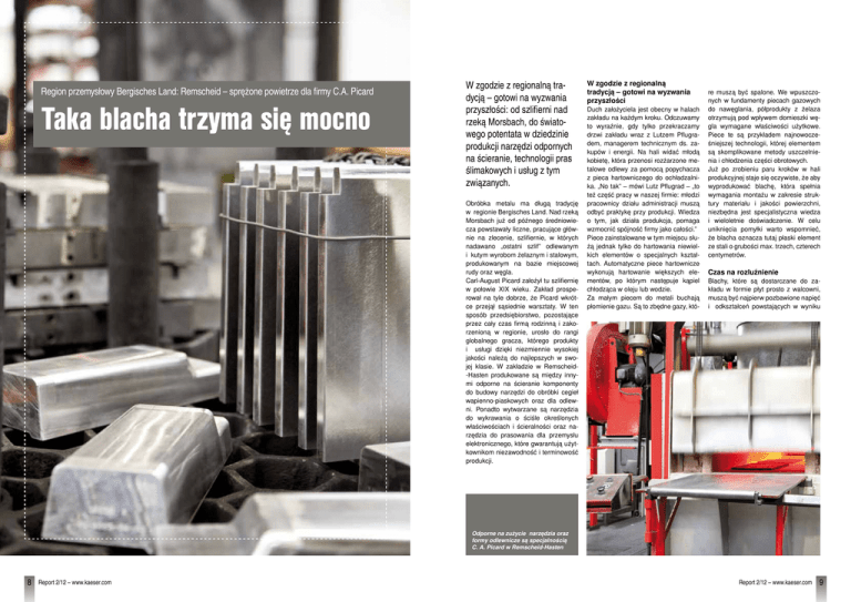 Region przemysłowy Bergisches Land: Remscheid – sprężone powietrze dla firmy C.A. Picard Taka blacha trzyma się mocno W zgodzie z regionalną tradycją – gotowi na wyzwania przyszłości: od szlifierni nad rzeką Morsbach, do światowego potentata w dziedzinie produkcji narzędzi odpornych na ścieranie, technologii pras ślimakowych i usług z tym związanych. Obróbka metalu ma długą tradycję w regionie Bergisches Land. Nad rzeką Morsbach już od późnego średniowiecza powstawały liczne, pracujące głównie na zlecenie, szlifiernie, w których nadawano „ostatni szlif” odlewanym i kutym wyrobom żelaznym i stalowym, produkowanym na bazie miejscowej rudy oraz węgla. Carl-August Picard założył tu szlifiernię w połowie XIX wieku. Zakład prosperował na tyle dobrze, że Picard wkrótce przejął sąsiednie warsztaty. W ten sposób przedsiębiorstwo, pozostające przez cały czas firmą rodzinną i zakorzenioną w regionie, urosło do rangi globalnego gracza, którego produkty i usługi dzięki niezmiennie wysokiej jakości należą do najlepszych w swojej klasie. W zakładzie w Remscheid-Hasten produkowane są między innymi odporne na ścieranie komponenty do budowy narzędzi do obróbki cegieł wapienno-piaskowych oraz dla odlewni. Ponadto wytwarzane są narzędzia do wykrawania o ściśle określonych właściwościach i ścieralności oraz narzędzia do prasowania dla przemysłu elektronicznego, które gwarantują użytkownikom niezawodność i terminowość produkcji. W zgodzie z regionalną tradycją – gotowi na wyzwania przyszłości Duch założyciela jest obecny w halach zakładu na każdym kroku. Odczuwamy to wyraźnie, gdy tylko przekraczamy drzwi zakładu wraz z Lutzem Pflugradem, managerem technicznym ds. zakupów i energii. Na hali widać młodą kobietę, która przenosi rozżarzone metalowe odlewy za pomocą popychacza z pieca hartowniczego do ochładzalnika. „No tak” – mówi Lutz Pflugrad – „to też część pracy w naszej firmie: młodzi pracownicy działu administracji muszą odbyć praktykę przy produkcji. Wiedza o tym, jak działa produkcja, pomaga wzmocnić spójność firmy jako całości.” Piece zainstalowane w tym miejscu służą jednak tylko do hartowania niewielkich elementów o specjalnych kształtach. Automatyczne piece hartownicze wykonują hartowanie większych elementów, po którym następuje kąpiel chłodząca w oleju lub wodzie. Za małym piecem do metali buchają płomienie gazu. Są to zbędne gazy, któ- re muszą być spalone. We wpuszczonych w fundamenty piecach gazowych do nawęglania, półprodukty z żelaza otrzymują pod wpływem domieszki węgla wymagane właściwości użytkowe. Piece te są przykładem najnowocześniejszej technologii, której elementem są skomplikowane metody uszczelnienia i chłodzenia części obrotowych. Już po zrobieniu paru kroków w hali produkcyjnej staje się oczywiste, że aby wyprodukować blachę, która spełnia wymagania montażu w zakresie struktury materiału i jakości powierzchni, niezbędna jest specjalistyczna wiedza i wieloletnie doświadczenie. W celu uniknięcia pomyłki warto wspomnieć, że blacha oznacza tutaj płaski element ze stali o grubości max. trzech, czterech centymetrów. Czas na rozluźnienie Blachy, które są dostarczane do zakładu w formie płyt prosto z walcowni, muszą być najpierw pozbawione napięć i odkształceń powstających w wyniku Odporne na zużycie narzędzia oraz formy odlewnicze są specjalnością C. A. Picard w Remscheid-Hasten 8 Report 2/12 – www.kaeser.com Report 2/12 – www.kaeser.com 9 Stacja kontraktowa (SAU) umieszczona w hali wytwarza sprężone powietrze między innymi dla centrów szlifierskich posiadających dodatkowo własne zbiorniki (po prawej) indukcji podczas procesu walcowania. Napięte blachy nie dałyby się obrabiać w dokładny sposób do postaci komponentów form do odlewania i prasowania. Do prostowania elementów o grubości do 3,1 mm używa się prostownic, których obsługa również wymaga dużego doświadczenia. Jedynie wykwalifikowany pracownik jest w stanie stwierdzić, czy blacha po wyjściu z prostownicy jest rzeczywiście wolna od odkształceń. Grubsze blachy można prostować jedynie ręcznie. Prostownica ręczna jest wyposażona w wiele kowadeł, na których wyszkoleni pracownicy za pomocą okrągłych i spiczastych młotów prostują stalowe płyty w dokładnie ten sam sposób, w jaki odbywało się to za czasów założyciela zakładu. Umiejętności i doświadczenia pracujących tu ludzi nie jest w stanie zastąpić żadna maszyna. 10 Report 2/12 – www.kaeser.com To samo można powiedzieć o operatorach wielu wyspecjalizowanych stacji szlifierskich. To tutaj blachy uzyskują pożądaną fakturę przed etapem ostatecznej obróbki. Niektóre stacje szlifierskie pracują na zasadzie zapożyczonej z zakładów produkujących płyty wiórowe. Element szlifowany przesuwa się pod maszyną szlifującą napędzaną sprężonym powietrzem, co gwarantuje maksymalną równomierność obróbki. Urządzenia te zużywają najwięcej sprężonego powietrza, dlatego każda z nich wyposażona jest w indywidualny zbiornik na sprężone powietrze umieszczony na górze maszyny. A po wyjściu blachy z maszyny szlifującej znów niezbędne okazuje się wyczucie metalu, tak charakterystyczne dla mieszkańców tego regionu, bo żadna maszyna nie potrafiłaby oczyścić blachy z oleju szlifierskie- go oraz jednocześnie wprawnym okiem i ręką ocenić jakość szlifowania. Sprężone powietrze jest wszechobecne Sprężone powietrze jest niezbędne zarówno przy hartowaniu, szlifowaniu, frezowaniu, jak również przygotowywaniu do transportu. W ten sposób sprężone powietrze ma swój udział we wszystkim, co dzieje się w zakładzie. Tuż obok hartowni znajduje się nowa stacja sprężonego powietrza, na którą składają się: trzy sprężarki śrubowe Kaeser Kompressoren ASK 47 T ze zintegrowanymi, ener