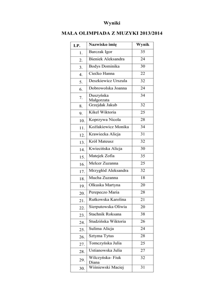 Wyniki MAŁA OLIMPIADA Z MUZYKI 2013/2014