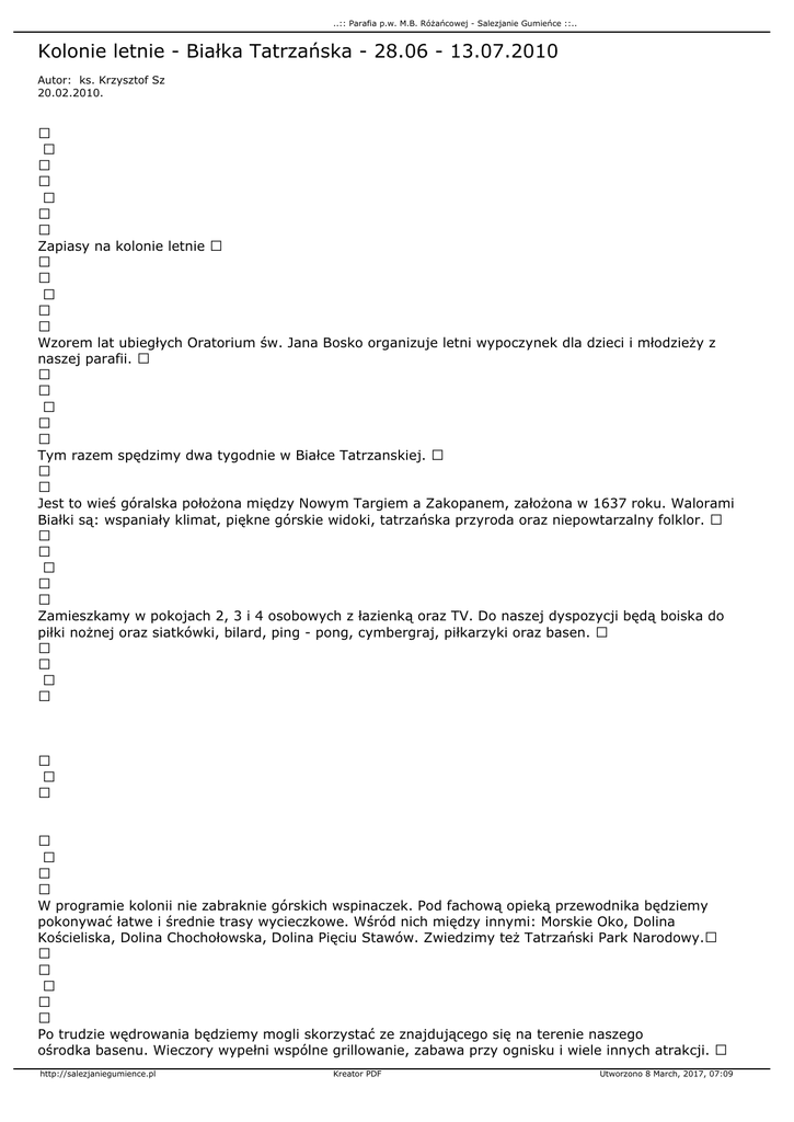 ..:: Parafia p.w. M.B. Różańcowej - Salezjanie Gumieńce ::.. Kolonie letnie - Białka Tatrzańska - 28.06 - 13.07.2010 Autor: ks. Krzysztof Sz 20.02.2010. Zapiasy na kolonie letnie Wzorem lat ubiegłych Oratorium św. Jana Bosko organizuje letni wypoczynek dla dzieci i młodzieży z naszej parafii. Tym razem spędzimy dwa tygodnie w Białce Tatrzanskiej. Jest to wieś góralska położona między Nowym Targiem a Zakopanem, założona w 1637 roku. Walorami Białki są: wspaniały klimat, piękne górskie widoki, tatrzańska przyroda oraz niepowtarzalny folklor. Zamieszkamy w pokojach 2, 3 i 4 osobowych z łazienką oraz TV. Do naszej dyspozycji będą boiska do piłki nożnej oraz siatkówki, bilard, ping - pong, cymbergraj, piłkarzyki oraz basen. W programie kolonii nie zabraknie górskich wspinaczek. Pod fachową opieką przewodnika będziemy pokonywać łatwe i średnie trasy wycieczkowe. Wśród nich między innymi: Morskie Oko, Dolina Kościeliska, Dolina Chochołowska, Dolina Pięciu Stawów. Zwiedzimy też Tatrzański Park Narodowy. Po trudzie wędrowania będziemy mogli skorzystać ze znajdującego się na terenie naszego ośrodka basenu. Wieczory wypełni wspólne grillowanie, zabawa przy ognisku i wiele innych atrakcji. http://salezjaniegumience.pl Kreator PDF Utworzono 8 March, 2017, 07:09 ..:: Parafia p.w. M.B. Różańcowej - Salezjanie Gumieńce ::.. Oczywiście na naszych koloniach odpoczywamy od codzienności, jednak nie od Pana Boga. Będziemy uczestniczyć w Mszach Świętych celebrowanych przez ks. Krzysztofa Szynkowskiego, a każdy dzień powitamy i zakończymy wspólną modlitwą. Całkowity koszt kolonii wynosi 1150 zł. W cenie zawarte są: przejazdy PKP (w tym rezerwacja przedziałów), noclegi, przejazdy autokarem, wyżywienie (4 posiłki dziennie), bilety wstępu, przewodnik górski, ubezpieczenie, płyta CD ze zdjęciami (po powrocie do Szczecina). Więcej szczegółów dotyczących naszej bazy noclegowej można znaleźć klikając na: http://www.bazanoclegi.pl/nocleg/nowobilski_bialka/ Zapisy przyjmuje w Oratorium Pani Ewa Nalewajk. Można też kontaktowac się telefonicznie: 696 - 45 48 - 40. Ilość miejsc jest ograniczona, dlatego w razie zainteresowania prosimy o niezwłoczny kontakt. Ks. Krzysztof Szynkowski http://salezjaniegumience.pl Kreator PDF Utworzono 8 March, 2017, 07:09