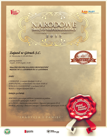 Zajazd w Górach S.C. ul. Kutnowska 23, 09-400 Płock godziny otwarcia od godz. 10.00 do godz. 22.00 Menu DNI KUCHNI POLSKIEJ OBOWIĄZYWAĆ BĘDZIE OD 11 LISTOPADA DO 15 LISTOPADA. ZUPY CZERNINA z szarymi kluskami 11,00 zł KAPUŚNIAK z ziemniakami i boczkiem 10,00 zł BARSZCZ CZZERWONY z uszkami 9,00 zł ROSÓŁ z lanymi kluskami 8,00 zł DANIA GŁÓWNE KACZKA z pieczonym jabłkiem i pomarańczą podana z ziemniakami opiekanymi 34,00 zł GOLONKA z kością pieczona podana z bigosem i pieczywem 29 zł PSTRĄG pieczony z bukietem warzyw i ziemniakami opiekanymi 28,00 zł