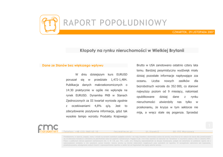 RAPORT POPOŁUDNIOWY CZWARTEK, 29 LISTOPADA 2007 Kłopoty na rynku nieruchomości w Wielkiej Brytanii Brutto w USA zanotowano ostatnio cztery lata Dane ze Stanów bez większego wpływu temu. Bardziej pesymistyczny wydźwięk miały W poruszał Publikacja dniu się dzisiejszym w danych kurs przedziale EURUSD 1,472-1,484. oceanu. Liczba nowych zasiłków dla o bezrobotnych wzrosła do 352 000, co stanowi 14:30 praktycznie w ogóle nie wpłynęła na najwyższy poziom od 9 miesięcy, natomiast rynek EURUSD. Dynamika PKB w Stanach opublikowane dzisiaj Zjednoczonych za III kwartał wyniosła zgodnie nieruchomości utwierdziły z to przekonaniu, że kryzys w tym sektorze nie zdecydowanie pozytywna informacja, gdyż tak mija, a wręcz stale się pogarsza. Sprzedaż oczekiwaniami makroekonomicznych dzisiaj pozostałe informacje napływające zza 4,8% q/q. Jest dane nas z rynku tylko w wysokie tempo wzrostu Produktu Krajowego management 1 Telefon: +48 (22) 860 65 10 [email protected] Ul.Stawki2 00-193 Warszawa Przedstawione, w raporcie, poglądy, oceny i wnioski są wyrazem osobistych poglądów autorów i nie mają charakteru rekomendacji autora lub serwisu www.fmcm.pl do nabycia lub zbycia albo powstrzymania się od dokonania transakcji w odniesieniu do jakichkolwiek walut lub papierów wartościowych. Poglądy te jak i inne treści raportów nie stanowią" lub "doradztwa" w rozumieniu ustawy z dnia 21 sierpnia 1997r. Prawo o publicznym obrocie papierami wartościowymi (Dz. U. Nr 118, poz. 754, z późn. zm.) Wyłączną odpowiedzialność za decyzje inwestycyjne, podjęte lub zaniechane na podstawie raportu lub z wykorzystaniem wniosków w nim zawartych, ponosi inwestor. Autorzy serwisu są również właścicielem majątkowych praw autorskich do raportów. W szczególności zabronione jest kopiowanie, przedrukowywanie, udostępnianie osobom trzecim i rozpowszechnianie raportów w całości lub we fragmentach bez zgody autorów serwisu. CZWA RTEK, 29 L ISTO PA DA 2007 nowych domów wyniosła bowiem 0,728 mln, maja optymistycznych nastrojów oraz wykazują czyli dużo mniej niż oczekiwano. oni coraz większy niepokój o swoją sytuację finansową. Informacje te mają zdecydowanie Negatywne informacji podtopiły angielską wyspę „gołębi” charakter, co wskazuje na to, iż Po publikacji makroekonomicznych negatywnych w UK kurs danych obniżka stóp procentowych przez Centralny GBPUSD Bank Anglii jest coraz bardziej prawdopodobna. gwałtowanie zanurkował z 2,08 do okolic 2,06. Co nas czeka jutro? Informacje z angielskiego rynku nieruchomości zdecydowanie optymizmem. W dniu jutrzejszym istotny wpływ na Ceny mieszkań w Wielkiej Brytanii spadły kształtowanie się kursu EURUSD będzie miała bowiem do najniższego poziomu od 1995 r., co publikacja inflacji HICP, dynamiki PKB oraz nie wróży dobrze gospodarce w kraju na wskaźnika zaufania konsumentów w Strefie wyspach. Bardzo niska okazała się także liczba Euro. Ze Stanów Zjednoczonych natomiast udzielonych w napłyną dane o wydatkach konsumentów i październiku. Ich ilość zmniejszyła się ze wydatkach budowlanych, indeks inflacji PCE 100 000 do 88 000, czyli najmniej od lutego oraz Chicago PMI. Bardzo ciekawa może 2005 r. Na podstawie analizy ostatnich danych okazać z mierzącego zaufanie konsumentów w Wielkiej Wielkiej nie napawają kredytów Brytanii, hipotecznych można stwierdzić, iż konsumenci w tym kraju zdecydowanie nie się Brytanii. także Poziom publikacja wskaźnika wskaźnika niższy od 2 Telefon: +48 (22) 860 65 10 [email protected] Ul.Stawki2 00-193 Warszawa CZWA RTEK, 29 L ISTO PA DA 2007 oczekiwań, może jeszcze bardziej wpłynąć na osłabienie funta wobec dolara. Katarzyna Banasiak 3 Telefon: +48 (22) 860 65 10 [email protected] Ul.Stawki2 00-193 Warszawa