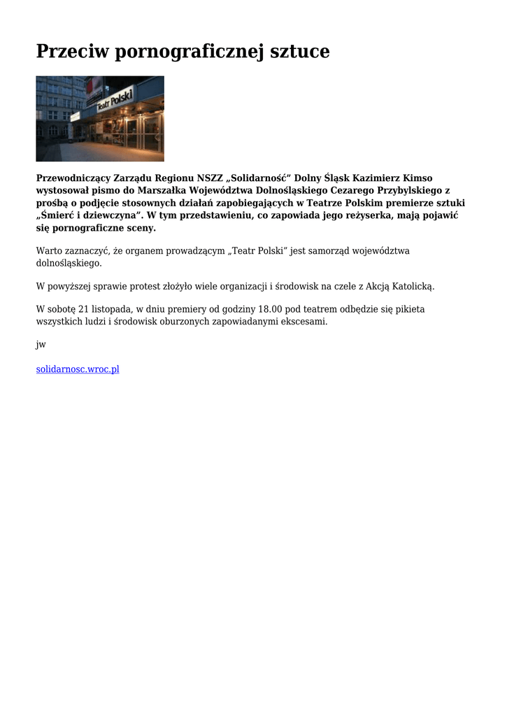 Przeciw pornograficznej sztuce Przewodniczący Zarządu Regionu NSZZ „Solidarność” Dolny Śląsk Kazimierz Kimso wystosował pismo do Marszałka Województwa Dolnośląskiego Cezarego Przybylskiego z prośbą o podjęcie stosownych działań zapobiegających w Teatrze Polskim premierze sztuki „Śmierć i dziewczyna”. W tym przedstawieniu, co zapowiada jego reżyserka, mają pojawić się pornograficzne sceny. Warto zaznaczyć, że organem prowadzącym „Teatr Polski” jest samorząd województwa dolnośląskiego. W powyższej sprawie protest złożyło wiele organizacji i środowisk na czele z Akcją Katolicką. W sobotę 21 listopada, w dniu premiery od godziny 18.00 pod teatrem odbędzie się pikieta wszystkich ludzi i środowisk oburzonych zapowiadanymi ekscesami. jw solidarnosc.wroc.pl