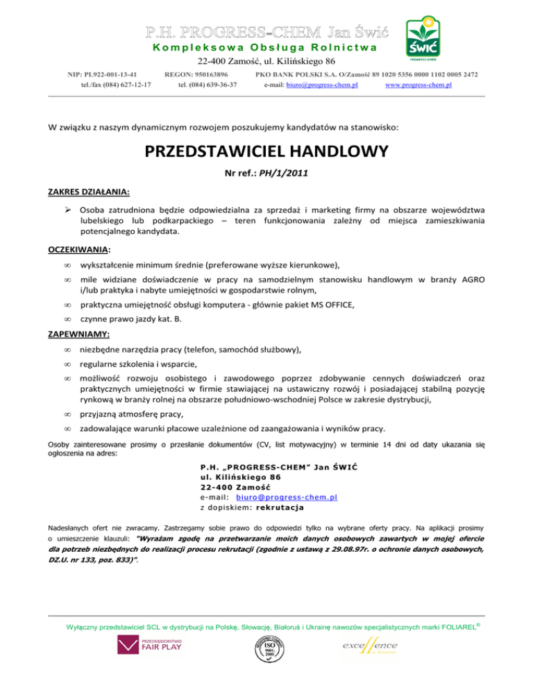 Kompleksowa Obsługa Rolnictwa 22-400 Zamość, ul. Kilińskiego 86 NIP: PL922-001-13-41 REGON: 950163896 tel./fax (084) 627-12-17 tel. (084) 639-36-37 PKO BANK POLSKI S.A. O/Zamość 89 1020 5356 0000 1102 0005 2472 e-mail: [email protected] www.progress-chem.pl W związku z naszym dynamicznym rozwojem poszukujemy kandydatów na stanowisko: PRZEDSTAWICIEL HANDLOWY Nr ref.: PH/1/2011 ZAKRES DZIAŁANIA: Osoba zatrudniona będzie odpowiedzialna za sprzedaż i marketing firmy na obszarze województwa lubelskiego lub podkarpackiego – teren funkcjonowania zależny od miejsca zamieszkiwania potencjalnego kandydata. OCZEKIWANIA: • wykształcenie minimum średnie (preferowane wyższe kierunkowe), • mile widziane doświadczenie w pracy na samodzielnym stanowisku handlowym w branży AGRO i/lub praktyka i nabyte umiejętności w gospodarstwie rolnym, • praktyczna umiejętność obsługi komputera - głównie pakiet MS OFFICE, • czynne prawo jazdy kat. B. ZAPEWNIAMY: • niezbędne narzędzia pracy (telefon, samochód służbowy), • regularne szkolenia i wsparcie, • możliwość rozwoju osobistego i zawodowego poprzez zdobywanie cennych doświadczeń oraz praktycznych umiejętności w firmie stawiającej na ustawiczny rozwój i posiadającej stabilną pozycję rynkową w branży rolnej na obszarze południowo-wschodniej Polsce w zakresie dystrybucji, • przyjazną atmosferę pracy, • zadowalające warunki płacowe uzależnione od zaangażowania i wyników pracy. Osoby zainteresowane prosimy o przesłanie dokumentów (CV, list motywacyjny) w terminie 14 dni od daty ukazania się ogłoszenia na adres: P.H. „PROGRESS-CHEM” Jan ŚWIĆ ul. Kilińskiego 86 22-400 Zamość e-mail: [email protected] z dopiskiem: rekrutacja Nadesłanych ofert nie zwracamy. Zastrzegamy sobie prawo do odpowiedzi tylko na wybrane oferty pracy. Na aplikacji prosimy o umieszczenie klauzuli: "Wyrażam zgodę na przetwarzanie moich danych osobowych zawartych w mojej ofercie dla potrzeb niezbędnych do realizacji procesu rekrutacji (zgodnie z ustawą z 29.08.97r. o ochronie danych osobowych, DZ.U. nr 133, poz. 833)". Wyłączny przedstawiciel SCL w dystrybucji na Polskę, Słowację, Białoruś i Ukrainę nawozów specjalistycznych marki FOLIAREL®