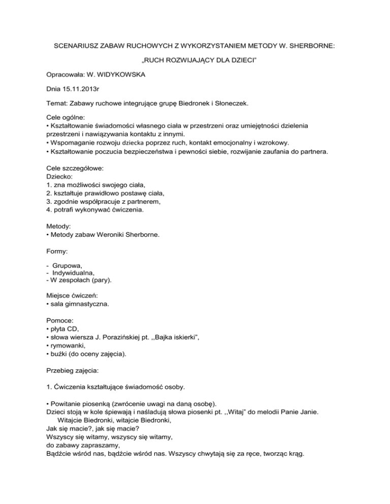 SCENARIUSZ ZABAW RUCHOWYCH Z WYKORZYSTANIEM METODY W. SHERBORNE: „RUCH ROZWIJAJĄCY DLA DZIECI” Opracowała: W. WIDYKOWSKA Dnia 15.11.2013r Temat: Zabawy ruchowe integrujące grupę Biedronek i Słoneczek. Cele ogólne: • Kształtowanie świadomości własnego ciała w przestrzeni oraz umiejętności dzielenia przestrzeni i nawiązywania kontaktu z innymi. • Wspomaganie rozwoju dziecka poprzez ruch, kontakt emocjonalny i wzrokowy. • Kształtowanie poczucia bezpieczeństwa i pewności siebie, rozwijanie zaufania do partnera. Cele szczegółowe: Dziecko: 1. zna możliwości swojego ciała, 2. kształtuje prawidłowo postawę ciała, 3. zgodnie współpracuje z partnerem, 4. potrafi wykonywać ćwiczenia. Metody: • Metody zabaw Weroniki Sherborne. Formy: - Grupowa, - Indywidualna, - W zespołach (pary). Miejsce ćwiczeń: • sala gimnastyczna. Pomoce: • płyta CD, • słowa wiersza J. Porazińskiej pt. ,,Bajka iskierki”, • rymowanki, • buźki (do oceny zajęcia). Przebieg zajęcia: 1. Ćwiczenia kształtujące świadomość osoby. • Powitanie piosenką (zwrócenie uwagi na daną osobę). Dzieci stoją w kole śpiewają i naśladują słowa piosenki pt. ,,Witaj” do melodii Panie Janie. Witajcie Biedronki, witajcie Biedronki, Jak się macie?, jak się macie? Wszyscy się witamy, wszyscy się witamy, do zabawy zapraszamy, Bądźcie wśród nas, bądźcie wśród nas. Wszyscy chwytają się za ręce, tworząc krąg. 2. Ćwiczenia kształtujące świadomość schematu ciała. • „Bajka o moim ciele” – wszyscy znajdują się w pozycji siedzącej i nazywają różne części ciała i jednocześnie wykonując konkretny ruch: - poznajemy swoje rączki, - rączki witają się z nóżkami, dotykamy swoje stopy, - paluszki spacerują dalej i spotykają kolanka, - po kolankach mamy brzuszek, głaszczemy i masujemy, - idą paluszki dalej i witają się z szyjką, kręcimy szyjką raz w jedna, raz w drugą stronę, - po szyi poznają paluszki buźkę, dotykają oczka, nos – liczą dziurki w nosie, dotykają brodę, - paluszki – wędrowniczki głaszczą włosy i spotykają uszy, liczą uszy. - poprawianie fryzury. • „Lustro” – dzieci siedzą naprzeciwko siebie: jedno wykonuje dowolne ruchy, gesty, drugie naśladuje jego ruchy. • ,,Koncert - gra na plecach” – jedno dziecko klęczy na podłodze obok leżącego dziecka (dziecko leży na brzuchu na podłodze). Dziecko klęczące gra palcami na plecach dziecka leżącego. Najpierw lekko uderzając opuszkami palców, potem coraz mocniej, a następnie kantami dłoni, pięściami i całymi dłońmi. W trakcie wykonywania ćwiczeń należy zmieniać siłę i ryty uderzeń. Po chwili należy dokonać zmiany ról. 3. Ćwiczenia kształtujące świadomość przestrzeni. • Zabawa pt. ,,Jak najwyżej’. Wszyscy leżą na plecach ,,w rozsypce” na podłodze. Sięganie rękoma i nogami ,, do sufitu”, wyciąganie ich jak najwyżej, naśladowanie ruchem dłoni gestu wkręcanie żarówek. • Zabawa pt. ,,Bączek”. Wszyscy siedzą na podłodze z nogami ugiętymi w kolanach i lekko uniesionymi. Odpychając się rękoma, każdy próbuje samodzielnie obracać się w miejscu wokół własnej osi. 4. Ćwiczenia oparte na relacji ,,z” (relacji opiekuńczej). • „Naleśniki”, czyli rolowanie po podłodze – jedno dziecko klęczy na podłodze przy leżącym na plechach obok dziecku, które ma wyciągnięte ręce w tył ( za głową). Dziecko klęczące stara się powoli i lekko obrócić (przetoczyć) dziecko na brzuch. • Zabawa pt. ,,Wycieczka” – jedno dziecko stoi przed leżącym na podłodze. Dziecko leży na plecach na podłodze, z ramionami wyciągniętymi w tył ( za głową). Natomiast drugie dziecko przytrzymuje dziecko za nogi na wysokości kostek, lekko przeciąga je w różnych kierunkach. 5. Ćwiczenia rozwijające relacje ,,przeciwko” (relacje mocy i energii). • „Przepychanki” – dzieci siedzą na podłodze plecami do siebie i próbują się przepychać. • „Paczka” – jedno dziecko siedzi skulone na podłodze, drugie klęcząc naprzeciwko, próbuje go rozpakować. Ćwiczenia relaksujące - , „Rak” Idzie, idzie rak Dzieci zwrócone do siebie twarzą,. Spacerujemy palcami: kciukiem i wskazującym po ręce kolegi. Czasem naprzód, czasem wspak. Odpowiednio zmieniając kierunek ruchu. Idzie rak nieborak, Spacerujemy jak na początku, Jak uszczypnie, będzie znak. Delikatnie i z humorem naśladujemy szczypanie. 6. Ćwiczenia oparte na relacji ,,razem” (relacji partnerskiej). • Zabawa pt. ,,Piłowanie drewna”. – Dzieci siedzą w rozkroku, zwrócone przodem, trzymając się za dłonie. Nogi jednego dziecka znajdują się pod nogami drugiego dziecka. Następnie na przemian kładą się na plecach na podłodze, cały czas trzymając się za ręce. • „Rowerek” –dzieci leżą na plecach na podłodze z nogami uniesionymi w górę i ugiętymi kolanami. Dzieci leżą tak, aby jego stopa była oparta o stopy partnera. Następnie wspólnie wykonują tzw. rowerek. Prowadzący powtarza rymowankę, różnicuje tempo: „Jedzie Radek na rowerze, a pan Romek na skuterze. Raz, dwa, trzy, jedź i ty”. • „Prowadzenie ślepca” – dziecko trzyma drugie dziecko, (które ma zamknięte oczy) i prowadzi je (zmiana ról). Ćwiczenia relaksujące - ,,Kołysanka” do wiersza J. Porazińskiej pt. ,,Bajka iskierki” nuconej przez nauczyciela lub odtwarzanej z płyty CD. Dzieci siedzą w kole na podłodze siad skrzyżny i kołyszą się na boki. Z popielnika na Wojtusia iskiereczka mruga; Chodź, opowiem ci bajeczkę, bajka będzie długa. Była sobie raz królowa, pokochała grajka, Król wyprawił im wesele i skończona bajka. Była sobie Baba –Jaga, miała chatkę z masła, A w tej chatce same dziwy! Psst... iskierka zgasła. Z popielnika na Wojtusia iskiereczka mruga; Chodź, opowiem ci bajeczkę, bajka będzie długa. Już ci Wojtuś nie uwierzy, iskiereczko mała. Chwilkę błyś