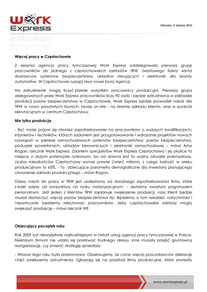 Katowice, 6 sierpnia 2010 Więcej pracy w Częstochowie 2 sierpnia agencja pracy tymczasowej Work Express oddelegowała pierwszą grupę pracowników do jednego z częstochowskich zakładów TRW, światowego lidera wśród dostawców systemów bezpieczeństwa, układów sterujących i elektroniki dla branży automotive. W Częstochowie ruszają dwa nowe biura Agencji. Na zatrudnienie mogą liczyć przede wszystkim pracownicy produkcyjni. Pierwsza grupa delegowanych przez Work Express pracowników liczy 90 osób i będzie zatrudniona w zakładzie produkcji pasów bezpieczeństwa w Częstochowie. Work Express będzie prowadził nabór dla TRW w nowo powstałych biurach: biurze on-site - na terenie zakładu klienta, oraz w punkcie rekrutacyjnym w centrum Częstochowy. Nie tylko produkcja - Być może pojawi się również zapotrzebowanie na pracowników o wyższych kwalifikacjach: inżynierów i techników, których zadaniem jest przygotowywanie i wdrażanie projektów nowych rozwiązań w zakresie samochodowych systemów bezpieczeństwa: pasów bezpieczeństwa, poduszek powietrznych, układów kierowniczych i elektroniki samochodowej – mówi Artur Ragan, rzecznik Work Express. Zdaniem specjalistów Work Express Częstochowa i jej okolice to miejsce o dużym potencjale rynkowym, bo od dawna jest to ważny ośrodek przemysłowy. Liczba mieszkańców Częstochowy wynosi prawie ćwierć miliona, z czego ludność w wieku produkcyjnym to 65%. - To obiecujące parametry demograficzne dla inwestora planującego otworzenie zakładu produkcyjnego – mówi Ragan. Dalszy nabór do pracy w TRW jest uzależniony od doraźnego zapotrzebowania firmy, które z kolei zależy od koniunktury na rynku motoryzacyjnym. - Jesteśmy swoistym pogotowiem personalnym. Jeśli jeden z klientów TRW zaplanuje zwiększenie produkcji, nasz Klient będzie musiał dostarczyć więcej pasów bezpieczeństwa itp. Będziemy o tym wiedzieć natychmiast i niezwłocznie będziemy rekrutować pracowników, żeby częstochowskie zakłady mogły zwiększyć produkcję – mówi rzecznik WE. Obiecujący początek roku Rok 2009 był niewątpliwie najtrudniejszym w historii usług agencji pracy tymczasowej w Polsce. Niektórym firmom nie udało się przetrwać trudnego okresu, inne musiały przejść gruntowną reorganizację, czy zmienić strategię sprzedaży. - Wiosna tego roku była przełomowa. Obserwujemy, że coraz więcej pracodawców deklaruje chęć zwiększenia zatrudnienia. Zgłaszają się na przykład firmy produkcyjne, które zawiesiły Work Express Sp. z o.o. tel.: 32 205 42 42 NIP: 634-25-38-237 ul. Murckowska 14 fax: 32 757 49 31 REGON: 278305758 40-265 Katowice e-mail: [email protected] KRS: 0000216937 Kapitał zakładowy: 300.000 zł - opłacony w całości Sąd Rejonowy w Katowicach, Wydział VIII Gospodarczy Krajowego Rejestru Sądowego Katowice, 6 sierpnia 2010 część projektów w 2009 roku z powodu kryzysu gospodarczego i nie prowadziły rekrutacji. Teraz znów poszukują pracowników na stałe i zatrudniają pracowników tymczasowych, nadal obawiając się gwałtownego spadku koniunktury – mówi Dariusz Lamot, prezes Work Express. Dodaje, że ofert przybywa głównie w sektorze produkcji materiałów budowlanych i wykończeniowych. - Odżyła też branża RTV i AGD. Spadek sprzedaży dóbr trwałego użytku sprawił, że magazyny zostały „wyczyszczone” z zeszłorocznej produkcji nieco później niż zwykle, dlatego właśnie teraz znów potrzebni są pracownicy tymczasowi. Przede wszystkim do montażu – mówi Dariusz Lamot. Jego zdaniem więcej ofert powinno pojawić się także w branży logistycznej, spożywczej i FMCG, czyli dóbr szybkozbywalnych. Nowe biura Work Express powstają w ramach strategii na 2010, która zakłada rozszerzenie firmy o oddziały w Częstochowie, Łodzi, Wrocławiu i Gliwicach. Kontrakt Work Express z TRW, jest największym tego typu kontraktem w historii Agencji. TRW to przedsiębiorstwo zatrudniające prawie 64 tysiące ludzi w 185 zakładach na całym świecie. Globalne przychody TRW w 2009 roku wyniosły ponad 11 miliardów dolarów. I to przy znacznym spadku obrotów amerykańskiej branży motoryzacyjnej. - Współpraca z TRW, które jest konsorcjum firm działających w branży automotive od początku istnienia tej branży, to dla nas również ogromny prestiż.– mówi Dariusz Lamot. Ciekawe fakty z historii TRW: Prawie 60% przychodów grupy TRW jest generowane na rynku europejskim, a w strategii na ten rok znalazł się zapis o szczególnym zaangażowaniu na rozwijających się rynkach. TRW Częstochowa otrzymało w 2000 nagrodę prezesa konsorcjum za udoskonalenia w dziedzinie bezpieczeństwa. Klienci częstochowskich zakładów to między innymi: VW, Opel, DaimlerChrysler, Fiat, Ford, Renault, Peugeot, Citroen, BMW, Audi, Jaguar, Land Rover, Toyota, Alfa Romeo, Lancia, Mazda, Skoda, Iveco, Maseratti, GM, GMDAT, Seat, Porsche, CAC, Rolls-Royce. 19% globalnej sprzedaży TRW zapewniają zakłady przemysłu motoryzacyjnego zlokalizowane w samym tylko Detroit. Work Express Sp. z o.o. tel.: 32 205 42 42 NIP: 634-25-38-237 ul. Murckowska 14 fax: 32 757 49 31 REGON: 278305758 40-265 Katowice e-mail: [email protected] KRS: 0000216937 Kapitał zakładowy: 300.000 zł - opłacony w całości Sąd Rejonowy w Katowicach, Wydział VIII Gospodarczy Krajowego Rejestru Sądowego Katowice, 6 sierpnia 2010 Jedna z firm założycielskich grupy TRW rozpoczęła swoją działalność w roku 1909 od produkcji felg do legendarnego modelu Forda T. Felgi były wykonywane z drewna i – podobnie jak wszystkie egzemplarze Forda T - malowane na czarno. *** Work Express (www.workexpress.pl) to certyfikowana agencja doradztwa personalnego i pracy tymczasowej, która działa na rynku od 2004 r. Firma oferuje szeroką gamę usług z zakresu pracy tymczasowej i rekrutacji personelu, pozostając jednym z liderów w zakresie leasingu pracowniczego. Centrala firmy znajduje się w Katowicach, a