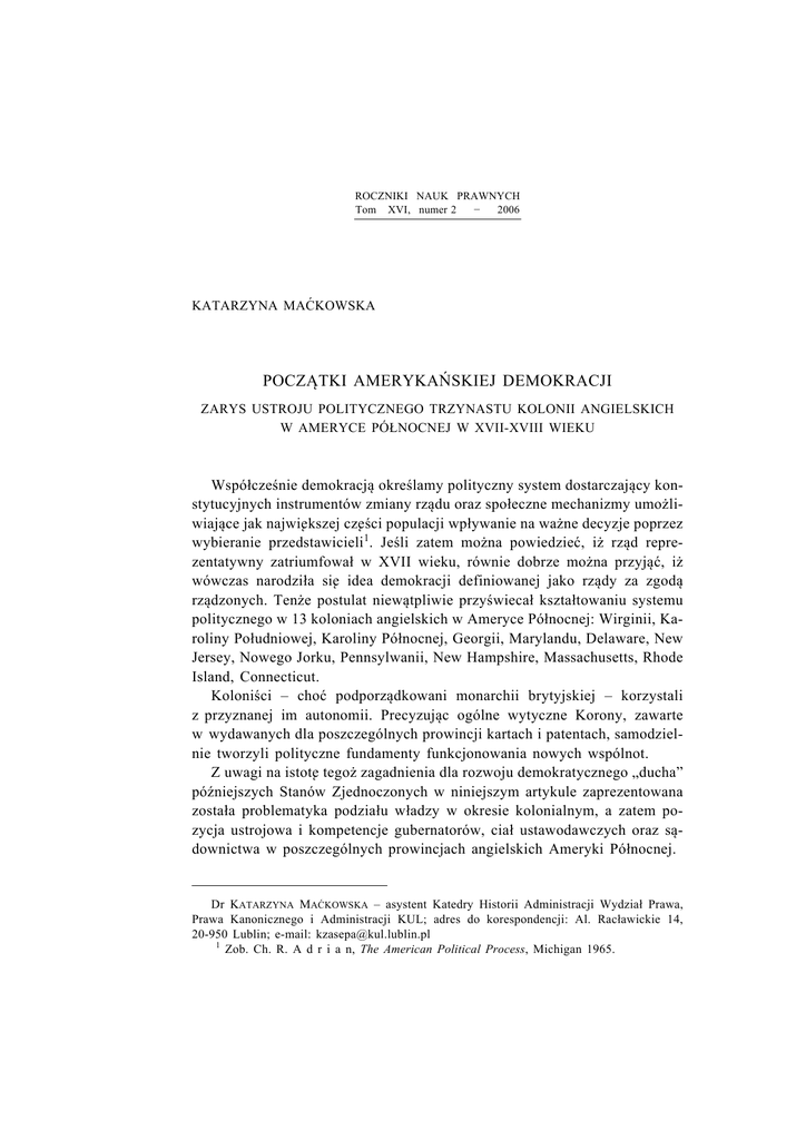 ROCZNIKI NAUK PRAWNYCH Tom XVI, numer 2 − 2006 KATARZYNA MAĆKOWSKA POCZATKI ˛ AMERYKAŃSKIEJ DEMOKRACJI ZARYS USTROJU POLITYCZNEGO TRZYNASTU KOLONII ANGIELSKICH W AMERYCE PÓŁNOCNEJ W XVII-XVIII WIEKU Współcześnie demokracja˛ określamy polityczny system dostarczajacy ˛ konstytucyjnych instrumentów zmiany rzadu ˛ oraz społeczne mechanizmy umożliwiajace ˛ jak najwie˛kszej cze˛ści populacji wpływanie na ważne decyzje poprzez wybieranie przedstawicieli1. Jeśli zatem można powiedzieć, iż rzad ˛ reprezentatywny zatriumfował w XVII wieku, równie dobrze można przyjać, ˛ iż wówczas narodziła sie˛ idea demokracji definiowanej jako rzady ˛ za zgoda˛ rzadzonych. ˛ Tenże postulat niewatpliwie ˛ przyświecał kształtowaniu systemu politycznego w 13 koloniach angielskich w Ameryce Północnej: Wirginii, Karoliny Południowej, Karoliny Północnej, Georgii, Marylandu, Delaware, New Jersey, Nowego Jorku, Pennsylwanii, New Hampshire, Massachusetts, Rhode Island, Connecticut. Koloniści – choć podporzadkowani ˛ monarchii brytyjskiej – korzystali z przyznanej im autonomii. Precyzujac ˛ ogólne wytyczne Korony, zawarte w wydawanych dla poszczególnych prowincji kartach i patentach, samodzielnie tworzyli polityczne fundamenty funkcjonowania nowych wspólnot. Z uwagi na istote˛ tegoż zagadnienia dla rozwoju demokratycznego „ducha” późniejszych Stanów Zjednoczonych w niniejszym artykule zaprezentowana została problematyka podziału władzy w okresie kolonialnym, a zatem pozycja ustrojowa i kompetencje gubernatorów, ciał ustawodawczych oraz sa˛ downictwa w poszczególnych prowincjach angielskich Ameryki Północnej. Dr KATARZYNA MAĆKOWSKA – asystent Katedry Historii Administracji Wydział Prawa, Prawa Kanonicznego i Administracji KUL; adres do korespondencji: Al. Racławickie 14, 20-950 Lublin; e-mail: [email protected] 1 Zob. Ch. R. A d r i a n, The American Political Process, Michigan 1965. 92 KATARZYNA MAĆKOWSKA Niepomiernie ważka˛ kwestie˛ stanowił sam status prawny kolonii w interesujacym ˛ nas okresie. Otóż adekwatnie do sposobu obsady urze˛du gubernatora kolonie dzieliły sie˛ na trzy kategorie. Kolonie samorzadne, ˛ tzw. Charters colonies, samodzielnie wybierały gubernatora. W Rhode Island dokonywano tego na Zgromadzeniu Elekcyjnym (Courts of Election), które odbywało sie˛ corocznie w pierwszy wtorek po 15 maja, o ile nie przeszkodziły temu warunki pogodowe. Osoby nie mogace ˛ przybyć na Zgromadzenie miały uprawnienie do przesłania swojego zdania w formie zapiecze˛towanego listu2. Podobnie w Connecticut gubernatora wybierano na roczna˛ kadencje˛, przy czym Zgromadzenie Elekcyjne odbywało sie˛ tu w drugi czwartek kwietnia i wówczas obierano również sześciu asystentów gubernatora pełniacych ˛ także swoje funkcje przez rok3. W obu koloniach głosowanie wygladało ˛ naste˛puja˛ co: każdy z uprawnionych zapisywał na kartce nazwisko swojego kandydata, a naste˛pnie oddane w ten sposób głosy liczył sekretarz kolonii i podawał wynik do publicznej wiadomości. W prywatnych koloniach – Proprietary colonies – gubernatora mianował ich właściciel. W Marylandzie był to tzw. Lieutenant General, który jednocześnie sprawował urzad ˛ przewodniczacego ˛ Zgromadzenia Kolonialnego, a w Delaware i Pennsylwanii – Gouvernor. W pozostałych koloniach – Royal colonies – gubernatorzy powoływani byli bezpośrednio przez monarche˛. To teoretyczne zróżnicowanie w statusie poszczególnych obszarów nie miało tak naprawde˛ swojego praktycznego odzwierciedlenia, gdyż w rzeczywistości stopień zależności od Korony był wsze˛dzie podobny, co stanowiło rezultat wpierw nikłego ingerowania macierzy w sytuacje˛ amerykańskich ko- 2 Acts and Orders, art. 12: „It is ordered that the Courte of Election shall always be held upon the first Tuesday after 15th of May, annualy, if wind or weather hinder not. [...] Further it is agreed, that forasmuch as many may be necessarily detained, that they cannot come to the General Courte of Election, that then they shall send their votes sealed upon into the said Court, which shall be as effectual as their personal appearances” (D. S. L u t z, Colonial Origins of the American Constitution. A documentary history, Indianapolis 1998, s. 180). 3 Fundamental Orders of Connecticut, art. 1: „It is ordered, sentenced and decreed, that there shall by yerely two generall Assemblies or Courts, the First on the second thursday in April, the other the second thursday in September, following; the first shall be called the Courte of Election, wherein shall be yerely Chosen from tyme to tyme soe many Magestrates and other publike officers as shall be found requissitte: Whereof one to be chosen Gouernor for the yeare ensueing and untill another be chosen and noe other magistrate to be chosen for more then one year; pruided allwayes there be sixe chosen besides the Gouernor [...]” (tamże, s. 211). POCZATKI ˛ AMERYKAŃSKIEJ DEMOKRACJI 93 lonii, a naste˛pnie ich ekonomicznego reglamentowania. Gubernator był przedstawicielem Korony, od której otrzymywał polecenia i instrukcje, mianował urze˛dników i se˛dziów, piastował stanowisko naczelnego dowódcy kolonialnych sił wojskowych, dysponował prawem łaski, pełnił funkcje˛ reprezentacyjna. ˛ W koloniach, gdzie Kościół anglikański ustanowiono Kościołem państwowym, był jego głowa˛4. W realizacji tych zadań wspierała go Rada – Council – której skład obsadzano cze˛sto metodami analogicznymi do tych, jakie stosowano przy powoływaniu gubernatora. Organ ów pełnił przede wszystkim funkcje doradcze i kontrolne. W Massachusetts Rade˛ tworzyło 18 asystentów, których – zanim kolonia ta nie przeszła pod ścisły nadzór Korony – razem z gubernatorem i jego zaste˛pca˛ wybierała legislatywa5, w Rhode Island – czterech6, w Connecticut – sześciu, w Pennsylwanii – siedemdziesie˛ciu dwóch (tutaj 