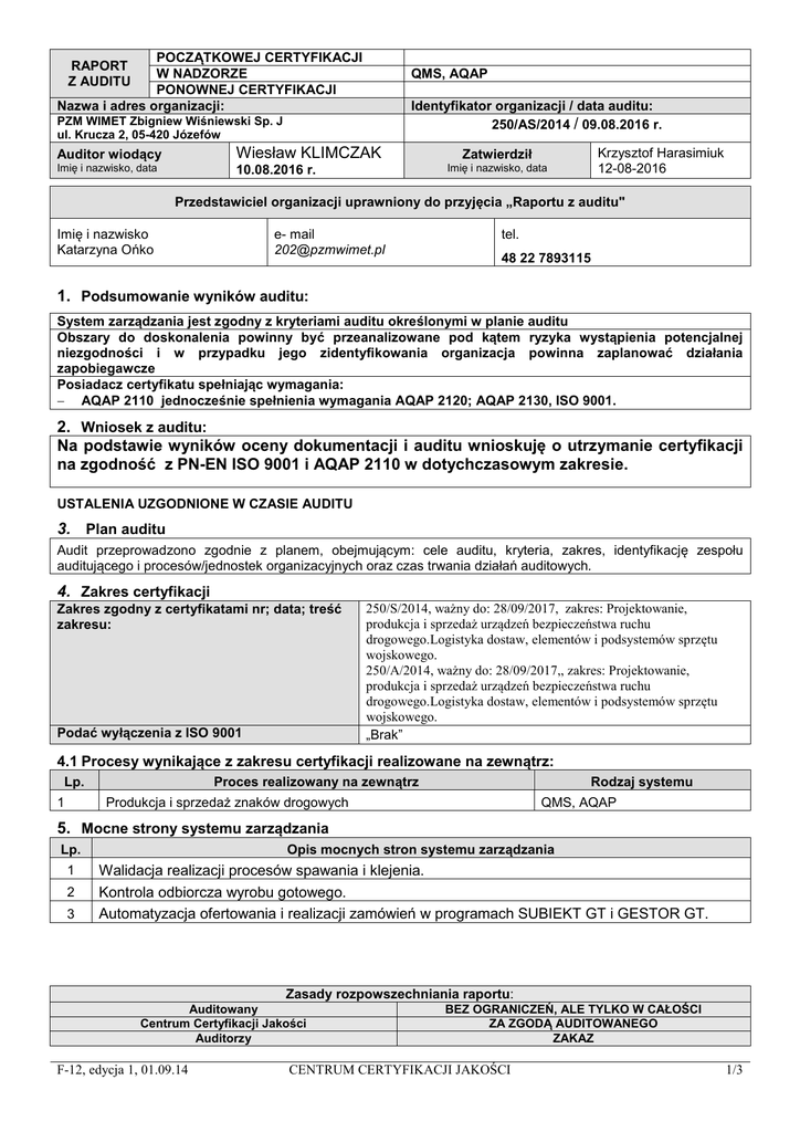 POCZĄTKOWEJ CERTYFIKACJI W NADZORZE PONOWNEJ CERTYFIKACJI Nazwa i adres organizacji: RAPORT Z AUDITU QMS, AQAP Identyfikator organizacji / data auditu: 250/AS/2014 / 09.08.2016 r. PZM WIMET Zbigniew Wiśniewski Sp. J ul. Krucza 2, 05-420 Józefów Auditor wiodący Wiesław KLIMCZAK Imię i nazwisko, data 10.08.2016 r. Krzysztof Harasimiuk 12-08-2016 Zatwierdził Imię i nazwisko, data Przedstawiciel organizacji uprawniony do przyjęcia „Raportu z auditu" Imię i nazwisko Katarzyna Ońko e- mail [email protected] tel. 48 22 7893115 1. Podsumowanie wyników auditu: System zarządzania jest zgodny z kryteriami auditu określonymi w planie auditu Obszary do doskonalenia powinny być przeanalizowane pod kątem ryzyka wystąpienia potencjalnej niezgodności i w przypadku jego zidentyfikowania organizacja powinna zaplanować działania zapobiegawcze Posiadacz certyfikatu spełniając wymagania: − AQAP 2110 jednocześnie spełnienia wymagania AQAP 2120; AQAP 2130, ISO 9001. 2. Wniosek z auditu: Na podstawie wyników oceny dokumentacji i auditu wnioskuję o utrzymanie certyfikacji na zgodność z PN-EN ISO 9001 i AQAP 2110 w dotychczasowym zakresie. USTALENIA UZGODNIONE W CZASIE AUDITU 3. Plan auditu Audit przeprowadzono zgodnie z planem, obejmującym: cele auditu, kryteria, zakres, identyfikację zespołu auditującego i procesów/jednostek organizacyjnych oraz czas trwania działań auditowych. 4. Zakres certyfikacji Zakres zgodny z certyfikatami nr; data; treść zakresu: Podać wyłączenia z ISO 9001 250/S/2014, ważny do: 28/09/2017, zakres: Projektowanie, produkcja i sprzedaż urządzeń bezpieczeństwa ruchu drogowego.Logistyka dostaw, elementów i podsystemów sprzętu wojskowego. 250/A/2014, ważny do: 28/09/2017,, zakres: Projektowanie, produkcja i sprzedaż urządzeń bezpieczeństwa ruchu drogowego.Logistyka dostaw, elementów i podsystemów sprzętu wojskowego. „Brak” 4.1 Procesy wynikające z zakresu certyfikacji realizowane na zewnątrz: Lp. 1 Proces realizowany na zewnątrz Rodzaj systemu Produkcja i sprzedaż znaków drogowych QMS, AQAP 5. Mocne strony systemu zarządzania Lp. 1 2 3 Opis mocnych stron systemu zarządzania Walidacja realizacji procesów spawania i klejenia. Kontrola odbiorcza wyrobu gotowego. Automatyzacja ofertowania i realizacji zamówień w programach SUBIEKT GT i GESTOR GT. Zasady rozpowszechniania raportu: Auditowany Centrum Certyfikacji Jakości Auditorzy F-12, edycja 1, 01.09.14 BEZ OGRANICZEŃ, ALE TYLKO W CAŁOŚCI ZA ZGODĄ AUDITOWANEGO ZAKAZ CENTRUM CERTYFIKACJI JAKOŚCI 1/3 POCZĄTKOWEJ CERTYFIKACJI W NADZORZE PONOWNEJ CERTYFIKACJI Nazwa i adres organizacji: RAPORT Z AUDITU QMS, AQAP Identyfikator organizacji / data auditu: 250/AS/2014 / 09.08.2016 r. PZM WIMET Zbigniew Wiśniewski Sp. J ul. Krucza 2, 05-420 Józefów Auditor wiodący Wiesław KLIMCZAK Imię i nazwisko, data 10.08.2016 r. Zatwierdził Imię i nazwisko, data Krzysztof Harasimiuk 12-08-2016 6. Obszary systemu zarządzania do doskonalenia Lp. 1 2 3 Opis obszarów systemu zarządzania do doskonalenia Szkolenie w zakresie nowych wymagań dotyczących ISO 9001 i AQAP Podpisywanie dokumentów dotyczących auditu wewnętrznego i prowadzonych działań zgodnie z obowiązującymi formularzami Akceptowanie raportów procesu przez liderów procesów 7. Ocena zgodności z kryteriami auditu Kryteria auditu PN-EN ISO 9001 AQAP 2110 4.1 4.2 5.4 5.6 6.2 6.3 6.4 7.1 7.2 7.3 7.4 7.5 7.6 7.7 (AQAP) 8.2 8.3 8.4 8.5 9 (AQAP) Ocena Numer karty niezgodności Spełniono wymagania Spełniono wymagania Spełniono wymagania Spełniono wymagania Spełniono wymagania, obszar do doskonalenia – p.6.1 Spełniono wymagania Spełniono wymagania Spełniono wymagania Spełniono wymagania Spełniono wymagania Spełniono wymagania Spełniono wymagania Spełniono wymagania Spełniono wymagania Spełniono wymagania, obszar do doskonalenia – p.6.2 Spełniono wymagania Spełniono wymagania, obszar do doskonalenia – p.6.3 Spełniono wymagania Spełniono wymagania - 8. Ocena skuteczności działań korygujących podjętych w odniesieniu do stwierdzonych niezgodności w trakcie poprzedniego auditu Nr karty - Treść niezgodności Ocena - - 9. Ocena działań podjętych w odniesieniu do obszarów do doskonalenia zidentyfikowanych w trakcie poprzedniego auditu Stwierdzony obszar Ocena Zapewnienie cykliczności prowadzenia przeglądów zarządzania Raportowanie monitorowania i pomiaru procesów Planowanie szkolenia nowych pracowników POZYTYWNA POZYTYWNA POZYTYWNA Zasady rozpowszechniania raportu: Auditowany Centrum Certyfikacji Jakości Auditorzy F-12, edycja 1, 01.09.14 BEZ OGRANICZEŃ, ALE TYLKO W CAŁOŚCI ZA ZGODĄ AUDITOWANEGO ZAKAZ CENTRUM CERTYFIKACJI JAKOŚCI 2/3 POCZĄTKOWEJ CERTYFIKACJI W NADZORZE PONOWNEJ CERTYFIKACJI Nazwa i adres organizacji: RAPORT Z AUDITU PZM WIMET Zbigniew Wiśniewski Sp. J ul. Krucza 2, 05-420 Józefów Auditor wiodący Wiesław KLIMCZAK Imię i nazwisko, data 10.08.2016 r. QMS, AQAP Identyfikator organizacji / data auditu: 250/AS/2014 / 09.08.2016 r. Zatwierdził Imię i nazwisko, data Krzysztof Harasimiuk 12-08-2016 Stwierdzony obszar Ocena POZYTYWNA Identyfikacja wyrobu będącego własnością klienta 10. Komentarz do zapisanych niezgodności Uzgodniony termin realizacji, do: Działania Przesłanie do auditora informacji o niezgodnościach i zaplanowanych działaniach związanych z ich usunięciem Przesłanie wypełnionej karty niezgodności wraz z dowodami usunięcia niezgodności w postaci kserokopii dokumentów do CCJ Ocena działań związanych z usunięciem niezgodności w formie auditu dodatkowego 11. Kwestie nierozstrzygnięte Opis kwestii do rozstrzygnięcia Kryteria auditu „-” - 12. Załączniki L.p. 1 2 3 4 5 Nazwa Plan auditu (przekazany przed auditem) Karta(y) niezgodności (przekazane na spotkaniu zamykającym) Lista osób uczestniczących w spotkaniu otwierającym i zamykającym (przy egzemplarzu CCJ) Raporty auditorów (przy egzemplarzu CCJ) Karta planowania a