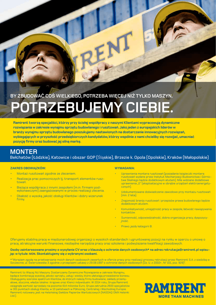 BY ZBUDOWAĆ COŚ WIELKIEGO, POTRZEBA WIĘCEJ NIŻ TYLKO MASZYN. POTRZEBUJEMY CIEBIE. Ramirent tworzą specjaliści, którzy przy ścisłej współpracy z naszymi Klientami wypracowują dynamiczne rozwiązania w zakresie wynajmu sprzętu budowlanego i rusztowań. Jako jeden z europejskich liderów w branży wynajmu sprzętu budowlanego poszukujemy nastawionych na dostarczanie innowacyjnych rozwiązań, wybiegających w przyszłość przedsiębiorczych kandydatów, którzy wspólnie z nami chcieliby się rozwijać, umacniać pozycję firmy oraz budować jej silną markę. MONTER Bełchatów (Łódzkie), Katowice i obszar GOP (Śląskie), Brzezie k. Opola (Opolskie), Kraków (Małopolskie) ZAKRES OBOWIĄZKÓW: WYMAGANIA: • Montaż rusztowań zgodnie ze zleceniem. • • Realizacja prac pomocniczych tj. transport elementów rusztowań. • Bieżąca współpraca z innymi zespołami (m.in. firmami podwykonawczymi) zaangażowanymi w proces realizacji zlecenia. Uprawnienia montera rusztowań (posiadanie książeczki montera rusztowań wydane przez Instytut Mechanizacji Budownictwa i Górnictwa Skalnego będzie dodatkowym atutem). Mile widziane dodatkowe uprawnienia „E” (eksploatacyjne w obrębie urządzeń elektroenergetycznych). • • Dbałość o wysoką jakość obsługi Klientów i dobry wizerunek firmy. Udokumentowane doświadczenie zawodowe przy montażu rusztowań (min. 2 lata). • Znajomość branży rusztowań i przepisów prawa budowlanego będzie dodatkowym atutem. • Komunikatywność, umiejętność pracy w zespole, łatwość nawiązywania kontaktów. • Sumienność, odpowiedzialność, dobra organizacja pracy, dyspozycyjność. • Prawo jazdy kategorii B. Oferujemy stabilną pracę w międzynarodowej organizacji o wysokich standardach i ugruntowanej pozycji na rynku w oparciu o umowę o pracę, atrakcyjne warunki finansowe, niezbędne narzędzia pracy oraz szkolenia i podwyższanie kwalifikacji zawodowych. Osoby zainteresowane prosimy o wysyłanie CV wraz z klauzulą o ochronie danych osobowych* na adres [email protected] wpisując w tytule: MON. Skontaktujemy się z wybranymi osobami. *“Wyrażam zgodę na przetwarzanie moich danych osobowych zawartych w ofercie pracy przy realizacji procesu rekrutacji przez Ramirent S.A. z siedzibą w Szczecinie, ul. Świerczewska 3 zgodnie z przepisami ustawy z 29.08.1997 o ochronie danych osobowych (Dz. U. z 2002r., Nr 101, poz. 929)”. Ramirent to Więcej Niż Maszyny. Dostarczamy Dynamiczne Rozwiązania w zakresie Wynajmu, będące kombinacją wysokiej jakości sprzętu, usług i wiedzy, które ułatwiają prowadzenie biznesu. Obsługujemy szerokie spektrum Klientów, do których należą firmy budowlane, zakłady przemysłowe, stocznie, władze lokalne i krajowe oraz Klienci indywidualni. W 2014 roku, Grupa Ramirent osiągnęła wartość sprzedaży na poziomie 614 milionów Euro. Grupa zatrudnia 2600 specjalistów w 301 punktach obsługi Klienta, w 10 państwach w Północnej, Centralnej i Wschodniej Europie. Ramirent notowany jest na Helsińskiej Giełdzie Papierów Wartościowych (NASDAQ OMX Helsinki Ltd.).