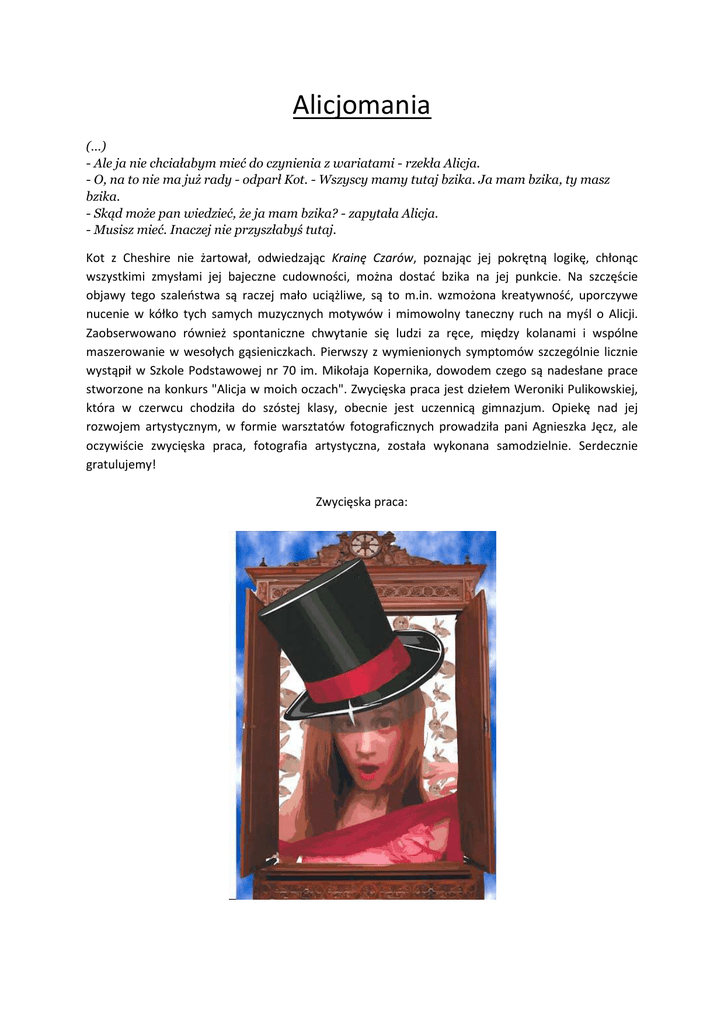 Alicjomania (…) - Ale ja nie chciałabym mieć do czynienia z wariatami - rzekła Alicja. - O, na to nie ma już rady - odparł Kot. - Wszyscy mamy tutaj bzika. Ja mam bzika, ty masz bzika. - Skąd może pan wiedzieć, że ja mam bzika? - zapytała Alicja. - Musisz mieć. Inaczej nie przyszłabyś tutaj. Kot z Cheshire nie żartował, odwiedzając Krainę Czarów, poznając jej pokrętną logikę, chłonąc wszystkimi zmysłami jej bajeczne cudowności, można dostać bzika na jej punkcie. Na szczęście objawy tego szaleństwa są raczej mało uciążliwe, są to m.in. wzmożona kreatywność, uporczywe nucenie w kółko tych samych muzycznych motywów i mimowolny taneczny ruch na myśl o Alicji. Zaobserwowano również spontaniczne chwytanie się ludzi za ręce, między kolanami i wspólne maszerowanie w wesołych gąsieniczkach. Pierwszy z wymienionych symptomów szczególnie licznie wystąpił w Szkole Podstawowej nr 70 im. Mikołaja Kopernika, dowodem czego są nadesłane prace stworzone na konkurs "Alicja w moich oczach". Zwycięska praca jest dziełem Weroniki Pulikowskiej, która w czerwcu chodziła do szóstej klasy, obecnie jest uczennicą gimnazjum. Opiekę nad jej rozwojem artystycznym, w formie warsztatów fotograficznych prowadziła pani Agnieszka Jęcz, ale oczywiście zwycięska praca, fotografia artystyczna, została wykonana samodzielnie. Serdecznie gratulujemy! Zwycięska praca: Prace wykonane przez uczniów ze Szkoły Podstawowej nr 70 im. Mikołaja Kopernika: Ze względu na wysoki stopień zapadalności na Alicjomanię, spodziewamy się, że jej przypadki będą wciąż rejestrowane, z sezonowymi epidemiami powracającymi w terminach odbywających się w Teatrze Wielkim spektakli, na które serdecznie zapraszamy.