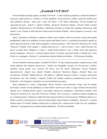 „Football CUP 2014” Powiat Prudnik realizuje projekt „Football CUP 2014”. V rámci realizace projektu se uskutečnil fotbalový turnaj pro mladé sportovce z Polska a z České republiky. Na powiatovém „Orliku” (sportovní hřiště) jsme měli příležitost přivítat mimo jiné i týmy FK Krnov a FK Město Albrechtice. Powiat Prudnik byl reprezentován týmy: „Pogoń” a „Sparta” Prudnik, „Racławia” Racławice Śląskie, „Polonia” Biała a hráček „Rolnika” Biedrzychowice. Pro fotbalisty i fotbalistky účastnící se turnaje bylo zajištěno občerstvení, další atrakce a ceny. Projekt je další aktivitou realizovanou Powiatem Prudnik v rámci integrace se sousedy z naší jižní hranice. Sport v pohraničí je důležitou a zajímavou oblastí, které musíme věnovat pozornost a proto také projekt předpokládá vydání dvou publikací na téma sportovních klubů, které se v posledních desetiletích zapsaly do místní sportovní historie a měly silnou spolupráci s českými partnery: LKS "Racławia" Racławice Śl. a LKS "Zarzewie" Prudnik. Práce spojené s vydáním knih jsou již v „cílové rovince” a brzy vedení Powiatu Vás pozve na jejich křest. Publikace se objeví v polsko-české jazykové verzi a budou mimo jiné popisovat historii spolupráce „Zarzewia” s českým klubem karate TJ Jeseník, šachovými kluby ze Zlatých hor a obce Česká ves a spolupráci „Racławie” s pohraničním českým fotbalovým klubem – FK Slezanem Osoblaha. --------------------------------------------------------------------------------------------------------------------------Powiat Prudnicki realizuje projekt „Football CUP 2014”. W toku realizacji projektu zorganizowany został turniej piłkarski dla młodych sportowców z Polski oraz Republiki Czeskiej. Na Powiatowym „Orliku” mieliśmy okazję gościć m.in. drużyny FK Krnov oraz FK Mesto Albrechtice. Powiat Prudnicki reprezentowały: „Pogoń” oraz „Sparta” Prudnik, „Racławia” Racławice Śląskie, „Polonia” Biała oraz zawodniczki „Rolnika” Biedrzychowice. Dla piłkarzy i piłkarek biorących udział w turnieju zapewniono poczęstunek oraz inne atrakcje i nagrody. Projekt jest kolejną inicjatywą podejmowaną przez Powiat Prudnicki w celu integracji z sąsiadami zza naszej południowej granicy. Sport pogranicza to ważny i pasjonujący obszar, któremu warto poświęcić uwagę, stąd też projekt przewiduje wydanie dwóch publikacji na temat klubów sportowych, które w ciągu ostatnich dziesięcioleci zapisały się w lokalnej historii sportu i prowadziły intensywną współpracę z partnerami czeskimi: LKS "Racławia" Racławice Śl. oraz LKS "Zarzewie" Prudnik. Prace związane z wydaniem książek znajdują się na „ostatniej prostej” i niebawem władze Powiatu zaproszą Państwa na ich promocję. Publikacje ukażą się w polsko-czeskiej wersji językowej i opisywać będą między innymi historię współpracy „Zarzewia” z czeskim klubem karate TJ Jesenik, klubami szachowymi ze Zlatych Hor i miejscowości Česká Ves oraz współpracę „Racławii” z przygranicznym czeskim klubem piłkarskim - FK Slezan Osoblaha. Projekt PL.3.22/3.3.07/14.04400 “Football CUP 2014” Projekt jest współfinansowany ze środków Europejskiego Funduszu Rozwoju Regionalnego oraz ze środków Budżetu Państwa 10% w ramach Programu Operacyjnego Współpracy Transgranicznej Republika Czeska – Rzeczpospolita Polska 2007-2013 „Przekraczamy granice”
