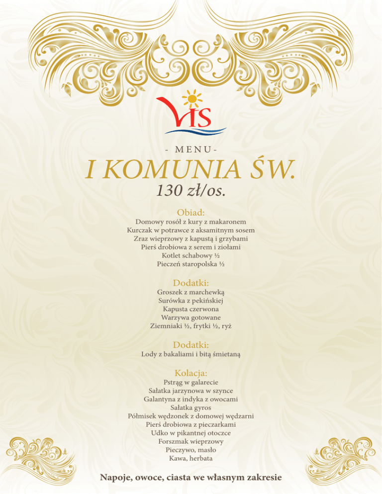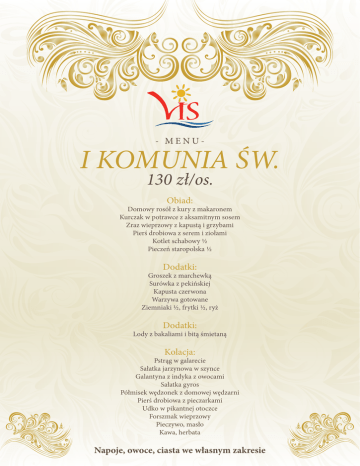 - MENU- I KOMUNIA ŚW. 130 zł/os. Obiad: Domowy rosół z kury z makaronem Kurczak w potrawce z aksamitnym sosem Zraz wieprzowy z kapustą i grzybami Pierś drobiowa z serem i ziołami Kotlet schabowy ½ Pieczeń staropolska ½ Dodatki: Groszek z marchewką Surówka z pekińskiej Kapusta czerwona Warzywa gotowane Ziemniaki ½, frytki ½, ryż Dodatki: Lody z bakaliami i bitą śmietaną Kolacja: Pstrąg w galarecie Sałatka jarzynowa w szynce Galantyna z indyka z owocami Sałatka gyros Półmisek wędzonek z domowej wędzarni Pierś drobiowa z pieczarkami Udko w pikantnej otoczce Forszmak wieprzowy Pieczywo, masło Kawa, herbata Napoje, owoce, ciasta we własnym zakresie