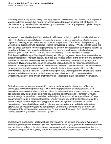 Rodzina katolicka - Trzech lekarzy na oddziale środa, 08 kwietnia 2009 12:19 Pediatrzy, neurolodzy i psychiatrzy dziecięcy to jedni z najbardziej poszukiwanych specjalistów w województwie śląskim. Na niektórych szpitalnych oddziałach sytuacja jest tak trudna, że placówki muszą zatrudniać dorywczo lekarzy z prywatnych firm, aby zapewnić opiekę chorym na najbardziej podstawowym poziomie. W województwie śląskim jest 29 szpitalnych oddziałów pediatrycznych i 3 ośrodki kliniczne z różnymi oddziałami specjalistycznymi. Jak się okazuje, w części szpitali na oddziale pracuje najwyżej 3 lekarzy, w tym jeden jest zatrudniony na pół etatu. Taka kadra nie wystarcza, gdy wzrośnie np. liczba chorych dzieci lub lekarze korzystają z urlopów. - Wtedy szpitale ratują się tym, że przez specjalne firmy ściągają lekarzy na dyżury. To jest jednak rozwiązanie fatalne, bo przychodzi lekarz, który w ogóle oddziału nie zna i nie wie, co któremu dziecku dolega alarmuje prof. dr hab. Antoni Dyduch, kierownik Katedry i Kliniki Pediatrii, Nefrologii i Endokrynologii Dziecięcej Śląskiego Uniwersytetu Medycznego oraz konsultant wojewódzki w dziedzinie pediatrii. Profesor dodaje, że może być jeszcze gorzej, gdyż średnia wieku pediatrów to 55-58 lat, a biorąc pod uwagę, iż większość z nich to kobiety, niedługo i oni przejdą na emeryturę. Dyduch zauważa, że od lat spada też liczba chętnych do robienia specjalizacji z pediatrii - teraz zgłasza się na nią 10 osób rocznie. Profesor Dyduch wyjaśnia, że podstawową przyczyną jest nie tyle brak chętnych, co zbyt mała liczba miejsc rezydenckich na całe województwo - tylko 2-3 rocznie. Dopiero w ubiegłym roku w sesji jesiennej zwiększono liczbę lekarzy specjalizujących się z pediatrii w ramach rezydentury do 10. - I wszystkie były wypełnione, a nawet było dwóch chętnych więcej - podkreśla śląski konsultant wojewódzki. Dyduch narzeka też na spadek prestiżu zawodu pediatry, co dla niektórych osób bywa decydujące w wyborze specjalizacji: - NFZ nie uznaje pediatrów jako specjalistów, a za specjalistę jest uważany lekarz rodzinny. Mimo że lekarz rodzinny w ciągu czterech lat swojej specjalizacji uczy się pediatrii pięć miesięcy, a lekarz pediatra pięć lat - tłumaczy Dyduch. I zwraca uwagę na paradoks, że wiedza pediatry jest dużo szersza i sam potrafi uporać się z zagadnieniami także z zakresu alergologii, endokrynologii czy gastroenterologii, bo ma to w swojej specjalizacji i w większości przypadków nie musi wysyłać pacjentów na dalsze konsultacje. - Natomiast lekarz rodzinny nie jest tak przygotowany i załatwia najprostsze sprawy, a z pozostałymi wysyła do specjalistów. Jeżeli lekarz pediatra tyle się uczy i jest traktowany jako niespecjalista, to normalne, że jest pewna frustracja i tych szkolących się lekarzy pediatrów jest mało - konkluduje profesor. Dodatkowym problemem - aczkolwiek nie decydującym - są kwestie finansowe. Wprawdzie procedury pediatryczne zostały w tym roku wycenione dużo wyżej, jednak do optymalnej kwoty jeszcze trochę brakuje. - Ja wiem, że nie ma pieniędzy, ale z naszych symulacji wynika, że moglibyśmy wyjść na zero, gdyby ten punkt kosztował nie 51, a 56 złotych. To jest minimum, 1/3 Rodzina katolicka - Trzech lekarzy na oddziale środa, 08 kwietnia 2009 12:19 które by powodowało, że oddziały nie byłyby deficytowe - tłumaczy prof. Dyduch. Równocześnie dodaje, że lepsza wycena procedur diagnostycznych spowodowała jednak, że szpitalom cofnięto pieniądze na wypłatę dodatków płacowych dla lekarzy. Dyduch zapewnia jednak, że mimo tych problemów na Śląsku nie dojdzie do sytuacji, aby zabrakło dla dzieci miejsc w szpitalach. Trudna sytuacja jest również w zakresie bardziej szczegółowych dziedzin pediatrycznych, tzw. nadspecjalizacji. W województwie śląskim tragicznie jest, jeśli chodzi o neurologię dziecięcą. Nie wiem dokładnie, ilu tych specjalistów przypada na województwo, ale jest to naprawdę niewielka liczba, czego najlepszym dowodem jest fakt, że nasz bardzo duży ośrodek kliniczny, który ma kilka klinik, w ogóle nie ma neurologa dziecięcego - podkreśla prof. Dyduch. Jego słowa potwierdza konsultant wojewódzki neurologii dziecięcej i dyrektor Górnośląskiego Centrum Zdrowia Dziecka w Katowicach dr Ewa Emich-Widera. Niewiele lepiej jest w przypadku psychiatrii dzieci i młodzieży: brakuje specjalistów, zwłaszcza w sektorze państwowym, dostępnym dla wszystkich, dlatego na przyjęcia na oddział trzeba czekać nawet kilka miesięcy. Na cały Śląsk jest zaledwie trzynastu psychiatrów dzieci i młodzieży - z tego trzech już w wieku emerytalnym - oraz kilku lekarzy w trakcie tej specjalizacji. Jednak ze względu na fakt, że jest to w ogóle deficytowa specjalizacja w skali kraju, region funkcjonuje w tym zakresie całkiem nieźle, ponieważ tę sytuację można porównać np. z województwem mazowieckim. - Nie zmienia to jednak faktu, że prawdopodobnie jeszcze przez kilka lat będziemy odczuwać braki kadrowe. Myślę, że w ogóle w skali kraju jest trudna sytuacja w tym zakresie - są miasta, w których w ogóle nie ma poradni zdrowia psychicznego dla dzieci i młodzieży, chociaż powinna być przynajmniej we wszystkich miastach powyżej stu tysięcy mieszkańców - podkreśla dr hab. n. med. Małgorzata Janas-Kozik, konsultant wojewódzki w dziedzinie psychiatrii dzieci i młodzieży, ordynator Oddziału Psychiatrii i Psychoterapii Wieku Rozwojowego w Centrum Pediatrii im. Jana Pawła II w Sosnowcu. Janas-Kozik zwraca uwagę na to, że problemy z brakiem powszechnego dostępu do tych specjalistów wiążą się też z dużym stopniem prywatyzacji. - W Warszawie prawie w ogóle nie ma psychiatrów dziecięcych pracujących ambulatoryjnie w ramach kontraktu z NFZ: wszyscy pracują prywatnie, tak samo, jak psychoterapeuci pracują prywatnie w ramach gabinetu. Lu