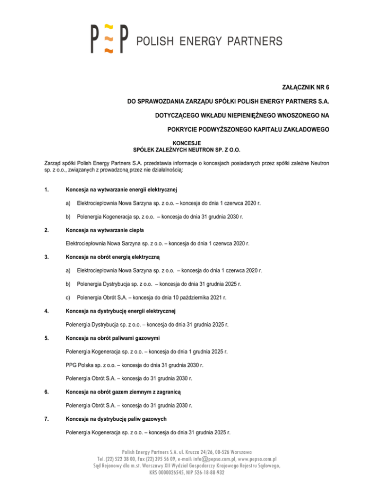 ZAŁĄCZNIK NR 6 DO SPRAWOZDANIA ZARZĄDU SPÓŁKI POLISH ENERGY PARTNERS S.A. DOTYCZĄCEGO WKŁADU NIEPIENIĘŻNEGO WNOSZONEGO NA POKRYCIE PODWYŻSZONEGO KAPITAŁU ZAKŁADOWEGO KONCESJE SPÓŁEK ZALEŻNYCH NEUTRON SP. Z O.O. Zarząd spółki Polish Energy Partners S.A. przedstawia informacje o koncesjach posiadanych przez spółki zależne Neutron sp. z o.o., związanych z prowadzoną przez nie działalnością: 1. 2. Koncesja na wytwarzanie energii elektrycznej a) Elektrociepłownia Nowa Sarzyna sp. z o.o. – koncesja do dnia 1 czerwca 2020 r. b) Polenergia Kogeneracja sp. z o.o. – koncesja do dnia 31 grudnia 2030 r. Koncesja na wytwarzanie ciepła Elektrociepłownia Nowa Sarzyna sp. z o.o. – koncesja do dnia 1 czerwca 2020 r. 3. 4. Koncesja na obrót energią elektryczną a) Elektrociepłownia Nowa Sarzyna sp. z o.o. – koncesja do dnia 1 czerwca 2020 r. b) Polenergia Dystrybucja sp. z o.o. – koncesja do dnia 31 grudnia 2025 r. c) Polenergia Obrót S.A. – koncesja do dnia 10 października 2021 r. Koncesja na dystrybucję energii elektrycznej Polenergia Dystrybucja sp. z o.o. – koncesja do dnia 31 grudnia 2025 r. 5. Koncesja na obrót paliwami gazowymi Polenergia Kogeneracja sp. z o.o. – koncesja do dnia 1 grudnia 2025 r. PPG Polska sp. z o.o. – koncesja do dnia 31 grudnia 2030 r. Polenergia Obrót S.A. – koncesja do 31 grudnia 2030 r. 6. Koncesja na obrót gazem ziemnym z zagranicą Polenergia Obrót S.A. – koncesja do 31 grudnia 2030 r. 7. Koncesja na dystrybucję paliw gazowych Polenergia Kogeneracja sp. z o.o. – koncesja do dnia 31 grudnia 2025 r. Polish Energy Partners S.A. ul. Krucza 24/26, 00-526 Warszawa Tel. (22) 522 38 00, Fax (22) 395 56 09, e-mail: [email protected], www.pepsa.com.pl Sąd Rejonowy dla m.st. Warszawy XII Wydział Gospodarczy Krajowego Rejestru Sądowego, KRS 0000026545, NIP 526-18-88-932 8. Promesa koncesji na wytwarzanie energii elektrycznej Elektrownia Północ sp. z o.o. – promesa ważna do 31 grudnia 2016 r. Nie daje ona prawa do prowadzenia działalności w zakresie wytwarzania energii elektrycznej, zobowiązuje jednak Prezesa Urzędu Regulacji Energetyki, w okresie obowiązywania promesy, do wydania właściwej koncesji po spełnieniu przez wnioskodawcę określonych warunków. Polish Energy Partners S.A. ul. Krucza 24/26, 00-526 Warszawa Tel. (22) 522 38 00, Fax (22) 395 56 09, e-mail: [email protected], www.pepsa.com.pl Sąd Rejonowy dla m.st. Warszawy XII Wydział Gospodarczy Krajowego Rejestru Sądowego, KRS 0000026545, NIP 526-18-88-932