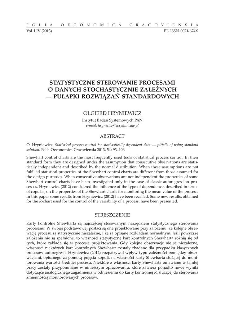 F O L I A O E C O N O M I C A C R A C O V I E N S I A Vol. LIV (2013) PL ISSN 0071-674X STATYSTYCZNE STEROWANIE PROCESAMI O DANYCH STOCHASTYCZNIE ZALEŻNYCH — PUŁAPKI ROZWIĄZAŃ STANDARDOWYCH OLGIERD HRYNIEWICZ Instytut Badań Systemowych PAN e-mail: [email protected] ABSTRACT O. Hryniewicz. Statistical process control for stochastically dependent data — pitfalls of using standard solution. Folia Oeconomica Cracoviensia 2013, 54: 93–106. Shewhart control charts are the most frequently used tools of statistical process control. In their standard form they are designed under the assumption that consecutive observations are statistically independent and described by the normal distribution. When these assumptions are not fulfilled statistical properties of the Shewhart control charts are different from those assumed for the design purposes. When consecutive observations are not independent the properties of some Shewhart control charts have been investigated only in the case of classic autoregression processes. Hryniewicz (2012) considered the influence of the type of dependence, described in terms of copulas, on the properties of the Shewhart charts for monitoring the mean value of the process. In this paper some results from Hryniewicz (2012) have been recalled. Some new results, obtained for the R-chart used for the control of the variability of a process, have been presented. STRESZCZENIE Karty kontrolne Shewharta są najczęściej stosowanym narzędziem statystycznego sterowania procesami. W swojej podstawowej postaci są one projektowane przy założeniu, że kolejne obserwacje procesu są statystycznie niezależne, i że są opisane rozkładem normalnym. Jeśli powyższe założenia nie są spełnione, to własności statystyczne kart kontrolnych Shewharta różnią się od tych, które zakłada się w procesie projektowania. Gdy kolejne obserwacje nie są niezależne, własności niektórych kart kontrolnych Shewharta zostały zbadane dla przypadku klasycznych procesów autoregresji. Hryniewicz (2012) rozpatrywał wpływ typu zależności pomiędzy obserwacjami, opisanego za pomocą pojęcia kopuli, na własności karty Shewharta służącej do monitorowania wartości średniej procesu. Niektóre z własności karty Shewharta omawiane w tamtej pracy zostały przypomniane w niniejszym opracowaniu, które zawiera ponadto nowe wyniki dotyczące analogicznego zagadnienia w odniesieniu do karty kontrolnej R, służącej do sterowania zmiennością monitorowanych procesów. 94 KEY WORDS — SŁOWA KLUCZOWE Karty kontrolne Shewharta, obserwacje zależne, średnia długość przebiegu Shewhart control charts, dependent observations, average run length 1. WPROWADZENIE Statystyczne sterowanie procesami (Statistical Process Control — SPC) zostało zaproponowane przez Waltera Shewharta w latach dwudziestych ubiegłego wieku. Przez wiele lat stanowiło mało popularny dział statystycznego sterowania jakością (Statistical Quality Control — SQC), zwanego tradycyjnie w Polsce statystyczną kontrolą jakości (SKJ). Przez wiele lat procedury statystycznej kontroli odbiorczej stanowiły podstawowe narzędzia SQC, co — moim zdaniem — w pełni uzasadniało tradycyjną wersję polskiego tłumaczenia angielskiego terminu SQC. Dopiero wprowadzenie do repertuaru narzędzi SPC statystycznych metod sekwencyjnych takich jak karty kontrolne sum skumulowanych (CUSUM) spowodowało, że zagadnieniami SPC zaczęło zajmować się na świecie wielu badaczy. Jeżeli dodamy, że praktyka produkcyjna wymusiła zwiększenie wagi narzędzi SPC względem wagi narzędzi statystycznej kontroli odbiorczej, to stanie się jasne, że obecnie statystyczne sterowanie procesami (SPC) stanowi główny dział statystycznego sterowania jakością, a przez wielu praktyków jest z nim po prostu utożsamiane. Statystyczna kontrola jakości, rozumiana w zasadzie jako statystyczna kontrola odbiorcza, była przedmiotem zainteresowania polskich naukowców (Obalski, Oderfeld, Steinhaus) od początku lat pięćdziesiątych ubiegłego wieku. W tym czasie powstało wiele polskich norm statystycznej kontroli odbiorczej, które wyróżniały się na świecie swoją oryginalnością. Natomiast problemami SPC zajmowało się w Polsce niewielu praktyków, nie wykraczając poza zastosowanie znanych na całym świecie (i stosowanych powszechnie do dzisiaj) kart kontrolnych Shewharta. Śp. Profesor Andrzej Iwasiewicz, pamięci którego poświęcone jest niniejsze wydawnictwo, był pierwszym polskim naukowcem, który prowadził badania naukowe nad nowymi narzędziami SPC, a także wprowadzał je do praktyki. Najważniejszym owocem jego prac w tym zakresie była wydana przez PWN oryginalna monografia Statystyczna kontrola jakości w toku produkcji: systemy i procedury — Iwasiewicz (1985). Można więc przyjąć, że był On w Polsce prekursorem badań nad nowoczesnymi metodami statystycznego sterowania procesami. Od okresu pionierskiego w zakresie badań nad procedurami SPC upłynęło już wiele lat. W międzyczasie powstało wiele prac naukowych napisanych przez wybitnych naukowców i poświęconych temu zagadnieniu. Dla potrzeb statystycznego sterowania procesami zaproponowano wykorzystanie zaawansowanych metod statystycznych, często powstałych w innych obszarach zastosowań 95 statystyki matematycznej. Powstało też wiele prac, w których zaproponowano różne metody pozwalające odejść od podstawowego paradygmatu tradycyjnego SPC, jakim jest przyjęcie niezależności wyników pomiarów opisujących te procesy charakterystyk jakościowych. Zostały zaproponowane nowe statystyczne procedury kontrolne, które odznaczały się jednak dużym (w ocenie praktyków) stopniem skomplikowania. W pracach tych przyjmowano pewne popularne modele zależności pomiędzy wynikami kolejnych pomiarów, nie wykraczając przy tym poza opis procesu wykorzystujący pojęcie wielowymiarowego rozkładu normalnego. W pionierskiej pracy — Hrynie