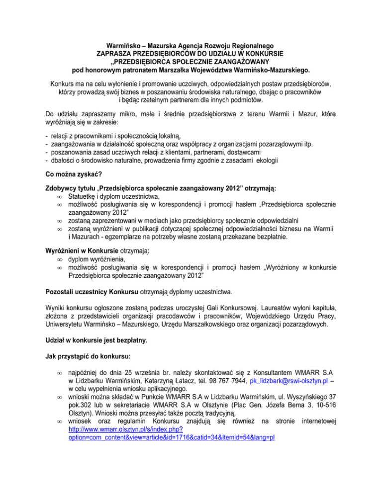 Warmińsko – Mazurska Agencja Rozwoju Regionalnego ZAPRASZA PRZEDSIĘBIORCÓW DO UDZIAŁU W KONKURSIE „PRZEDSIĘBIORCA SPOŁECZNIE ZAANGAŻOWANY pod honorowym patronatem Marszałka Województwa Warmińsko-Mazurskiego. Konkurs ma na celu wyłonienie i promowanie uczciwych, odpowiedzialnych postaw przedsiębiorców, którzy prowadzą swój biznes w poszanowaniu środowiska naturalnego, dbając o pracowników i będąc rzetelnym partnerem dla innych podmiotów. Do udziału zapraszamy mikro, małe i średnie przedsiębiorstwa z terenu Warmii i Mazur, które wyróżniają się w zakresie: - relacji z pracownikami i społecznością lokalną, zaangażowania w działalność społeczną oraz współpracy z organizacjami pozarządowymi itp. poszanowania zasad uczciwych relacji z klientami, partnerami, dostawcami dbałości o środowisko naturalne, prowadzenia firmy zgodnie z zasadami ekologii Co można zyskać? Zdobywcy tytułu „Przedsiębiorca społecznie zaangażowany 2012” otrzymają: • Statuetkę i dyplom uczestnictwa, • możliwość posługiwania się w korespondencji i promocji hasłem „Przedsiębiorca społecznie zaangażowany 2012” • zostaną zaprezentowani w mediach jako przedsiębiorcy społecznie odpowiedzialni • zostaną wyróżnieni w publikacji dotyczącej społecznej odpowiedzialności biznesu na Warmii i Mazurach - egzemplarze na potrzeby własne zostaną przekazane bezpłatnie. Wyróżnieni w Konkursie otrzymają: • dyplom wyróżnienia, • możliwość posługiwania się w korespondencji i promocji hasłem „Wyróżniony w konkursie Przedsiębiorca społecznie zaangażowany 2012” Pozostali uczestnicy Konkursu otrzymają dyplomy uczestnictwa. Wyniki konkursu ogłoszone zostaną podczas uroczystej Gali Konkursowej. Laureatów wyłoni kapituła, złożona z przedstawicieli organizacji pracodawców i pracowników, Wojewódzkiego Urzędu Pracy, Uniwersytetu Warmińsko – Mazurskiego, Urzędu Marszałkowskiego oraz organizacji pozarządowych. Udział w konkursie jest bezpłatny. Jak przystąpić do konkursu: • • • najpóźniej do dnia 25 września br. należy skontaktować się z Konsultantem WMARR S.A w Lidzbarku Warmińskim, Katarzyną Łatacz, tel. 98 767 7944, [email protected] – w celu wypełnienia wniosku aplikacyjnego. wnioski można składać w Punkcie WMARR S.A w Lidzbarku Warmińskim, ul. Wyszyńskiego 37 pok.302 lub w sekretariacie WMARR S.A w Olsztynie (Plac Gen. Józefa Bema 3, 10-516 Olsztyn). Wnioski można przesyłać także pocztą tradycyjną. wniosek oraz regulamin Konkursu znajdują się również na stronie internetowej http://www.wmarr.olsztyn.pl/s/index.php? option=com_content&view=article&id=1716&catid=34&Itemid=54&lang=pl