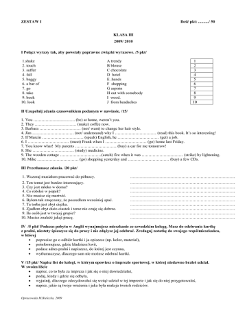 ZESTAW I Ilość pkt: ........../ 50 KLASA III 2009/ 2010 I Połącz wyrazy tak, aby powstały poprawne związki wyrazowe. /5 pkt/ 1.shake 2. touch 3. suffer 4. fall 5. baggy 6. a bar of 7. go 8. take 9. book 10. look A trendy B blouse C chocolate D hotel E .hands F shopping G aspirin H out with somebody I wood. J from headaches 1 2 3 4 5 6 7 8 9 10 II Uzupełnij zdania czasownikiem podanym w nawiasie. /15/ 1. You ………………………… (be) at home, weren’t you. 2. They ………………………… (make) coffee now. 3. Barbara ………………………… (not/ want) to change her hair style. 4. Jim ………………………… (not/ understand) why I ………………………… (read) this book. It’s so interesting! 5. If Marcin ………………………… (speak) English, he ………………………… (get) a job. 6. I ………………………… (meet) Frank when I ………………………… (go) home last Friday. 7. You know what! My parents ………………………… (buy) a car for me tomorrow! 8. She ………………………… (study) medicine. 9. The wooden cottage …………………………(catch) fire when it was ………………………… (strike) by lightening. 10. Mike ………………………… (go) shopping yesterday and ………………………… (buy) a few CDs. III Przetłumacz zdania. /20 pkt/ 1. Wczoraj musiałem pracować do północy. …………………………………………………………………. 2. Ten temat jest bardzo interesujący. 3. Czy jest mleko w domu? 4. Co robiłeś w piątek? 5. Nie musisz się martwić. 6. Byłem tak zmęczony, Ŝe poszedłem wcześniej spać. 7. Ta torba jest zbyt cięŜka. 8. Zjadłem zbyt duŜo ciastek i teraz nie czuję się dobrze. 9. Ile osób jest w twojej grupie? 10. Musisz znaleźć jakąś pracę. …………………………………………………………………. …………………………………………………………………. …………………………………………………………………. …………………………………………………………………. …………………………………………………………………. …………………………………………………………………. …………………………………………………………………. …………………………………………………………………. …………………………………………………………………. IV /5 pkt/ Podczas pobytu w Anglii wynajmujesz mieszkanie ze szwedzkim kolegą. Masz do odebrania kurtkę z pralni, niestety śpieszysz się do pracy i nie zdąŜysz jej odebrać. Zredaguj notatkę do swojego współmieszkańca, w której • poprosisz go o odbiór kurtki i ja opiszesz (np. kolor, materiał), • poinformujesz, gdzie kładziesz kwit, • podasz adres pralni i napiszesz, do której jest czynna, • wytłumaczysz, dlaczego sam nie moŜesz odebrać kurtki. V /15 pkt/ Napisz list do kolegi, w którym opowiesz o imprezie sportowej, w której niedawno brałeś udział. W swoim liście • napisz, co to była za impreza i jak się o niej dowiedziałaś, • podaj, kiedy i gdzie się odbyła, • wyjaśnij, dlaczego zdecydowałaś się wziąć udział w tej imprezie i jak się do niej przygotowałaś, • napisz, jakie są twoje wraŜenia i jaka była reakcja twoich rodziców. Opracowała M.Bielecka, 2009 ZESTAW II Ilość pkt: ........../ 47 KLASA III 2009/ 2010 I Połącz wyrazy tak, aby powstały poprawne związki wyrazowe. (5 pkt) 1. examine 2. a can of 3. go 4. have 5. swollen 6. send 7. congratulations 8. make 9. action 10. fizzy A B C D E F G H I J knee on your wedding. complaint drink film Coke to hospital a greeting card the patients fun 1 2 3 4 5 6 7 8 9 10 II Uzupełnij zdania czasownikiem podanym w nawiasie. (12 pkt) 1. If you ………………………… (not/ give up) smoking, you can be ill. 2. He ………………………… (die) from cancer. 3. Somebody ………………………… (invent) instant coffee. 4. She never ………………………… (rest). 5. The schools year in Poland ………………………… (start) on 1st September. 6. If the weather ………………………… (be) fine, we ………………………… (go) for a walk. 7. I know my room is messy. I ………………………… (tidy) later. 8. The sun ………………………… (shine) when I ………………………… (decide) to go to the park. 9. Yesterday, between 6 pm and 9 pm I ………………………… (do) my homework. 20. It’s the second time I ………………………… (eat) lobsters. III Przetłumacz zdania. /20 pkt/ 1. Wczoraj musiałem pracować do północy. …………………………………………………………………. 2. Ten temat jest bardzo interesujący. 3. Czy jest mleko w domu? 4. Co robiłeś w piątek? 5. Nie musisz się martwić. 6. Byłem tak zmęczony, Ŝe poszedłem wcześniej spać. 7. Ta torba jest zbyt cięŜka. 8. Zjadłem zbyt duŜo ciastek i teraz nie czuję się dobrze. 9. Ile osób jest w twojej grupie? 10. Musisz znaleźć jakąś pracę. …………………………………………………………………. …………………………………………………………………. …………………………………………………………………. …………………………………………………………………. …………………………………………………………………. …………………………………………………………………. …………………………………………………………………. …………………………………………………………………. …………………………………………………………………. IV Przebywasz na obozie językowym na Malcie. Napisz pocztówkę do swojego ko