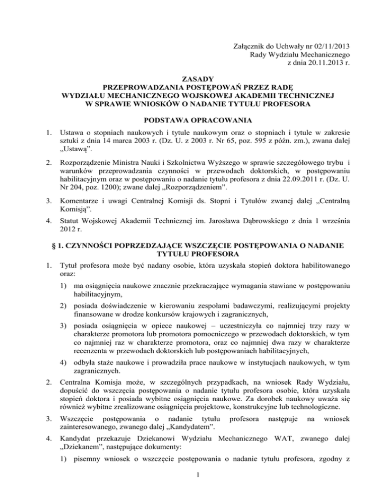 Załącznik do Uchwały nr 02/11/2013 Rady Wydziału Mechanicznego z dnia 20.11.2013 r. ZASADY PRZEPROWADZANIA POSTĘPOWAŃ PRZEZ RADĘ WYDZIAŁU MECHANICZNEGO WOJSKOWEJ AKADEMII TECHNICZNEJ W SPRAWIE WNIOSKÓW O NADANIE TYTUŁU PROFESORA PODSTAWA OPRACOWANIA 1. Ustawa o stopniach naukowych i tytule naukowym oraz o stopniach i tytule w zakresie sztuki z dnia 14 marca 2003 r. (Dz. U. z 2003 r. Nr 65, poz. 595 z późn. zm.), zwana dalej „Ustawą”. 2. Rozporządzenie Ministra Nauki i Szkolnictwa Wyższego w sprawie szczegółowego trybu i warunków przeprowadzania czynności w przewodach doktorskich, w postępowaniu habilitacyjnym oraz w postępowaniu o nadanie tytułu profesora z dnia 22.09.2011 r. (Dz. U. Nr 204, poz. 1200); zwane dalej „Rozporządzeniem”. 3. Komentarze i uwagi Centralnej Komisji ds. Stopni i Tytułów zwanej dalej „Centralną Komisją”. 4. Statut Wojskowej Akademii Technicznej im. Jarosława Dąbrowskiego z dnia 1 września 2012 r. § 1. CZYNNOŚCI POPRZEDZAJĄCE WSZCZĘCIE POSTĘPOWANIA O NADANIE TYTUŁU PROFESORA 1. Tytuł profesora może być nadany osobie, która uzyskała stopień doktora habilitowanego oraz: 1) ma osiągnięcia naukowe znacznie przekraczające wymagania stawiane w postępowaniu habilitacyjnym, 2) posiada doświadczenie w kierowaniu zespołami badawczymi, realizującymi projekty finansowane w drodze konkursów krajowych i zagranicznych, 3) posiada osiągnięcia w opiece naukowej – uczestniczyła co najmniej trzy razy w charakterze promotora lub promotora pomocniczego w przewodach doktorskich, w tym co najmniej raz w charakterze promotora, oraz co najmniej dwa razy w charakterze recenzenta w przewodach doktorskich lub postępowaniach habilitacyjnych, 4) odbyła staże naukowe i prowadziła prace naukowe w instytucjach naukowych, w tym zagranicznych. 2. Centralna Komisja może, w szczególnych przypadkach, na wniosek Rady Wydziału, dopuścić do wszczęcia postępowania o nadanie tytułu profesora osobie, która uzyskała stopień doktora i posiada wybitne osiągnięcia naukowe. Za dorobek naukowy uważa się również wybitne zrealizowane osiągnięcia projektowe, konstrukcyjne lub technologiczne. 3. Wszczęcie postępowania o nadanie tytułu zainteresowanego, zwanego dalej „Kandydatem”. 4. Kandydat przekazuje Dziekanowi Wydziału Mechanicznego WAT, zwanego dalej „Dziekanem”, następujące dokumenty: profesora następuje na wniosek 1) pisemny wniosek o wszczęcie postępowania o nadanie tytułu profesora, zgodny z 1 załącznikiem nr 1; 2) oświadczenie o posiadaniu stopni naukowych doktora i doktora habilitowanego wraz z informacją o jednostkach, które nadały te stopnie (ewentualnie oświadczenie o nabyciu uprawnień równoważnych z uprawnieniami doktora habilitowanego); 3) autoreferat przedstawiający osiągnięcia naukowe oraz informację o osiągnięciach w zakresie opieki naukowej i kształcenia młodej kadry, w tym o ukończonych przewodach doktorskich, w których pełnił funkcję promotora lub promotora pomocniczego, a także o działalności popularyzującej naukę, przed i po uzyskaniu stopnia doktora habilitowanego, w języku polskim i angielskim; 4) ankietę oceny osiągnięć naukowych po uzyskaniu stopnia doktora habilitowanego, sporządzoną według wzoru określonego w załączniku nr 2, w języku polskim i angielskim; 5) wykaz przedstawianych dokumentów. 5. Jeżeli kandydat nie jest pracownikiem Wydziału Mechanicznego WAT, zwanego dalej „Wydziałem”, do wymienionych wyżej dokumentów powinien również załączyć: a) uzasadnienie wyboru Rady Wydziału Mechanicznego WAT, zwanej dalej „Radą Wydziału” jako rady przeprowadzającej postępowanie o nadanie tytułu profesora; b) zobowiązanie do pokrycia kosztów postępowania o nadanie tytułu naukowego przez kandydata lub zatrudniającą go instytucję. 6. Dokumentację wymaganą do wszczęcia postępowania o nadanie tytułu profesora kandydat sporządza w formie elektronicznej oraz w formie papierowej i przekazuje osobiście Dziekanowi. Otrzymaną dokumentację Dziekan przekazuje do komisji ds. nauki i rozwoju najpóźniej na dwa tygodnie przed planowanym posiedzeniem Rady Wydziału, na którym ma być rozpatrywany wniosek. 7. Przed wszczęciem postępowania kandydat może być poproszony przez Dziekana o przedstawienie najważniejszych osiągnięć naukowych na seminarium wydziałowym. Termin i miejsce seminarium wyznacza Dziekan. Na seminarium zaproszeni są członkowie Rady Wydziału posiadający tytuł profesora lub stopień doktora habilitowanego. Koszty postępowania o nadanie tytułu profesora pokrywa: a) w przypadku osoby zatrudnionej w pełnym wymiarze czasu pracy na Wydziale Mechanicznym WAT – Wydział, 8. b) w przypadku kandydata niezatrudnionego na Wydziale Mechanicznym WAT w pełnym wymiarze czasu pracy osoba zainteresowana lub instytucja ją zatrudniająca. 9. Obowiązek przygotowania dokumentacji niezbędnej do wszczęcia postępowania spoczywa na osobie ubiegającej się o nadanie tytułu profesora. 10. W przypadku, gdy osobą ubiegającą się o nadanie tytułu profesora jest Dziekan Wydziału Mechanicznego WAT, jego obowiązki w czynnościach postępowania przejmuje Prodziekan ds. Naukowych lub członek Rady Wydziału, posiadający tytuł profesora, wskazany w głosowaniu przez Radę Wydziału. § 2. WSZCZĘCIE POSTĘPOWANIA O NADANIE TYTUŁU PROFESORA 1. Czynności postępowania w sprawach o nadanie tytułu profesora kończą się uchwałami Rady Wydziału w przedmiocie: 1) wszczęcia lub odmowy wszczęcia postępowania o nadanie tytułu profesora; 2 2) wyznaczenia lub odmowy wyznaczenia kandydatów na recenzentów; 3) poparcia lub odmowy poparcia wniosku o nadanie tytułu profesora. 2. Do głosowania nad czynnościami postępowania o nadanie tytułu naukowego są uprawnieni członkowie Rady Wydziału posiadający tytuł profesora lub stopień doktora habilitowanego oraz recenzenci dorobku naukowego kandydata, od momentu ich 