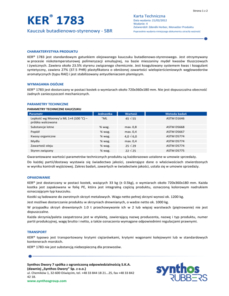 Strona 1 z 2 Karta Techniczna ® KER 1783 Data wydania: 21/02/2012 Wydanie: 4 Zatwierdził: Zdeněk Herber, Menadżer Produktu Kauczuk butadienowo-styrenowy - SBR Poprzednie wydania niniejszego dokumentu utraciły ważność CHARAKTERYSTYKA PRODUKTU KER® 1783 jest standardowym gatunkiem olejowanego kauczuku butadienowo-styrenowego. Jest otrzymywany w procesie niskotemperaturowej polimeryzacji emulsyjnej, na bazie mieszaniny mydeł kwasów tłuszczowych i żywicznych. Zawiera około 23.5% styrenu związanego chemicznie. Jest koagulowany systemem kwas i koagulant syntetyczny, zawiera 27% (37.5 PHR) plastyfikatora o obniżonej zawartości wielopierścieniowych węglowodorów aromatycznych (typu RAE) i jest stabilizowany antyutleniaczem plamiącym. WYMAGANIA OGÓLNE KER® 1783 jest dostarczany w postaci kostek o wymiarach około 720x360x180 mm. Nie jest dopuszczalna obecność żadnych zanieczyszczeń mechanicznych. PARAMETRY TECHNICZNE PARAMETRY TECHNICZNE KAUCZUKU Parametr Lepkość wg Mooney’a ML 1+4 (100 °C) – próbka walcowana Substancje lotne Popiół Kwasy organiczne Jednostka °ML Wartość % wag. % wag. % wag. max. 0,8 max. 0,4 Mydła Zawartość oleju % wag. % wag. Styren związany % wag. 45 ÷ 55 4,0 ÷ 6,0 max. 0,4 Metoda badań ASTM D1646 ASTM D5668 ASTM D5667 ASTM D5774 25 ÷ 29 ASTM D5774 ASTM D5774 22 ÷ 25 ASTM D5775 Gwarantowane wartości parametrów technicznych produktu są każdorazowo ustalone w umowie sprzedaży. Do każdej partii/dostawy wystawia się świadectwo jakości, zawierające dane o właściwościach stwierdzonych w wyniku kontroli wyjściowej. Zakres badań, zawartych w świadectwie jakości, ustala się w umowie sprzedaży. OPAKOWANIE KER® jest dostarczany w postaci kostek, ważących 33 kg (± 0.5kg), o wymiarach około 720x360x180 mm. Każda kostka jest zapakowana w folię PE, która jest integralną częścią produktu, oznaczoną kolorowym nadrukiem oznaczającym typ kauczuku. Kostki są ładowane do zwrotnych skrzyń metalowych. Waga netto pełnej skrzyni wynosi ok. 1200 kg. Jest możliwe dostarczanie produktu w skrzyniach drewnianych, o wadze netto ok. 1000 kg. W przypadku skrzyń drewnianych 1.0 t przechowywanie ich w 2 lub więcej warstwach (piętrowanie) nie jest dopuszczalne. Każda skrzynia/paleta zaopatrzona jest w etykietę, zawierającą nazwę producenta, nazwę i typ produktu, numer partii produkcyjnej, wagę brutto i netto, a także oznaczenia wymagane odpowiednimi regulacjami prawnymi. TRANSPORT KER® typowo jest transportowany krytymi ciężarówkami, krytymi wagonami kolejowymi lub w standardowych kontenerach morskich. KER® 1783 nie jest substancją niebezpieczną dla przewozów. Synthos Dwory 7 spółka z ograniczoną odpowiedzialnością S.K.A. (dawniej „Synthos Dwory” Sp. z o.o.) ul. Chemików 1, 32-600 Oświęcim, tel. +48 33 844 18 21...25, fax +48 33 842 42 18. www.synthosgroup.com Strona 2 z 2 PRZECHOWYWANIE Produkt powinien być przechowywany w zadaszonych pomieszczeniach, chroniony przed bezpośrednim promieniowaniem słonecznym i co najmniej 2 metry od grzejników, w temperaturze nie przekraczającej 30°C. W podanych warunkach KER® można przechowywać przez okres dwunastu (12) miesięcy od daty produkcji. ZASTOSOWANIE KER® 1783 służy do produkcji mieszanek gumowych, stosowanych do wytwarzania opon samochodowych, a także bieżnikowania, taśm transporterowych i różnych gumowych artykułów technicznych. Nie jest przeznaczony do produkcji artykułów gumowych przeznaczonych do kontaktu z żywnością i wodą pitną. Niniejszy dokument ma charakter informacyjny. Informacje w nim podane oparte są na aktualnym stanie wiedzy i doświadczeniu. Nie stanowią one gwarancji własności produktu ani specyfikacji jakościowej i nie mogą być podstawą do reklamacji. Przedstawione informacje nie mogą mieć zastosowania dla mieszanin produktu z innymi substancjami. Produkt powinien być transportowany, magazynowany i stosowany zgodnie z obowiązującymi przepisami i odpowiednią praktyką higieny pracy. Wykorzystanie podanych informacji jak też sposób zastosowania produktu nie są kontrolowane przez producenta, i zatem określenie warunków bezpieczeństwa stosowania produktu jest obowiązkiem użytkownika. Synthos Dwory 7 spółka z ograniczoną odpowiedzialnością S.K.A. (dawniej „Synthos Dwory” Sp. z o.o.) ul. Chemików 1, 32-600 Oświęcim, tel. +48 33 844 18 21...25, fax +48 33 842 42 18. www.synthosgroup.com