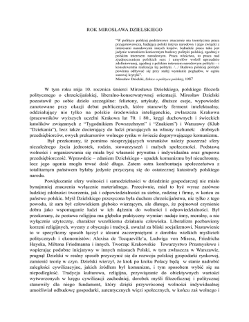 ROK MIROSŁAWA DZIELSKIEGO “W polityce polskiej podstawowe znaczenie ma teoretyczna praca przygotowawcza, badająca polski interes narodowy i jego związki z interesami narodowymi innych krajów. Jednakże praca taka jest jedynie warunkiem koniecznym budowy polityki polskiej, zgodnej z polskim interesem narodowym. Praca właściwa, to praca nad zjednoczeniem polskich serc i umysłów wokół uprzednio zdefiniowanej, zgodnej z polskim interesem narodowym polityki – i konsekwentna realizacja tej polityki. /.../ Budowa polskiej polityki powinna odbywać się przy stałej wymianie poglądów, w ogniu surowej krytyki”. Mirosław Dzielski, Szkice o polityce polskiej, 1987 W tym roku mija 10. rocznica śmierci Mirosława Dzielskiego, polskiego filozofa politycznego o chrześcijańskiej, liberalno-konserwatywnej orientacji. Mirosław Dzielski pozostawił po sobie dzieło szczególne: felietony, artykuły, dłuższe eseje, wypowiedzi zanotowane przy okazji debat publicznych, które stanowiły ferment intelektualny, oddziałujący nie tylko na polskie środowiska inteligenckie, zwłaszcza Krakowa (pracowników wyższych uczelni Krakowa lat 70. i 80., kręgi duchownych i świeckich katolików związanych z “Tygodnikiem Powszechnym” i “Znakiem”) i Warszawy (Klub “Dziekania”), lecz także docierający do ludzi pracujących na własny rachunek: drobnych przedsiębiorców, owych prekursorów wolnego rynku w świecie dogorywającego komunizmu. Był przekonany, iż pomimo niesprzyjających warunków należy poszerzać sfery niezależnego życia jednostek, rodzin, stowarzyszeń i małych społeczności. Podstawą wolności i organizowania się miała być własność prywatna i indywidualna oraz grupowa przedsiębiorczość. Wprawdzie – zdaniem Dzielskiego - upadek komunizmu był nieuchronny, lecz jego agonia mogła trwać dość długo. Zatem ostra konfrontacja społeczeństwa z totalitarnym państwem byłaby jedynie przyczyną się do ostatecznej katastrofy polskiego narodu. Powiększanie sfery wolności i samodzielności w dziedzinie gospodarczej nie miało bynajmniej znaczenia wyłącznie materialnego. Przeciwnie, miał to być wyraz zarówno ludzkiej zdolności tworzenia, jak i odpowiedzialności za siebie, rodzinę i firmę, w końcu za państwo polskie. Myśl Dzielskiego przesycona była duchem chrześcijaństwa, nie tylko z tego powodu, iż sam był człowiekiem głęboko wierzącym, ale dlatego, że pojmował czynienie dobra jako wspomaganie ludzi w ich dążeniu do wolności i odpowiedzialności. Był przekonany, że postawa religijna ma głęboko praktyczny wymiar: nadaje inny, moralny, a nie wyłącznie użyteczny, charakter wszelkiemu działaniu człowieka. Liberalizm pozbawiony korzeni religijnych, wyzuty z obyczaju i tradycji, uważał za bliski socjalizmowi. Nastawienie to w specyficzny sposób łączył z ideami zaczerpniętymi z dorobku wielkich myślicieli politycznych i ekonomistów: Alexisa de Tocqueville’a, Ludwiga von Misesa, Friedricha Hayeka, Miltona Friedmanna i innych. Tworząc Krakowskie Towarzystwo Przemysłowe i wspierając podobne inicjatywy w innych miastach Polski, w tym zwłaszcza w Warszawie, pragnął Dzielski w realny sposób przyczynić się do rozwoju polskiej gospodarki rynkowej, zamienić teorię w czyn. Dzielski wierzył, że krok po kroku Polacy będą w stanie nadrobić zaległości cywilizacyjne, jakich źródłem był komunizm, i tym sposobem wybić się na niepodległość. Tradycja kulturowa, religijna, przywiązanie do obiektywnych wartości wytworzonych w kręgu cywilizacji zachodniej, dorobek myśli filozoficznej i politycznej stanowiły dla niego fundament, który dzięki przywróconej wolności indywidualnej umożliwiał odbudowę gospodarki, autentycznych więzi społecznych, w końcu zaś wolnego i dobrze zorganizowanego polskiego państwa. Ogłaszając 1999 rok rokiem Mirosława Dzielskiego Centrum im. M. Dzielskiego w Krakowie, Centrum im A. Smitha, Ośrodek Myśli Politycznej w Krakowie i Krakowskie Towarzystwo Przemysłowe pragną przypomnieć myśl i działalność autora Odrodzenia ducha – budowy wolności, bez której nie sposób zrozumieć przemiany duchowej, intelektualnej, moralnej i politycznej jaka dokonała się w ostatnich piętnastu latach poprzedzających i zarazem umożliwiających przełom 1989 roku. Bez znajomości spuścizny Dzielskiego nie można również w pełni pojąć złożonej natury procesów jakie dokonują się w Polsce w ostatniej dekadzie. Powracamy do dorobku Dzielskiego nie tylko po to, by dokonywać jego egzegezy, lecz by wskazać na fundamentalne znaczenie postawy jaką w nim odnajdujemy: rzetelności w opisie i wyjaśnianiu zachodzących procesów, trzeźwości w ocenie sytuacji, realizmu proponowanych rozwiązań, wierności zasadom moralnym i unikaniu taniego moralizowania. Organizując konferencje, seminaria, debaty, wydając publikacje, udostępniając szerszej publiczności wybór najważniejszych tekstów Dzielskiego pragniemy przeprowadzić wnikliwą debatę nad stanem naszego państwa, perspektywami jego rozwoju i naturą zagrożeń jakie się rysują. Chcemy skupić się na przyczynach słabości naszego państwa, przejawiającej się w korupcji, w braku jasnych koncepcji rozwiązywania najbardziej palących problemów społecznych i gospodarczych, niewydolności sądownictwa i policji. Przedmiotem namysłu winien być także stan naszej klasy politycznej i czynników zań odpowiedzialnych. Debata musi także objąć zagadnienia polskiej racji stanu, zasad polityki wewnętrznej i zagranicznej, w związku z naszym członkostwem w NATO i rychłym przystąpieniem do Unii Europejskiej. Rok Mirosława Dzielskiego ma służyć pogłębionej analizie minionego dziesięciolecia. W ten sposób nawiązując do tego, który wniósł tak znaczący wkład do odbudowy nowej, wolnej Polski, pragniemy przysłużyć się młodemu polskiemu państwu.