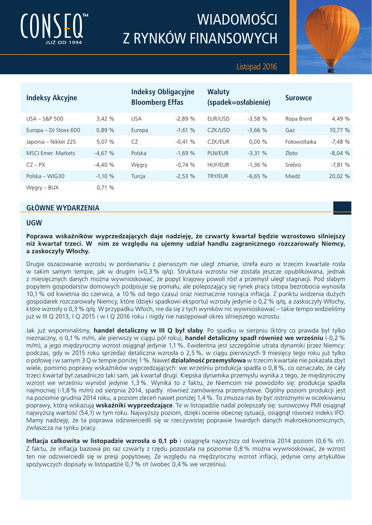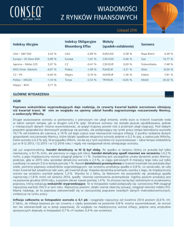 WIADOMOŚCI Z RYNKÓW FINANSOWYCH Listopad 2016 Indeksy Akcyjne Indeksy Obligacyjne Bloomberg Effas Waluty (spadek=osłabienie) Surowce USA – S&P 500 3,42 % USA -2,89 % EUR/USD -3,58 % Ropa Brent 4,49 % Europa – DJ Stoxx 600 0,89 % Europa -1,61 % CZK/USD -3,66 % Gaz 10,77 % Japonia – Nikkei 225 5,07 % CZ -0,41 % CZK/EUR 0,00 % Fotowoltaika -7,48 % MSCI Emer. Markets -4,67 % Polska -1,69 % PLN/EUR -3,31 % Złoto -8,04 % CZ – PX -4,40 % Węgry -0,74 % HUF/EUR -1,36 % Srebro -7,81 % Polska – WIG30 -1,10 % Turcja -2,53 % TRY/EUR -6,65 % Miedź 20,02 % Węgry – BUX 0,71 % GŁÓWNE WYDARZENIA UGW Poprawa wskaźników wyprzedzających daje nadzieję, że czwarty kwartał będzie wzrostowo silniejszy niż kwartał trzeci. W nim ze względu na ujemny udział handlu zagranicznego rozczarowały Niemcy, a zaskoczyły Włochy. Drugie oszacowanie wzrostu w porównaniu z pierwszym nie uległ zmianie, strefa euro w trzecim kwartale rosła w takim samym tempie, jak w drugim (+0,3 % q/q). Struktura wzrostu nie została jeszcze opublikowana, jednak z miesięcznych danych można wywnioskować, że popyt krajowy powoli rósł a przemysł uległ stagnacji. Pod słabym popytem gospodarstw domowych podpisuje się pomału, ale polepszający się rynek pracy (stopa bezrobocia wynosiła 10,1 % od kwietnia do czerwca, a 10 % od tego czasu) oraz nieznacznie rosnąca inflacja. Z punktu widzenia dużych gospodarek rozczarowały Niemcy, które (dzięki spadkowi eksportu) wzrosły jedynie o 0,2 % q/q, a zaskoczyły Włochy, które wzrosły o 0,3 % q/q. W przypadku Włoch, nie da się z tych wyników nic wywnioskować – takie tempo widzieliśmy już w III Q 2013, I Q 2015 i w I Q 2016 roku i nigdy nie następował okres silniejszego wzrostu. Jak już wspominaliśmy, handel detaliczny w III Q był słaby. Po spadku w sierpniu (który co prawda był tylko nieznaczny, o 0,1 % m/m, ale pierwszy w ciągu pół roku), handel detaliczny spadł również we wrześniu (-0,2 % m/m), a jego międzyroczny wzrost osiągnął jedynie 1,1 %. Ewidentna jest szczególnie utrata dynamiki przez Niemcy: podczas, gdy w 2015 roku sprzedaż detaliczna wzrosła o 2,5 %, w ciągu pierwszych 9 miesięcy tego roku już tylko o połowę i w samym 3 Q w tempie poniżej 1 %. Nawet działalność przemysłowa w trzecim kwartale nie pokazała zbyt wiele, pomimo poprawy wskaźników wyprzedzających: we wrześniu produkcja spadła o 0,8 %, co oznaczało, że cały trzeci kwartał był zasadniczo taki sam, jak kwartał drugi. Kiepska dynamika przemysłu wynika z tego, że międzyroczny wzrost we wrześniu wyniósł jedynie 1,3 %. Wynika to z faktu, że Niemcom nie powodziło się: produkcja spadła najmocniej (-1,8 % m/m) od sierpnia 2014, spadły również zamówienia przemysłowe. Ogólny poziom produkcji jest na poziomie grudnia 2014 roku, a poziom zleceń nawet poniżej 1,4 %. To zmusza nas by być ostrożnymi w oczekiwaniu poprawy, którą wskazują wskaźniki wyprzedzające. Te w listopadzie nadal polepszały się: surowcowy PMI osiągnął najwyższą wartość (54,1) w tym roku. Najwyższy poziom, dzięki ocenie obecnej sytuacji, osiągnął również indeks IFO. Mamy nadzieję, że ta poprawa odzwierciedli się w rzeczywistej poprawie twardych danych makroekonomicznych, zwłaszcza na rynku pracy. Inflacja całkowita w listopadzie wzrosła o 0,1 pb i osiągnęła najwyższy od kwietnia 2014 poziom (0,6 % r/r). Z faktu, że inflacja bazowa po raz czwarty z rzędu pozostała na poziomie 0,8 % można wywnioskować, że wzrost ten nie odzwierciedli się w presji popytowej. Ze względu na międzyroczny wzrost inflacji, jedynie ceny artykułów spożywczych dopisały w listopadzie 0,7 % r/r (wobec 0,4 % we wrześniu). IP_Horizont_Invest 9/13/11 6:28 PM Page 1 INVESTIČNÍ PROGRAM INVEST WIADOMOŚCI ZHORIZONT RYNKÓW FINANSOWYCH Informace o produktu Program Horizont Invest je inspirován životem. V mládí je plný dravosti a energie, s přibývajícím stářím preferuje jistoty a bezpečí. V počátku je koncipován razantněji (silnější zastoupení investic s vyšším výnosem a rizikem), s blížícím se závěrem programu se pak poměr investic mění ve prospěch konzervativních, jejichž investiční riziko (a výnos) jsou nižší. 8 Włochy doporučení min. 8 let střední až vysoké (úroveň 4 z 5) max. 4,5 % z hodnoty investice max. 0,5 % ročně z objemu portfolia Dynamické portfolio 2015M07 2015M01 Růstové portfolio Investiční horizont: Riziko: Vstupní poplatek: Manažerský poplatek: 2014M07 2011M07 2011M01 doporučení min. 5 let střední (úroveň 3 z 5) max. 4,0 % z hodnoty investice max. 0,5 % ročně z objemu portfolia 2014M01 Vyvážené portfolio případných výkyvů na trhu, je program zahájen razantněji (silnější zastoupení investic s vyšším výnosem a rizikem). Se zvyšující se investovanou částkou, 2016M07 Liší se poměrem dynamických a konzervativních investičních nástrojů, ovšem u všech platí, že s přibližujícím se koncem 9 programu podíl dynamické složky klesá ve prospěch složky UGW-19 konzervativní. • Dlouhodobé pravidelné investování převážně do rizikových aktiv (zejména akciových fondů) zvyšuje potenciál zhodnocení úspor investora. • Postupné snižování rizikovosti Francja portfolia v posledních letech programu naopak chrání dříve dosažené výnosy a investované prostředky. • Časový horizont lze navrhnout podle potřeb klienta, libovolně ho průběžně upravovat a celý program funguje zcela automaticky bez nutnosti zásahů ze strany investora. 2016M01 10 Které portfolio je pro vás nejvhodnější? Investiční horizont: 7 Riziko: Vstupní poplatek: Manažerský poplatek: USA věkem a blížícím se závěrem programu se pak zastoupení rizikovějších investic snižuje a jsou nahrazovány investicemi konzervativními, jejichž investiční riziko (a výnos) jsou nižší. Wzrost w strefie euro pozostaje słaby,