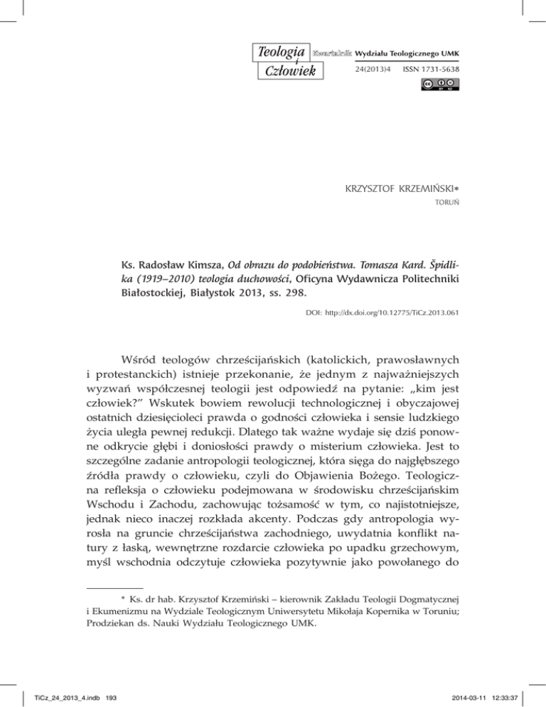 Kwartalnik 24(2013)4 Krzysztof Krzemiński* Toruń Ks. Radosław Kimsza, Od obrazu do podobieństwa. Tomasza Kard. Špidlika (1919–2010) teologia duchowości, Oficyna Wydawnicza Politechniki Białostockiej, Białystok 2013, ss. 298. DOI: http://dx.doi.org/10.12775/TiCz.2013.061 Wśród teologów chrześcijańskich (katolickich, prawosławnych i protestanckich) istnieje przekonanie, że jednym z najważniejszych wyzwań współczesnej teologii jest odpowiedź na pytanie: „kim jest człowiek?” Wskutek bowiem rewolucji technologicznej i obyczajowej ostatnich dziesięcioleci prawda o godności człowieka i sensie ludzkiego życia uległa pewnej redukcji. Dlatego tak ważne wydaje się dziś ponowne odkrycie głębi i doniosłości prawdy o misterium człowieka. Jest to szczególne zadanie antropologii teologicznej, która sięga do najgłębszego źródła prawdy o człowieku, czyli do Objawienia Bożego. Teologiczna refleksja o człowieku podejmowana w środowisku chrześcijańskim Wschodu i Zachodu, zachowując tożsamość w tym, co najistotniejsze, jednak nieco inaczej rozkłada akcenty. Podczas gdy antropologia wyrosła na gruncie chrześcijaństwa zachodniego, uwydatnia konflikt natury z łaską, wewnętrzne rozdarcie człowieka po upadku grzechowym, myśl wschodnia odczytuje człowieka pozytywnie jako powołanego do * Ks. dr hab. Krzysztof Krzemiński – kierownik Zakładu Teologii Dogmatycznej i Ekumenizmu na Wydziale Teologicznym Uniwersytetu Mikołaja Kopernika w Toruniu; Prodziekan ds. Nauki Wydziału Teologicznego UMK. TiCz_24_2013_4.indb 193 2014-03-11 12:33:37 194 Recenzje przebóstwienia. W odróżnieniu od myśli zachodniej, skupiającej się na moralnym działaniu człowieka, antropologia prawosławna jest bardziej wrażliwa na wymiar ontyczny, kosmiczny i apofatyczny. Współczesna teologia zdaje się odkrywać bogactwo wschodniej nauki o człowieku, podejmując wysiłki w kierunku syntezy obu nurtów antropologicznych. Próbę stworzenia organicznej antropologii teologicznej podjął w swojej działalności naukowej kard. Tomasz Špidlik, urodzony na czeskich Morawach jezuita, „teolog niepodzielonego Kościoła” – jak go w 2003 roku po otrzymaniu godności kardynalskiej określił patriarcha Danił. Recenzowana książka prezentuje polskiemu czytelnikowi tę właśnie antropologię, która zdaje się w refleksji o człowieku dzięki biblijnej kategorii imago Dei łączyć katolików i prawosławnych. W tym celu ks. Kimsza poddał krytycznej analizie badawczej cały dorobek naukowy Teologa, wpierw oparty na dziedzictwie chrześcijańskiego Wschodu, a następnie stający się teologią antropologiczną „dwóch płuc Europy” lub – mówiąc językiem bł. Jana Pawła II – „teologią pełnego oddechu”. Praca została zredagowana w siedmiu rozdziałach. W centrum każdego z nich stoi człowiek widziany w świetle Objawienia Bożego jako stworzony na obraz i podobieństwo Boga. W pierwszym rozdziale ks. Kimsza ukazuje właściwą Špidlikowi drogę poznania człowieka. Idzie w tym za myślą pierwotnego chrześcijaństwa, które odczytywało człowieka jako locum revelationis Dei. Oznacza to, że prawda o Bogu jest warunkiem sine qua non dla poznania człowieka. Wielkością człowieka jest bowiem stworzenie na obraz Boży. Myśl wschodnia, bliższa Teologowi, w odróżnieniu od zachodniej, nie tyle skupia swoją uwagę na naturze ludzkiej, ile właśnie na osobowym imago Dei w człowieku. W realizacji powołania do bycia osobą, a nie w naturze Špidlik upatruje istotę człowieka. Jako osoba człowiek jest bytem relacyjnym: istniejącym w odniesieniu do Boga jako początku. Stworzony więc na obraz Wcielonego Słowa staje się bardziej sobą, podobnym do swego Stwórcy, przez aktualizowaną i intensyfikowaną zażyłość z Osobami Boskimi. Coraz pełniejsze życie człowieka polega więc na „nieustannym, progresywnym uduchowianiu się, przemienianiu duszy i ciała poprzez otwieranie się na przemieniające działanie Ducha Świętego” (s. 38). Bycie osobą nie jest wartością dodaną w człowieku, ale istnieje w nim od samego początku. Urzeczywistnia się natomiast wyłącznie w wolności, która stanowi najwyraźniejszy ślad Boga w człowieku. Po upadku grzechowym dokonane wolnym aktem Boga- TiCz_24_2013_4.indb 194 2014-03-11 12:33:37 Recenzje 195 -Człowieka odkupienie przywraca człowiekowi udział w wolności Syna Bożego. Odkupiony i wyzwolony człowiek może zwracać się do Boga jako Ojca oraz w wolności budować relacje z innymi ludźmi. Osoba – jak z upodobaniem podkreśla Špidlik – jest agapiczna to znaczy jest prawdziwie wolna, gdy może miłować. Miłość i wolność w człowieku są nierozdzielne. Wzajemnie się warunkują. Konstytuują człowieka i warunkują jego boskość. „W sanktuarium ludzkiej wolności toczy się życie duchowe chrześcijanina... Bez niej niemożliwe jest moralne życie człowieka” (s. 43). Kiedy zabraknie miłości, wolność staje się rzeczywistością destrukcyjną. Zamiast tworzyć człowieka, prowadzi do jego degradacji. Grzech zniewala osobę, niszczy ją, a w konsekwencji prowadzi do dezintegracji relacji interpersonalnych. Wolność ukierunkowana ku Bogu staje się zdolnością współstwarzania, budowania, odwrócona zaś od Boga – niszczy. Stąd tak ważne jest właściwe odczytanie daru wolności. Tylko wolny człowiek może tworzyć relacje z Osobami Boskimi, z innymi ludźmi, z kosmosem, wszechświatem. Najpełniejsze wyzwolenie człowieka dokonało się za sprawą Jezusa Chrystusa. Chrześcijanin dostępuje go za sprawą Ducha Świętego. Stąd – jak stwierdza Špidlik – Chrystus i Duch Święty są ostatecznie koniecznymi komponentami osoby ludzkiej” (s. 50). Zatem za sprawą Ducha w Jezusie Chrystusie wszystkie odniesienia osobowe są najbardziej żywotne i intensywne. W drugim rozdziale ks. Kimsza prezentuje trynitarną genezę chrześcijańskiej duchowości. Dla Špidlik