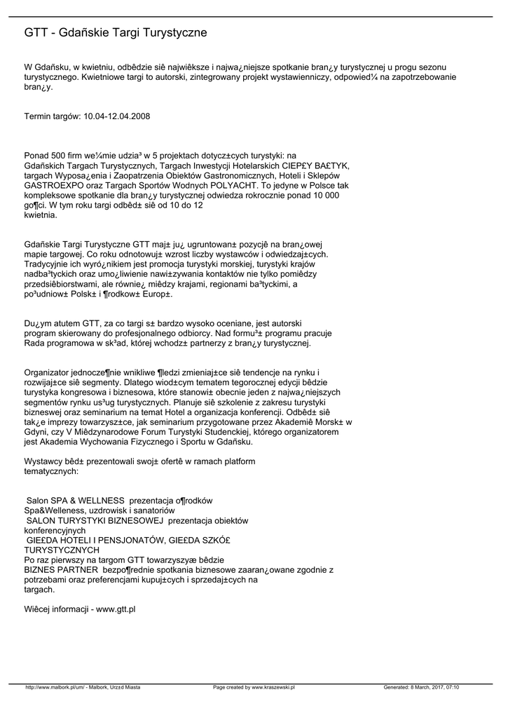 GTT - Gdañskie Targi Turystyczne W Gdañsku, w kwietniu, odbêdzie siê najwiêksze i najwa¿niejsze spotkanie bran¿y turystycznej u progu sezonu turystycznego. Kwietniowe targi to autorski, zintegrowany projekt wystawienniczy, odpowied¼ na zapotrzebowanie bran¿y. Termin targów: 10.04-12.04.2008 Ponad 500 firm we¼mie udzia³ w 5 projektach dotycz±cych turystyki: na Gdañskich Targach Turystycznych, Targach Inwestycji Hotelarskich CIEP£Y BA£TYK, targach Wyposa¿enia i Zaopatrzenia Obiektów Gastronomicznych, Hoteli i Sklepów GASTROEXPO oraz Targach Sportów Wodnych POLYACHT. To jedyne w Polsce tak kompleksowe spotkanie dla bran¿y turystycznej odwiedza rokrocznie ponad 10 000 go¶ci. W tym roku targi odbêd± siê od 10 do 12 kwietnia. Gdañskie Targi Turystyczne GTT maj± ju¿ ugruntowan± pozycjê na bran¿owej mapie targowej. Co roku odnotowuj± wzrost liczby wystawców i odwiedzaj±cych. Tradycyjnie ich wyró¿nikiem jest promocja turystyki morskiej, turystyki krajów nadba³tyckich oraz umo¿liwienie nawi±zywania kontaktów nie tylko pomiêdzy przedsiêbiorstwami, ale równie¿ miêdzy krajami, regionami ba³tyckimi, a po³udniow± Polsk± i ¶rodkow± Europ±. Du¿ym atutem GTT, za co targi s± bardzo wysoko oceniane, jest autorski program skierowany do profesjonalnego odbiorcy. Nad formu³± programu pracuje Rada programowa w sk³ad, której wchodz± partnerzy z bran¿y turystycznej. Organizator jednocze¶nie wnikliwe ¶ledzi zmieniaj±ce siê tendencje na rynku i rozwijaj±ce siê segmenty. Dlatego wiod±cym tematem tegorocznej edycji bêdzie turystyka kongresowa i biznesowa, które stanowi± obecnie jeden z najwa¿niejszych segmentów rynku us³ug turystycznych. Planuje siê szkolenie z zakresu turystyki bizneswej oraz seminarium na temat Hotel a organizacja konferencji. Odbêd± siê tak¿e imprezy towarzysz±ce, jak seminarium przygotowane przez Akademiê Morsk± w Gdyni, czy V Miêdzynarodowe Forum Turystyki Studenckiej, którego organizatorem jest Akademia Wychowania Fizycznego i Sportu w Gdañsku. Wystawcy bêd± prezentowali swoj± ofertê w ramach platform tematycznych: Salon SPA & WELLNESS prezentacja o¶rodków Spa&Welleness, uzdrowisk i sanatoriów SALON TURYSTYKI BIZNESOWEJ prezentacja obiektów konferencyjnych GIE£DA HOTELI I PENSJONATÓW, GIE£DA SZKÓ£ TURYSTYCZNYCH Po raz pierwszy na targom GTT towarzyszyæ bêdzie BIZNES PARTNER bezpo¶rednie spotkania biznesowe zaaran¿owane zgodnie z potrzebami oraz preferencjami kupuj±cych i sprzedaj±cych na targach. Wiêcej informacji - www.gtt.pl http://www.malbork.pl/um/ - Malbork, Urz±d Miasta Page created by www.kraszewski.pl Generated: 8 March, 2017, 07:10