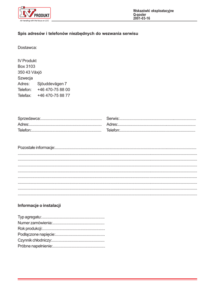 Wskazówki eksploatacyjne Q-qooler 2001-03-16 Spis adresów i telefonów niezbêdnych do wezwania serwisu Dostawca: IV Produkt Box 3103 350 43 Växjö Szwecja Adres: Sjöuddevägen 7 Telefon: +46 470-75 88 00 Telefax: +46 470-75 88 77 Sprzedawca:.......................................................... Adres:..................................................................... Telefon:................................................................... Serwis:......................................................................... Adres:.......................................................................... Telefon:........................................................................ Pozosta³e informacje:...................................................................................................................................... ............................................................................................................................................................................ ............................................................................................................................................................................ ............................................................................................................................................................................ ............................................................................................................................................................................ ............................................................................................................................................................................. ............................................................................................................................................................................ ............................................................................................................................................................................ ............................................................................................................................................................................ Informacje o instalacji Typ agregatu:............................................................ Numer zamówienia:................................................. Rok produkcji:........................................................... Pod³¹czone napiêcie:.............................................. Czynnik ch³odniczy:.................................................. Próbne nape³nienie:................................................. Wskazówki eksploatacyjne Q-Cooler 2001-03-16 Spis treci 1. Uk³ad pompy ciep³a i instalacja ch³odnicza 1.1 Informacje ogólne 1.2 Obwód ch³odniczy - opis dzia³ania 1.3 Automatyka - opis dzia³ania 2. Instrukcje eksploatacji 2.1 Zalecenia odnonie uruchomienia 2.2 Procedura uruchomienia 3. Procedury i instrukcje konserwacji 3.1 Informacje ogólne 3.2 Wymagania urzêdowe zgodne z przepisami o czynnikach ch³odniczych 3.3 Kontrola okresowa 4. Poszukiwanie usterek i przecieków 4.1 Schemat poszukiwania usterek 4.2 Poszukiwanie przecieków 5. Schematy przep³ywu czynnika ch³odniczego 6. Specyfikacja techniczna EQU Wskazówki eksploatacyjne Q-qooler 2001-03-16 Uk³ad pompy ciep³a i instalacja ch³odnicza 1.1 Informacje ogólne Wszystkie instalacje ch³odnicze i uk³ady pompy ciep³a dzia³aj¹ wed³ug tej samej zasady. Instalacja przenosi ciep³o zawarte w mediach takich jak powietrze, woda, gaz itp. z jednego miejsca, w którym ciep³o jest niepotrzebne lub niepo¿¹dane do miejsca, gdzie je mo¿na wykorzystaæ lub pozbyæ siê go. Wasza instalacja zosta³a skonstruowana i wykonana w taki sposób, by spe³niæ podane wymagania. Spe³nienie tych wymagañ, przy zachowaniu optymalnego bezpieczeñstwa i jak najni¿szych ca³kowitych kosztów eksploatacji, jest mo¿liwe dziêki dobraniu i po³¹czeniu specjalnych komponentów. Instalacja zosta³a skonstruowana na bazie pewnych podstawowych warunków, które musz¹ zostaæ spe³nione, aby instalacja mog³a dzia³aæ. Warunków tych nie mo¿na zmieniaæ bez uprzedniego sprawdzenia czy nie wp³ynie to negatywnie na dzia³anie ca³ej instalacji. 1.2 Obwód ch³odniczy - opis dzia³ania Patrz schemat przep³ywu (rozdzia³ 5). Czynnik ch³odniczy w obwodzie ch³odniczym, za porednictwem parownika, odbiera ciep³o od sch³adzanego obiektu. Czynnik ch³odniczy ulega odparowaniu i na skutek spadku cinienia przechodzi ze stanu ciek³ego w gazowy. Zimny gaz, który odebra³ ciep³o ze sch³odzonego pomieszczenia/medium jest ponownie zasysany do sprê¿arki, gdzie ulega sprê¿eniu, a tym samym ogrzaniu. We wszystkich ca³kowicie hermetycznych sprê¿arkach gaz ss¹cy stosowany jest tak¿e do ch³odzenia silników elektrycznych. Czynnik ch³odniczy zawiera wtedy zarówno ciep³o ze sch³odzonego obiektu jaki i ciep³o silnika sprê¿arki oraz ciep³o powsta³e w wyniku sprê¿ania. Czynnik ch³odniczy w postaci gor¹cego gazu przet³aczany jest ze sprê¿arki do skraplacza, w którym oddaje ciep³o. 1.3 Automatyka - opis dzia³ania 1.3.1 EQU 1.3.1.1 Synchronizacja Sprê¿arki s¹ zsynchronizowane z wentylatorem nawiewu i wentylatorem wywiewu. W przypadku, gdy wentylator zatrzyma siê, sprê¿arki wy³¹czaj¹ siê. 1.3.1.2 Praca w trybie grzania W przypadku narastaj¹cego sygna³u grzewczego, za porednictwem karty steruj¹cej sprê¿arek (KSK), uruchamiane s¹ sprê¿arki. W przypadku malej¹cego sygna³u grzewczego sprê¿arki s¹ zatrzymywane. Praca ka¿dej sprê¿arki sygnalizowana jest za pomoc¹ zielonej diody. Wskazówki eksploatacyjne Q-Cooler 2001-03-16 1.3.1.3. Praca w trybie ch³odzenia W przypadku narastaj¹cego sygan³u ch³odniczego prze³¹czaj¹ siê zawory zmiany kierunku przep³ywu, a sprê¿arki s¹ uruchamiane za porednictwem karty steruj¹cej sprê¿arek (KSK). W przypadku malej¹cego sygna