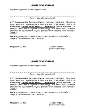 KUMITE SEMI KONTAKT Wyrażam zgodę na start mojego dziecka ………………………….………………………………………………………… (imię i nazwisko zawodnika) w VI Ogólnopolskim Festiwalu Karate Kyokushin dla Dzieci i Młodzieży sport, edukacja, wychowanie w Broku w dniu 2 Grudzień 2012 r. w konkurencji kumite semi kontakt kyokushin (walka sportowa z pełnym kontaktem z użyciem ochraniaczy) i nie będę rościł żadnych pretensji do organizatora z tytułu poniesionych podczas walk kontuzji i urazów. Wyrażam zgodę na przejazd samochodem prywatnym opiekunów na miejsce Turnieju i w drodze powrotnej. Miejscowość, data podpis rodzica (opiekuna prawnego) KUMITE SEMI KONTAKT Wyrażam zgodę na start mojego dziecka ………………………….………………………………………………………… (imię i nazwisko zawodnika) w VI Ogólnopolskim Festiwalu Karate Kyokushin dla Dzieci i Młodzieży sport, edukacja, wychowanie w Broku w dniu 2 Grudzień 2012 r. w konkurencji kumite semi kontakt kyokushin (walka sportowa z pełnym kontaktem z użyciem ochraniaczy) i nie będę rościł żadnych pretensji do organizatora z tytułu poniesionych podczas walk kontuzji i urazów. Wyrażam zgodę na przejazd samochodem prywatnym opiekunów na miejsce Turnieju i w drodze powrotnej. Miejscowość, data podpis rodzica (opiekuna prawnego)