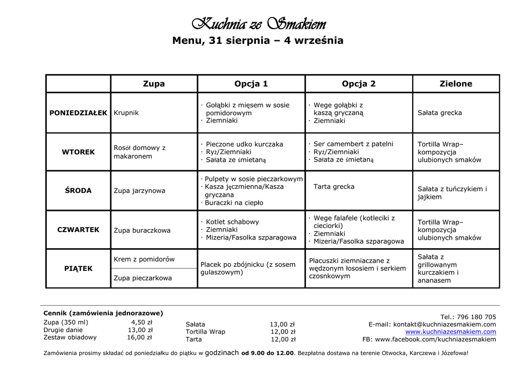 Kuchnia ze Smakiem Menu, 31 sierpnia – 4 września Zupa ŚRODA CZWARTEK Opcja 2 Wege gołąbki z kaszą gryczaną Ziemniaki Sałata grecka Rosół domowy z makaronem Pieczone udko kurczaka Ryż/Ziemniaki Sałata ze śmietaną Ser camembert z patelni Ryż/Ziemniaki Sałata ze śmietaną Tortilla Wrap– kompozycja ulubionych smaków Zupa jarzynowa Pulpety w sosie pieczarkowym Kasza jęczmienna/Kasza gryczana Buraczki na ciepło Zupa buraczkowa Kotlet schabowy Ziemniaki Mizeria/Fasolka szparagowa Wege falafele (kotleciki z cieciorki) Ziemniaki Mizeria/Fasolka szparagowa Tortilla Wrap– kompozycja ulubionych smaków Placek po zbójnicku (z sosem gulaszowym) Placuszki ziemniaczane z wędzonym łososiem i serkiem czosnkowym Sałata z grillowanym kurczakiem i ananasem Krem z pomidorów PIĄTEK Zupa pieczarkowa Cennik (zamówienia jednorazowe) Zupa (350 ml) Drugie danie Zestaw obiadowy Zielone Gołąbki z mięsem w sosie pomidorowym Ziemniaki PONIEDZIAŁEK Krupnik WTOREK Opcja 1 4,50 zł 13,00 zł 16,00 zł Sałata Tortilla Wrap Tarta Zamówienia prosimy składać od poniedziałku do piątku w 13,00 zł 12,00 zł 12,00 zł Tarta grecka Sałata z tuńczykiem i jajkiem Tel.: 796 180 705 E-mail: [email protected] www.kuchniazesmakiem.com FB: www.facebook.com/kuchniazesmakiem godzinach od 9.00 do 12.00. Bezpłatna dostawa na terenie Otwocka, Karczewa i Józefowa! Kuchnia ze Smakiem Menu, 31 sierpnia – 4 września Zupa ŚRODA CZWARTEK Opcja 2 Wege gołąbki z kaszą gryczaną Ziemniaki Sałata grecka Rosół domowy z makaronem Pieczone udko kurczaka Ryż/Ziemniaki Sałata ze śmietaną Ser camembert z patelni Ryż/Ziemniaki Sałata ze śmietaną Tortilla Wrap– kompozycja ulubionych smaków Zupa jarzynowa Pulpety w sosie pieczarkowym Kasza jęczmienna/Kasza gryczana Buraczki na ciepło Zupa buraczkowa Kotlet schabowy Ziemniaki Mizeria/Fasolka szparagowa Wege falafele (kotleciki z cieciorki) Ziemniaki Mizeria/Fasolka szparagowa Tortilla Wrap– kompozycja ulubionych smaków Placek po zbójnicku (z sosem gulaszowym) Placuszki ziemniaczane z wędzonym łososiem i serkiem czosnkowym Sałata z grillowanym kurczakiem i ananasem Krem z pomidorów PIĄTEK Zupa pieczarkowa Cennik (zamówienia jednorazowe) Zupa (350 ml) Drugie danie Zestaw obiadowy Zielone Gołąbki z mięsem w sosie pomidorowym Ziemniaki PONIEDZIAŁEK Krupnik WTOREK Opcja 1 4,50 zł 13,00 zł 16,00 zł Sałata Tortilla Wrap Tarta Zamówienia prosimy składać od poniedziałku do piątku w 13,00 zł 12,00 zł 12,00 zł Tarta grecka Sałata z tuńczykiem i jajkiem Tel.: 796 180 705 E-mail: [email protected] www.kuchniazesmakiem.com FB: www.facebook.com/kuchniazesmakiem godzinach od 9.00 do 12.00. Bezpłatna dostawa na terenie Otwocka, Karczewa i Józefowa!