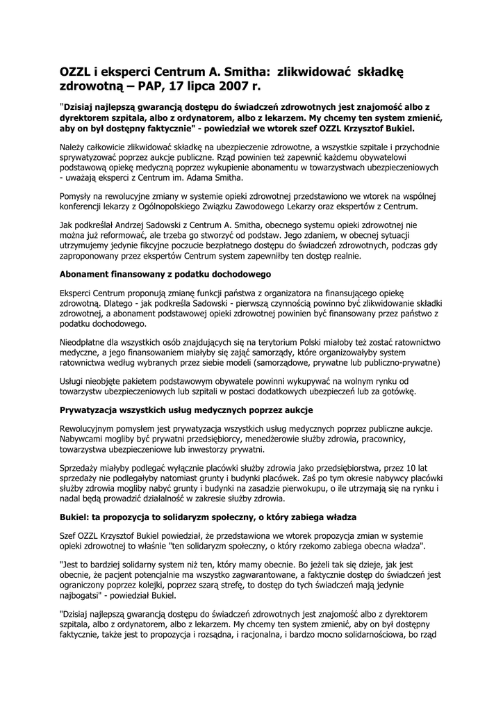 OZZL i eksperci Centrum A. Smitha: zlikwidować składkę zdrowotną – PAP, 17 lipca 2007 r. "Dzisiaj najlepszą gwarancją dostępu do świadczeń zdrowotnych jest znajomość albo z dyrektorem szpitala, albo z ordynatorem, albo z lekarzem. My chcemy ten system zmienić, aby on był dostępny faktycznie" - powiedział we wtorek szef OZZL Krzysztof Bukiel. NaleŜy całkowicie zlikwidować składkę na ubezpieczenie zdrowotne, a wszystkie szpitale i przychodnie sprywatyzować poprzez aukcje publiczne. Rząd powinien teŜ zapewnić kaŜdemu obywatelowi podstawową opiekę medyczną poprzez wykupienie abonamentu w towarzystwach ubezpieczeniowych - uwaŜają eksperci z Centrum im. Adama Smitha. Pomysły na rewolucyjne zmiany w systemie opieki zdrowotnej przedstawiono we wtorek na wspólnej konferencji lekarzy z Ogólnopolskiego Związku Zawodowego Lekarzy oraz ekspertów z Centrum. Jak podkreślał Andrzej Sadowski z Centrum A. Smitha, obecnego systemu opieki zdrowotnej nie moŜna juŜ reformować, ale trzeba go stworzyć od podstaw. Jego zdaniem, w obecnej sytuacji utrzymujemy jedynie fikcyjne poczucie bezpłatnego dostępu do świadczeń zdrowotnych, podczas gdy zaproponowany przez ekspertów Centrum system zapewniłby ten dostęp realnie. Abonament finansowany z podatku dochodowego Eksperci Centrum proponują zmianę funkcji państwa z organizatora na finansującego opiekę zdrowotną. Dlatego - jak podkreśla Sadowski - pierwszą czynnością powinno być zlikwidowanie składki zdrowotnej, a abonament podstawowej opieki zdrowotnej powinien być finansowany przez państwo z podatku dochodowego. Nieodpłatne dla wszystkich osób znajdujących się na terytorium Polski miałoby teŜ zostać ratownictwo medyczne, a jego finansowaniem miałyby się zająć samorządy, które organizowałyby system ratownictwa według wybranych przez siebie modeli (samorządowe, prywatne lub publiczno-prywatne) Usługi nieobjęte pakietem podstawowym obywatele powinni wykupywać na wolnym rynku od towarzystw ubezpieczeniowych lub szpitali w postaci dodatkowych ubezpieczeń lub za gotówkę. Prywatyzacja wszystkich usług medycznych poprzez aukcje Rewolucyjnym pomysłem jest prywatyzacja wszystkich usług medycznych poprzez publiczne aukcje. Nabywcami mogliby być prywatni przedsiębiorcy, menedŜerowie słuŜby zdrowia, pracownicy, towarzystwa ubezpieczeniowe lub inwestorzy prywatni. SprzedaŜy miałyby podlegać wyłącznie placówki słuŜby zdrowia jako przedsiębiorstwa, przez 10 lat sprzedaŜy nie podlegałyby natomiast grunty i budynki placówek. Zaś po tym okresie nabywcy placówki słuŜby zdrowia mogliby nabyć grunty i budynki na zasadzie pierwokupu, o ile utrzymają się na rynku i nadal będą prowadzić działalność w zakresie słuŜby zdrowia. Bukiel: ta propozycja to solidaryzm społeczny, o który zabiega władza Szef OZZL Krzysztof Bukiel powiedział, Ŝe przedstawiona we wtorek propozycja zmian w systemie opieki zdrowotnej to właśnie "ten solidaryzm społeczny, o który rzekomo zabiega obecna władza". "Jest to bardziej solidarny system niŜ ten, który mamy obecnie. Bo jeŜeli tak się dzieje, jak jest obecnie, Ŝe pacjent potencjalnie ma wszystko zagwarantowane, a faktycznie dostęp do świadczeń jest ograniczony poprzez kolejki, poprzez szarą strefę, to dostęp do tych świadczeń mają jedynie najbogatsi" - powiedział Bukiel. "Dzisiaj najlepszą gwarancją dostępu do świadczeń zdrowotnych jest znajomość albo z dyrektorem szpitala, albo z ordynatorem, albo z lekarzem. My chcemy ten system zmienić, aby on był dostępny faktycznie, takŜe jest to propozycja i rozsądna, i racjonalna, i bardzo mocno solidarnościowa, bo rząd czy władze publiczne gwarantują tutaj dla wszystkich obywateli pewien zakres świadczeń dostępnych wprost z podatków" - dodał. Religa: zwiększyć składkę zdrowotną do 13 proc. Obecnie głównym źródłem finansowania systemu jest ubezpieczenie zdrowotne. Obywatele obciąŜeni są obowiązkową składką ubezpieczeniową w wysokości 9 proc. dochodów, która odprowadzana jest do Narodowego Funduszu Zdrowia. Niektóre świadczenia wysokospecjalistyczne finansowane są bezpośrednio z budŜetu Ministerstwa Zdrowia, dodatkowo z budŜetu państwa finansowane jest równieŜ ratownictwo medyczne. Minister zdrowia Zbigniew Religa postuluje wzrost składki na ubezpieczenie zdrowotne. Jego zdaniem, składka powinna wzrastać co pół roku lub co rok o ok. 0,5 proc. aŜ do osiągnięcia poziomu 13 proc. Jednocześnie składkę moŜna byłoby odliczać od podatku. Według Religi jest to jedyny sposób, by w ciągu kilku lat podnieść kwotę wydatków na słuŜbę zdrowia do poziomu 6 proc. PKB, postulowanego przez strajkujących lekarzy i pielęgniarki. Pomysłu nie popiera premier Jarosław Kaczyński, ale Religa zapowiada, Ŝe na jesieni "stoczy wielką bitwę" "o podwyŜszenie składki zdrowotnej jako najlepszej, najbardziej skutecznej drogi wzrostu napływu pieniędzy na opiekę zdrowotną. Wszystkie inne drogi nie rozwiązują problemu" - uwaŜa Religa. Zaznaczył, Ŝe jeśli ten bój przegra, moŜe podać się do dymisji. Źródło: PAP