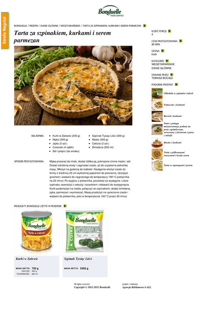 BONDUELLE / PRZEPIS / DANIE GŁÓWNE / WEGETARIAŃSKIE / TARTA ZA SZPINAKIEM, KURKAMI I SEREM PARMEZAN Tarta za szpinakiem, kurkami i serem parmezan ILOŚĆ PORCJI 4 CZAS PRZYGOTOWANIA 90 MIN OCENA brak KATEGORIE WEGETARIAŃSKIE DANIE GŁÓWNE DODANE PRZEZ TOMASZ BOCIĄG PODOBNE PRZEPISY Chłodnik ze szpinaku i rukoli Fettuccine z kurkami Ravioli z kurkami SKŁADNIKI: SPOSÓB PRZYGOTOWANIA: Kurki w Zalewie (200 g) Mąka (200 g) Jajka (2 szt.) Czosnek (4 ząbki) Sól i pieprz (do smaku) Szpinak Tysiąc Liści (200 g) Masło (200 g) Cebula (2 szt.) Śmietana (200 ml) Tatar z pstrąga marynowanego podany na pesto szpinakowym, serwowany z kawiorem i puree z salsefii Risotto z kurkami Tarta z grillowanymi warzywami i kozim serem Mąkę przesiać do miski, dodać żółtka jaj, pokrojone zimne masło i sól. Dodać odrobinę wody i zagniatać ciasto, aż do uzyskania jednolitej masy. Włożyć na godzinę do lodówki. Następnie włożyć ciasto do formy o średnicy 25 cm wyłożonej papierem do pieczenia, obciążyć grochem i wstawić do nagrzanego do temperatury 190°C piekarnika na 20 minut. Po wyjęciu z piekarnika, poczekać aż wystygnie. Liście szpinaku zasmażyć z cebulą i czosnkiem i odstawić do wystygnięcia. Kurki podsmażyć na maśle, połączyć ze szpinakiem, dodać śmietanę, jajka, parmezan i wymieszać. Masę przełożyć na upieczone ciasto i wstawić do piekarnika, piec w temperaturze 160°C przez 30 minut. PRODUKTY BONDUELLE UŻYTE W PRZEPISIE Kurki w Zalewie Szpinak Tysiąc Liści MASA NETTO: 720 g ODCIEK: 400 g POJEMNOŚĆ: 850 ml MASA NETTO: 2500 g All rights reserved projekt i realizacja Copyright © 2012-2015 Bonduelle Agencja Reklamowa 4 ALL Tarta ze szparagami i porem